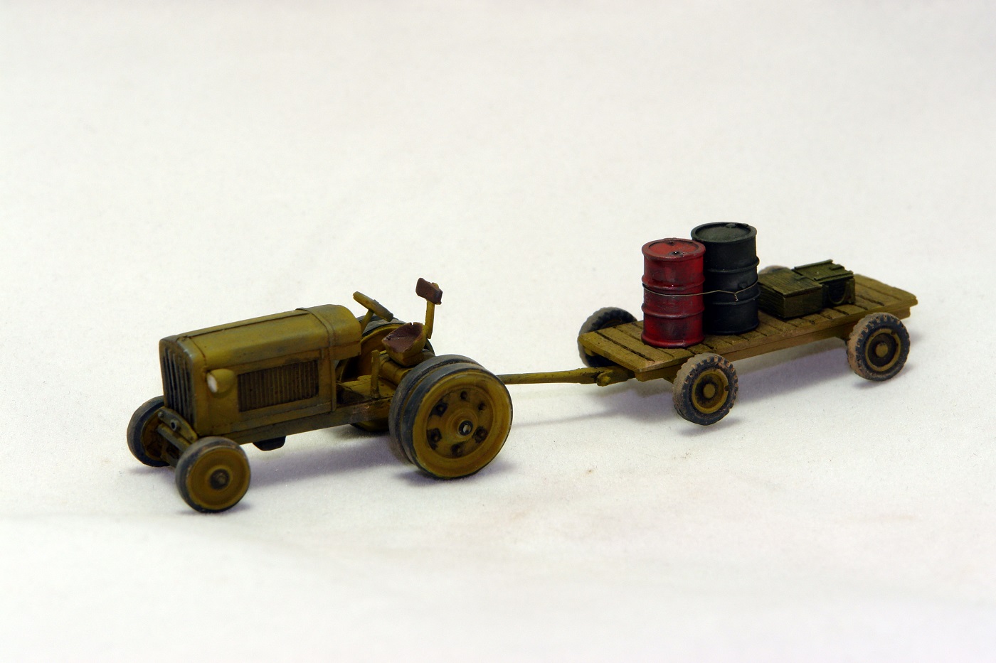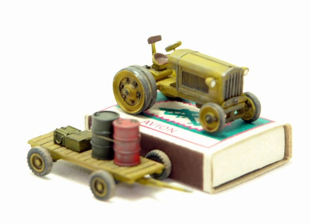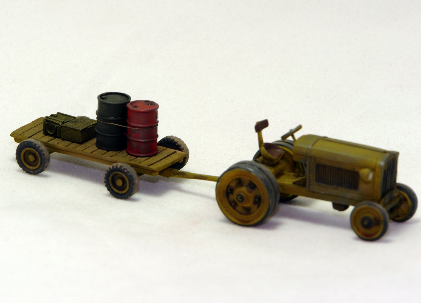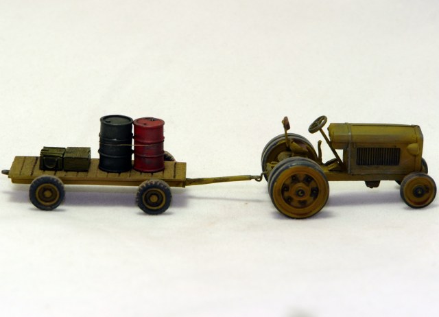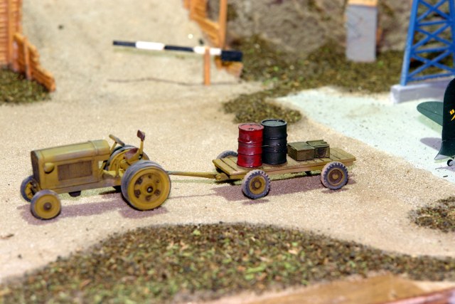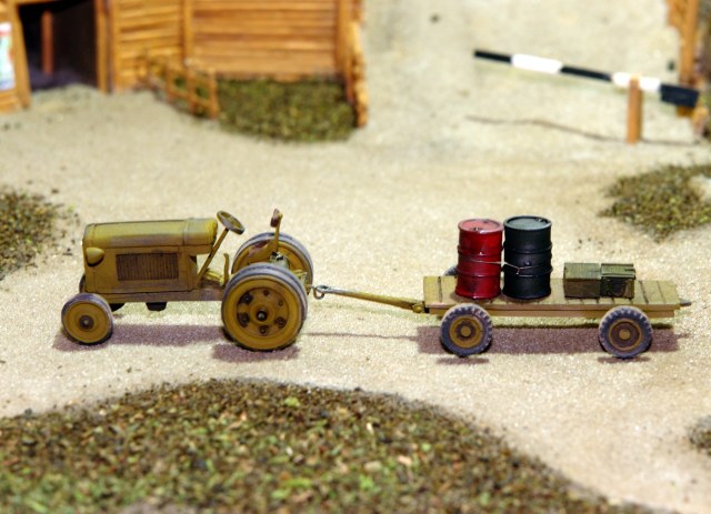 Очень понравился тракторишко. Хорошо смотрится и отдельно и в диораме. Вот только у тележки левое переднее колесо предательски висит.
