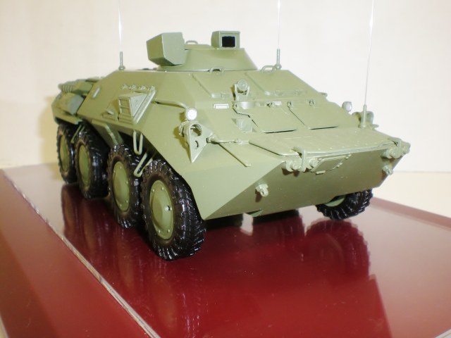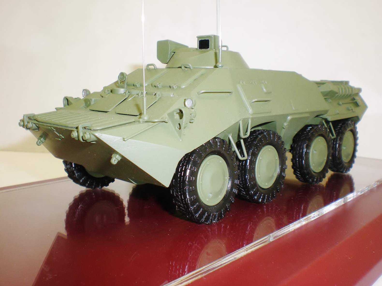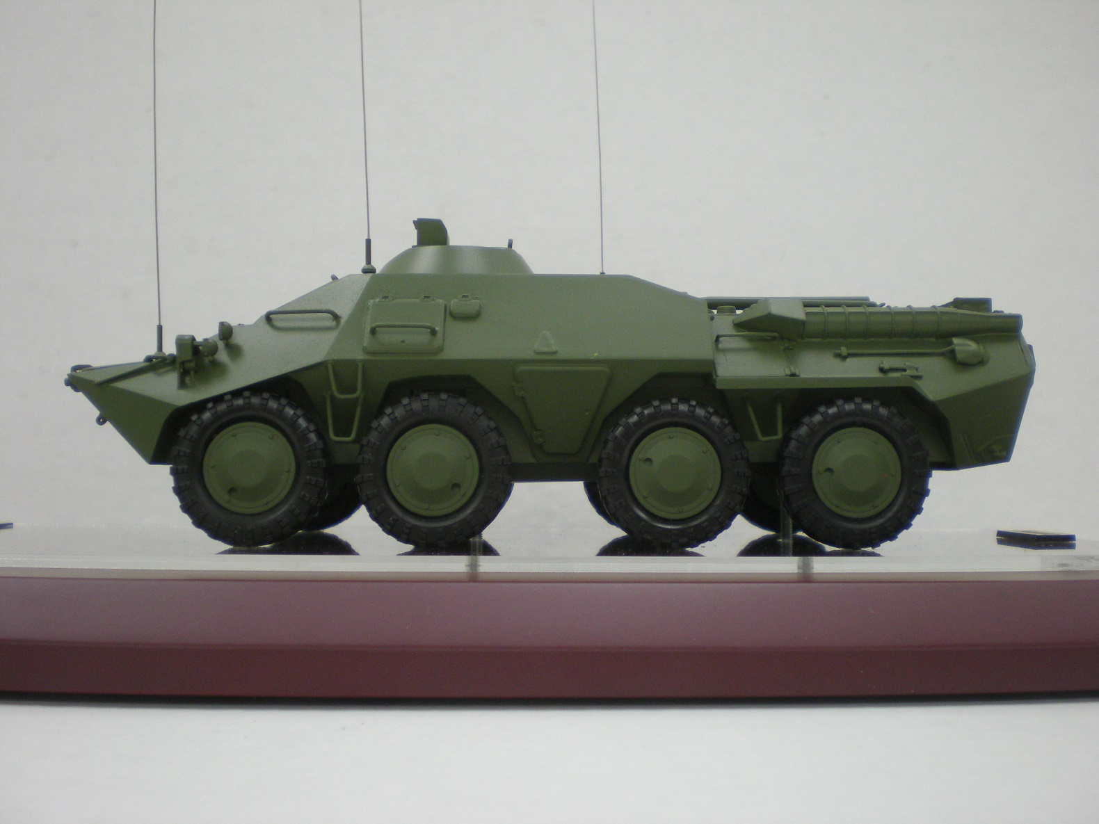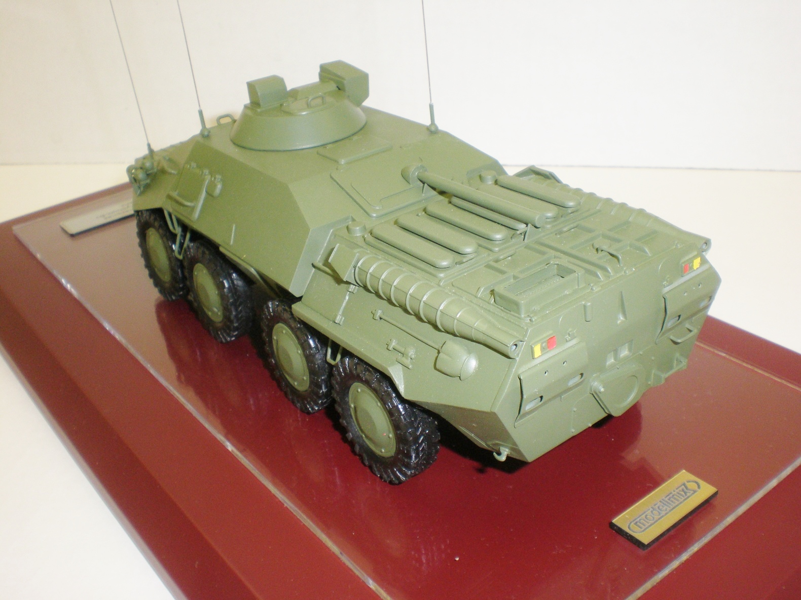 О модели. Основа - тот же БТР-80 от Звезды; толстая как у головастика морда нарезана из оргстекла лазером и выклеена метиленом. Условие заказчика - БЕЗ визуальных эффектов. Матчасть собрана моим коллегой Игорем Демидовым и окрашена мной.
