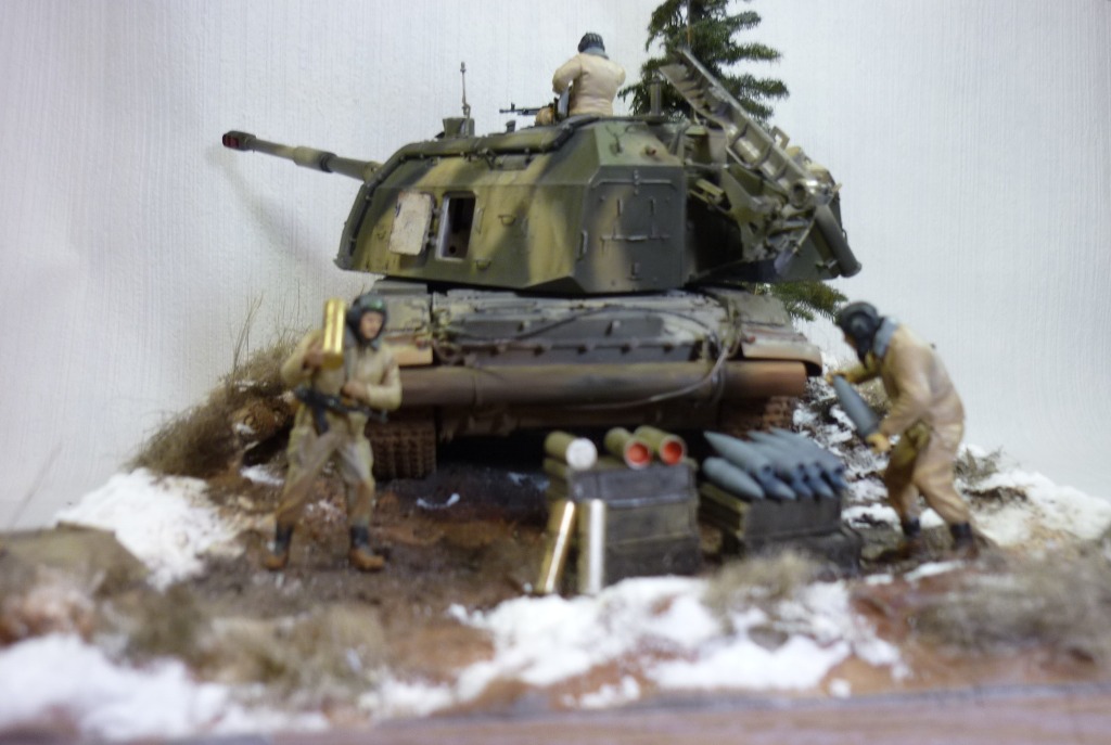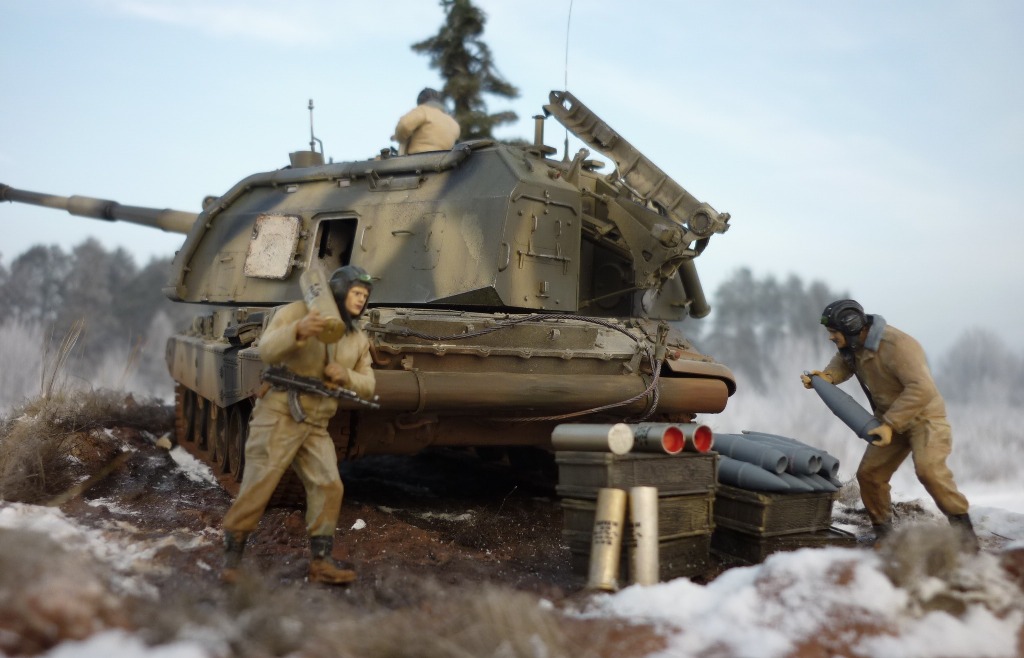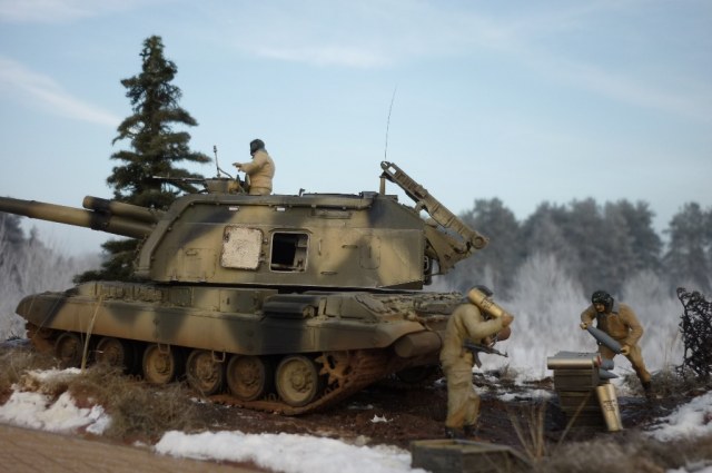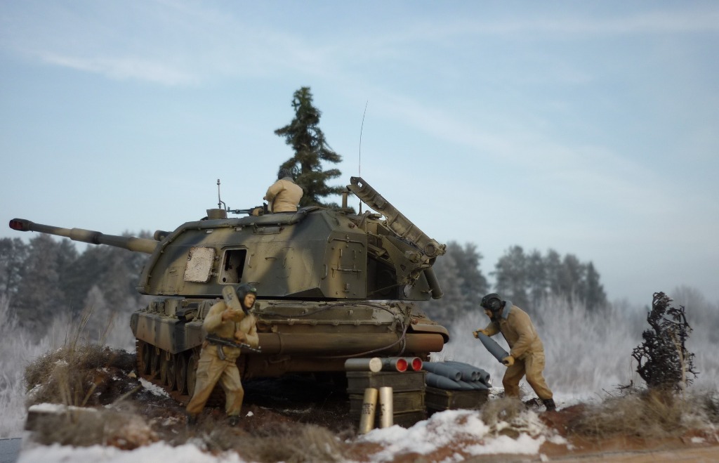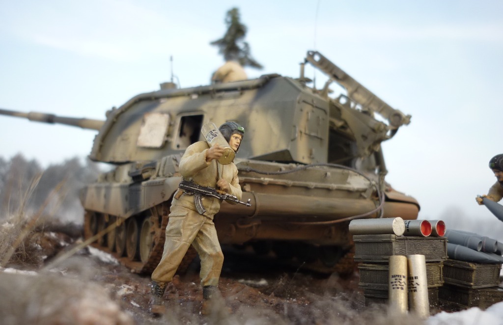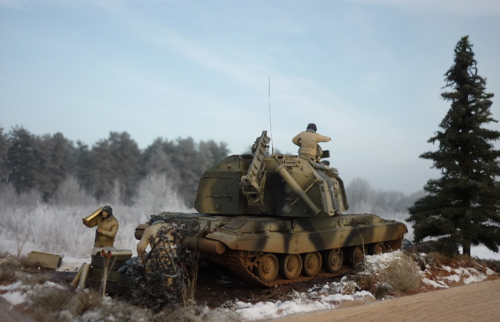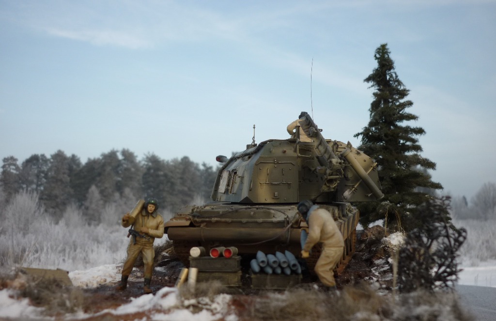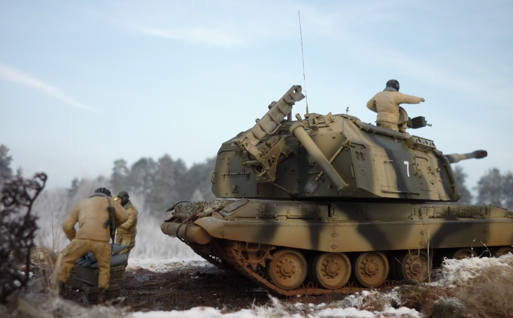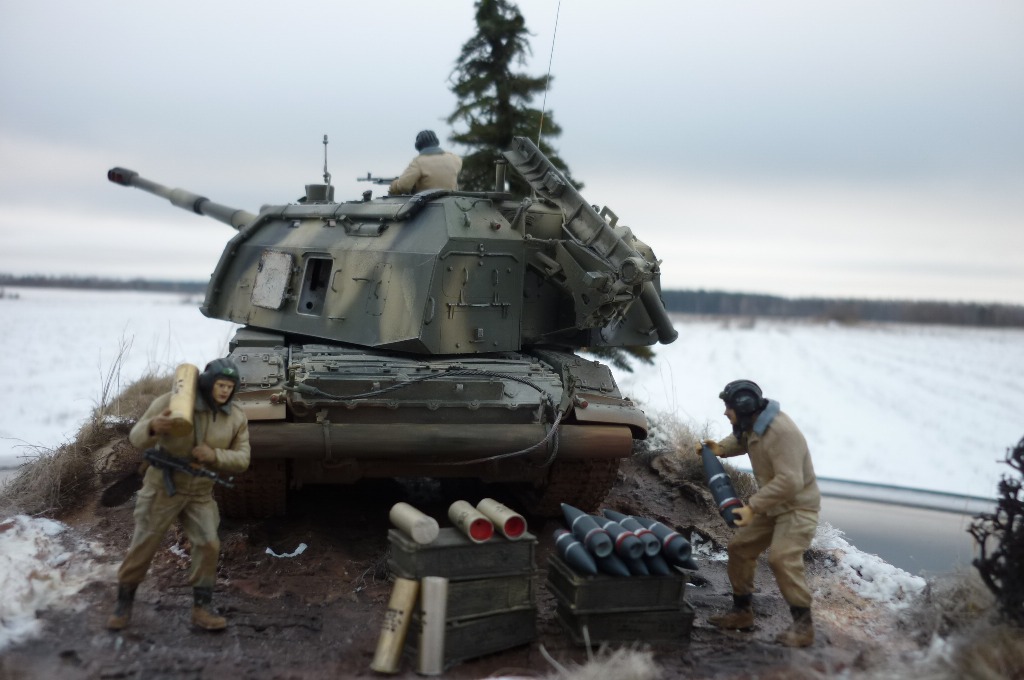 Доброе время суток! Доделал диораму, и спешу поделится с вами коллеги по цеху! Как всегда сделал сперва одну мсту! но на полке она стояла как то скучновато без экипажа, пришлось сконструировать все остальное, ну,а как получилось судить вам! Про мсту скажу собиралась не очень легко(очень много мелочи) почти полностью коробочный вариант, добавил только триплексы и немного внутреннего интерьера,бойцам поменя геометрию рук,красил как всегда тамия. Приятного просмотра!!!