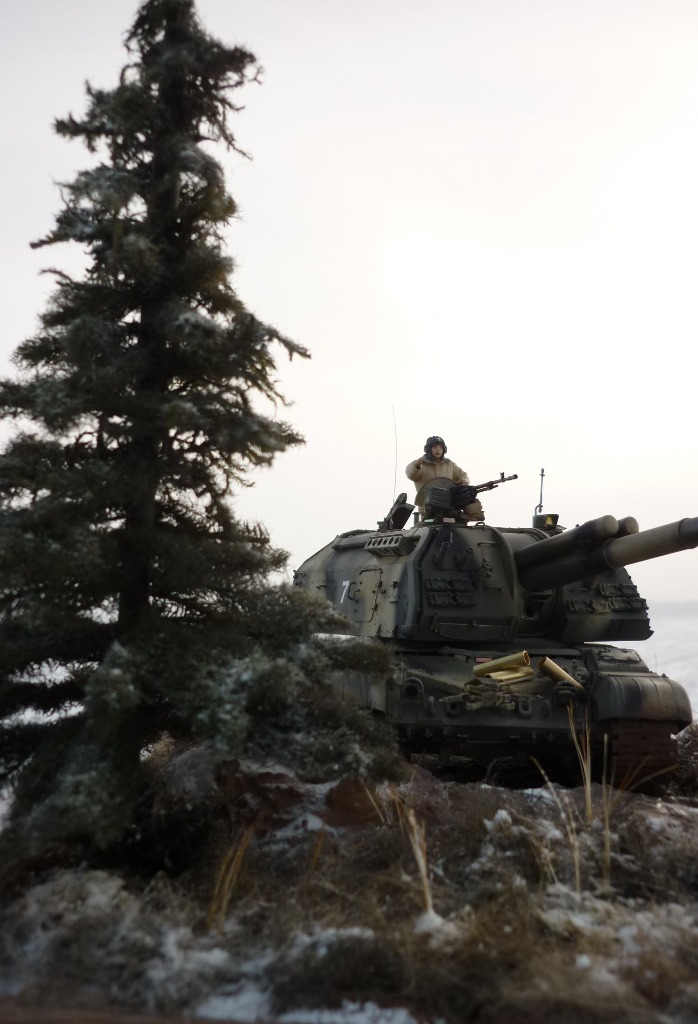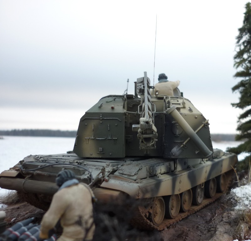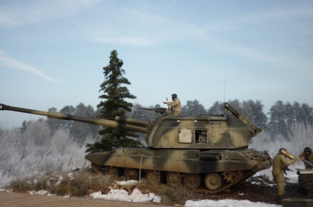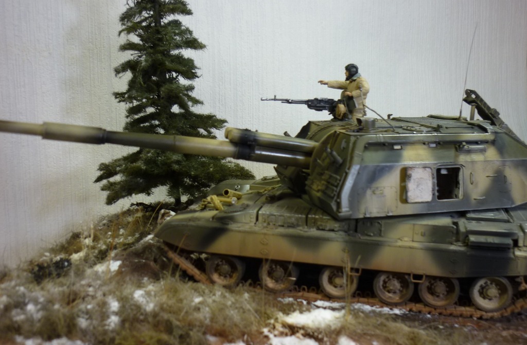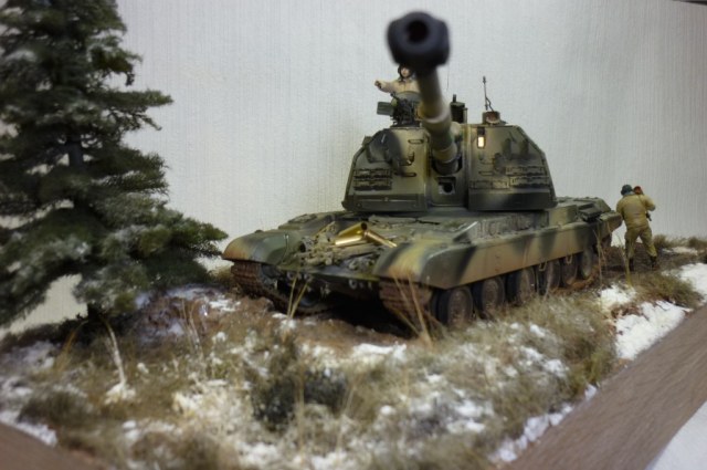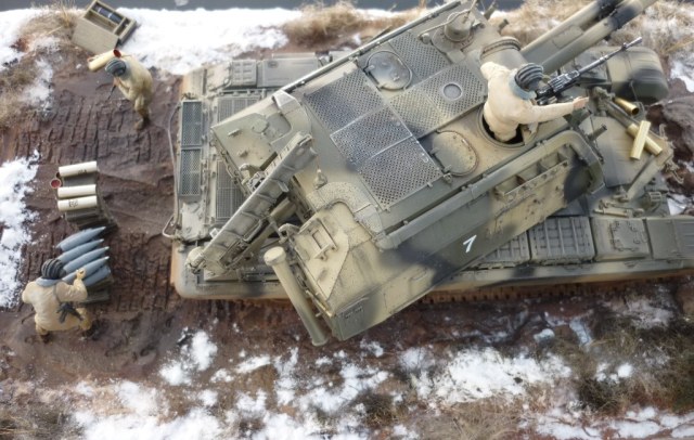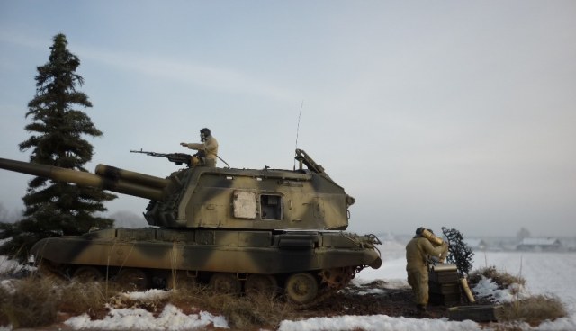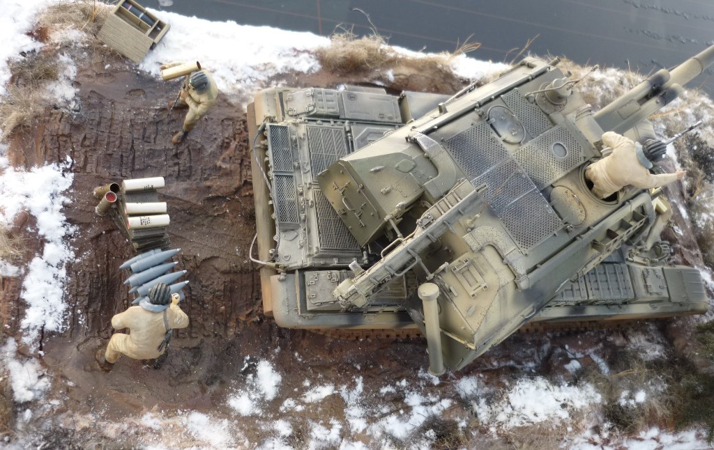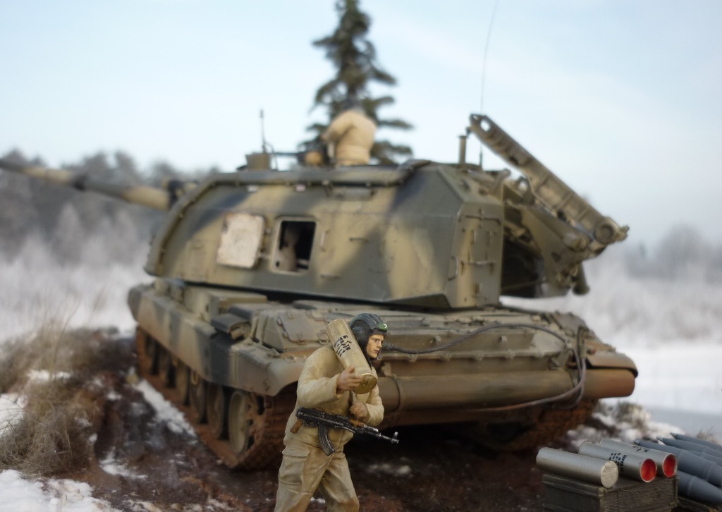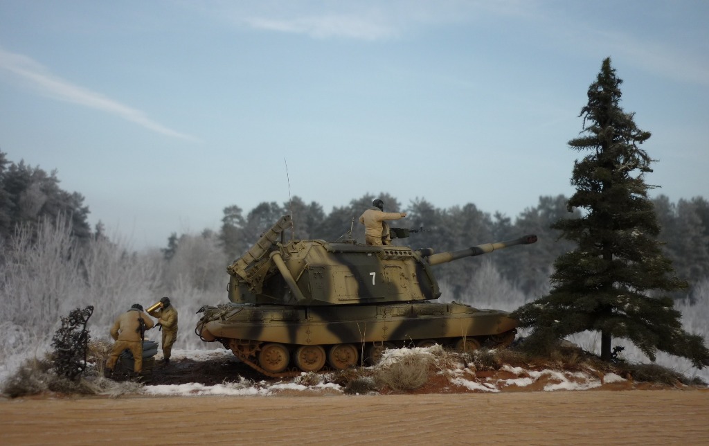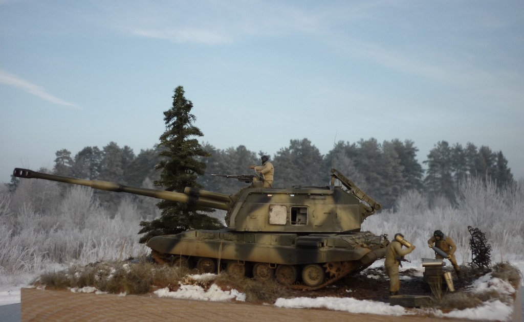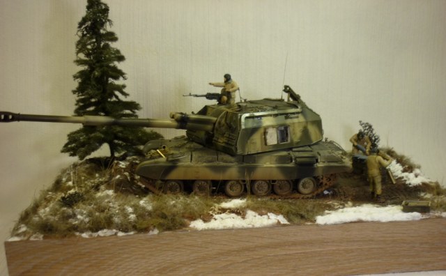 Доброе время суток! Доделал диораму, и спешу поделится с вами коллеги по цеху! Как всегда сделал сперва одну мсту! но на полке она стояла как то скучновато без экипажа, пришлось сконструировать все остальное, ну,а как получилось судить вам! Про мсту скажу собиралась не очень легко(очень много мелочи) почти полностью коробочный вариант, добавил только триплексы и немного внутреннего интерьера,бойцам поменя геометрию рук,красил как всегда тамия. Приятного просмотра!!!