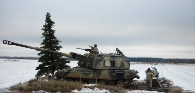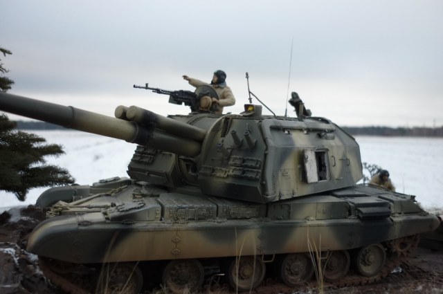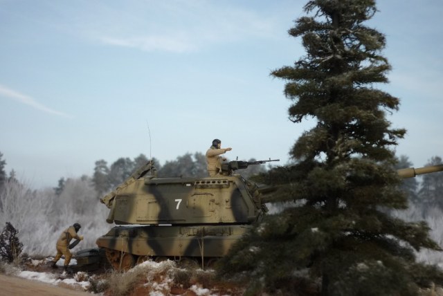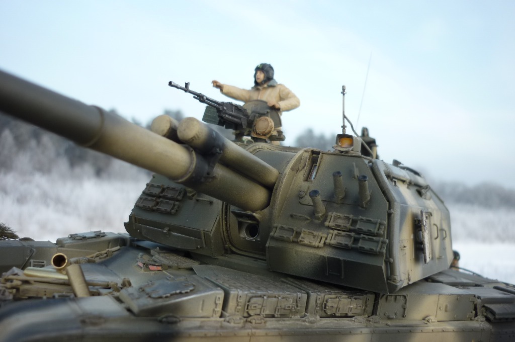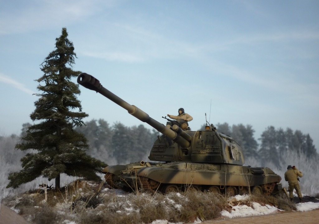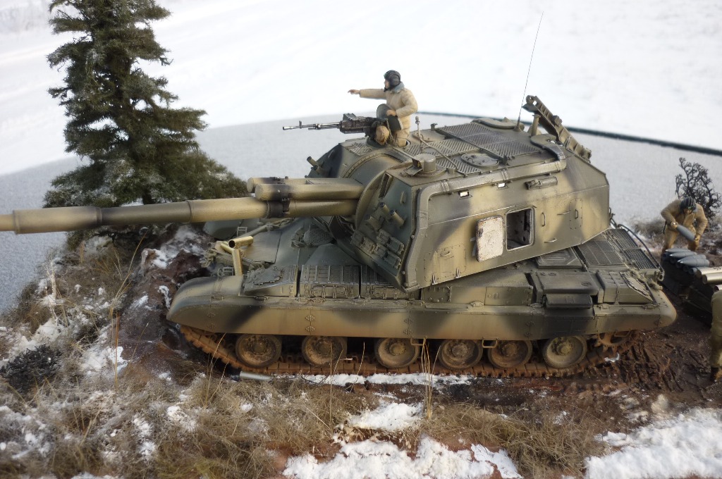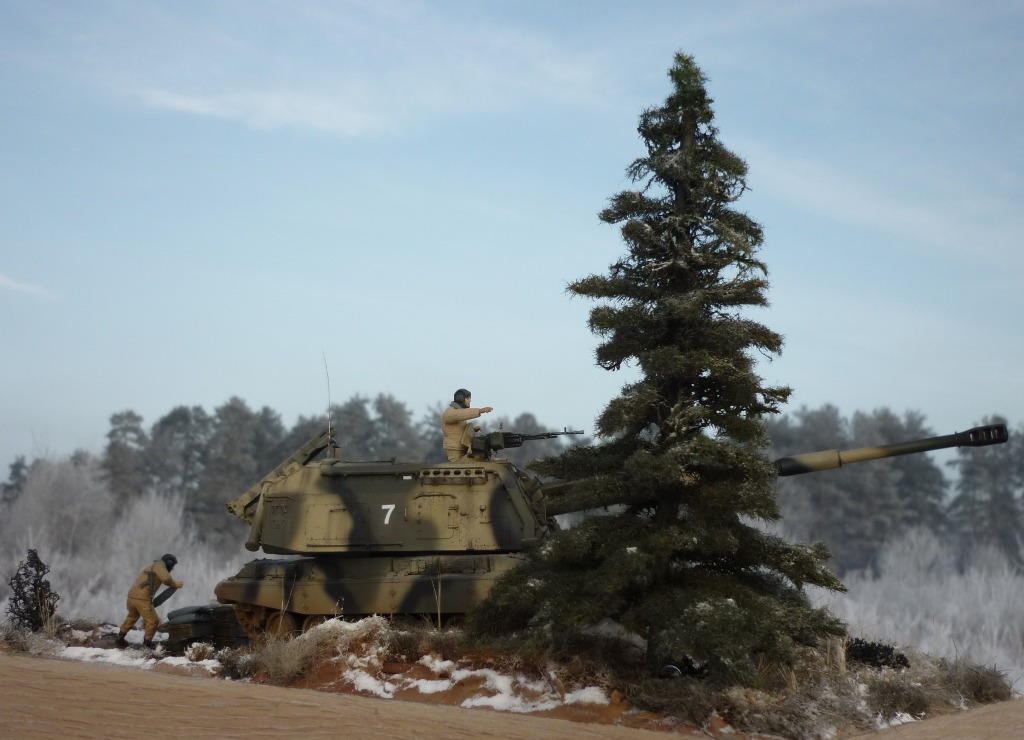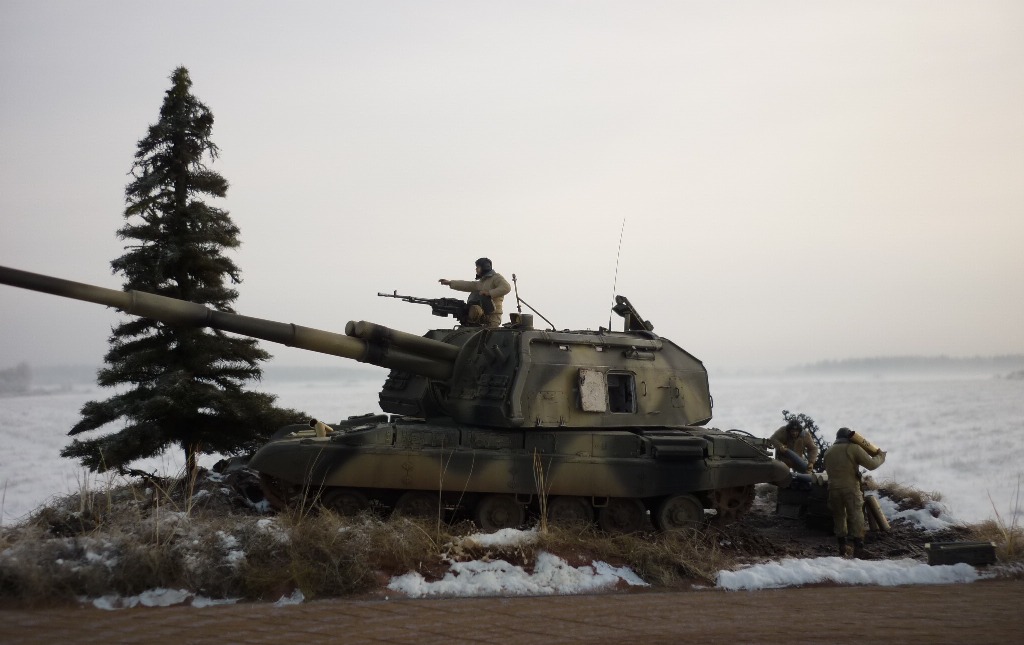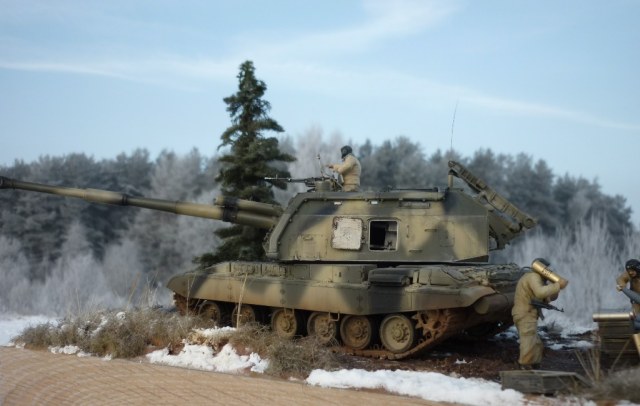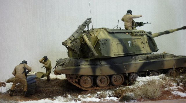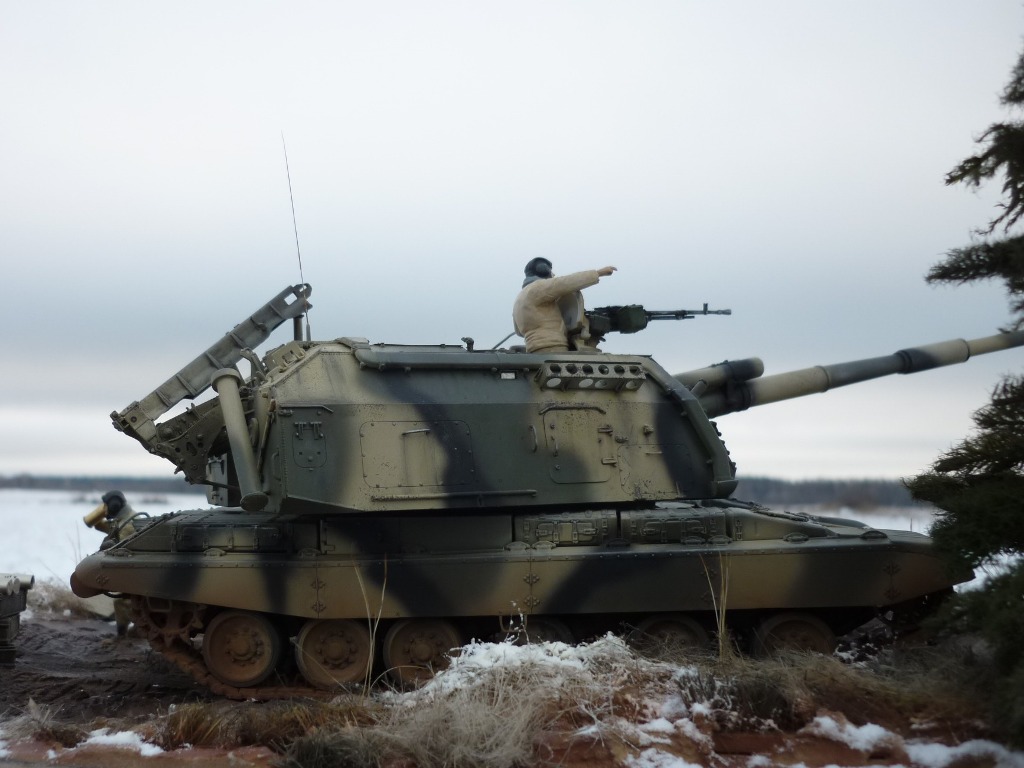 Доброе время суток! Доделал диораму, и спешу поделится с вами коллеги по цеху! Как всегда сделал сперва одну мсту! но на полке она стояла как то скучновато без экипажа, пришлось сконструировать все остальное, ну,а как получилось судить вам! Про мсту скажу собиралась не очень легко(очень много мелочи) почти полностью коробочный вариант, добавил только триплексы и немного внутреннего интерьера,бойцам поменя геометрию рук,красил как всегда тамия. Приятного просмотра!!!