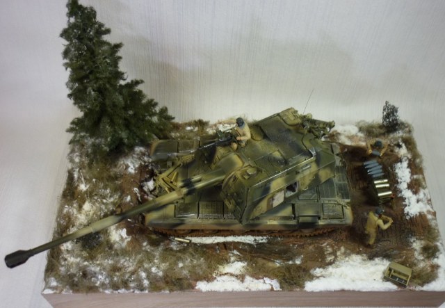 ну...диорама вышла очень реалистичной! но немного выдает неживой взгляд у миниатюр и танк со своим камо выглядит каким-то "теплым" по сравнению со всем окружением. И пыль на звездах маленько плоско ввышла-но это из-за охвата(ну насыщенной и непостоянно по цвету делать ее на такой площади тоде реалистично не станет-так что пыль опускаю) но на гусеницах фильтр бы добавить. а в остальном на высшем уровне!