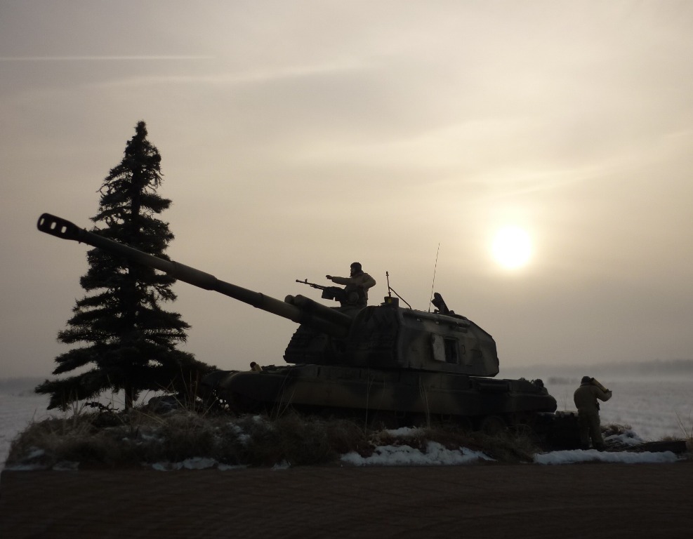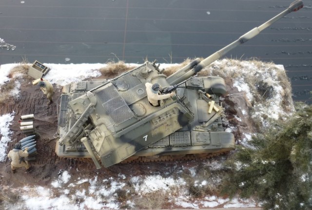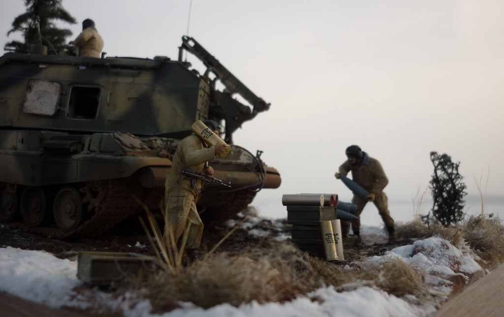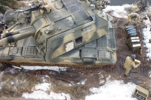 А вот с остальными вопросами согласен, я бы еще добавил, если гаубица произвела залпы по противнику то ей нужно как можно скорее покинуть позицию пока ответный удар не накрыл САУ, а тут заряжающие с грунта разложили снаряды. Ладно, допустим что идут учения и торопиться некуда....в общем добавите в описание свой сюжет может и более понятнее людям станет.