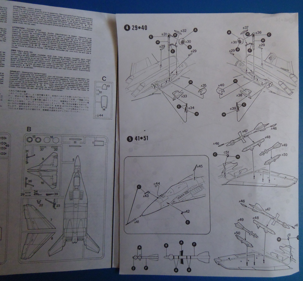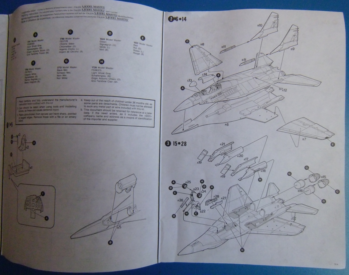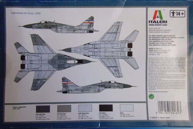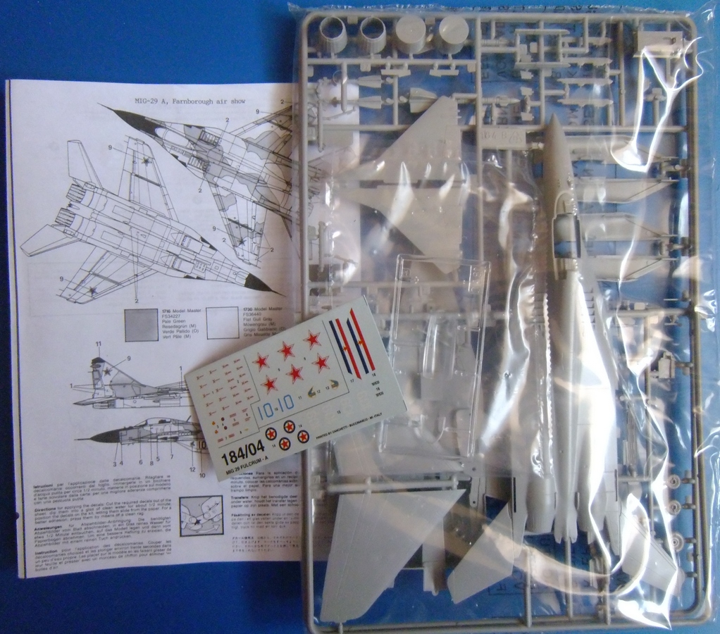 Доброго времени суток господа моделисты. Досталась мне по обмену "не глядя"))) вот такая коробочка с МиГ-29А. Упаковка из обычного италовского картона.Не очень надежного,но пару переездов по почте все-же перенесла стойко. В коробке 1пакет с литниками,инструкция по сборке и не большой листочек декали. В пакете с литниками 2 литника с моделью и 1 литник с остекленением. Инструкция сделана на одном,сложенном втрое листе,проста и понятна. Да и по количеству деталей в наборе думаю в ней нет особой необходимости если ранее уже есть хоть минимальный опыт сборки.К литникам особых вопросов нет.Есть конечно пара мест с утяжинами,но это мелочь.Декаль рассчитана на 2 варианта окраски.Югославский и Советский.Технички почти нет,а то,что есть не очень презентабельно выглядит.Одним словом,дэку в топку!))) Ну вот вроде вкратце и все. Остальное думаю видно по фото будет. Если имеете инфу по стыкуемости,косякам производителя,и.т.д и.т.п,прошу отписаться. Думаю,что полезной инфы много не бывает.))) Всех с наступающим НГ!!! Успехов,добра и мира!