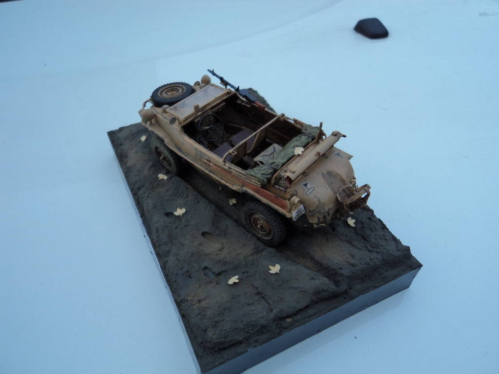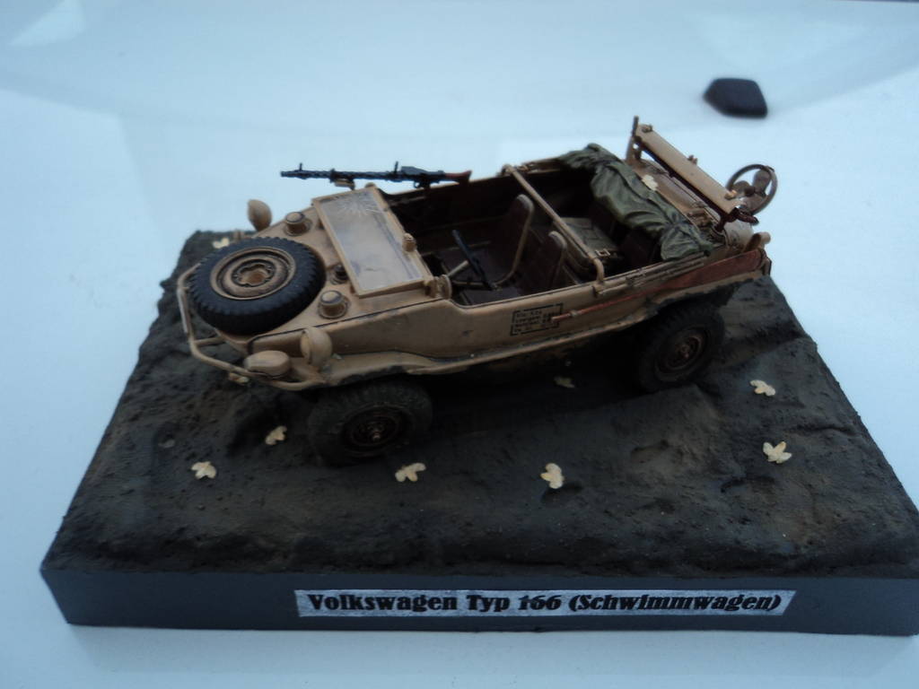 Представляю Вашему вниманию модель плавающего автомобиля Schwimmwagen.Сборка практически изкоробочная,добавлен пулемёт на самодельной стойке да канистра на заднем сиденье.Окраска кистью водным "АКАНом".Грязь - жуткая смесь из соды,"Мастер-пигмента" и ПВА.Подставка склеена из пластиковых листов,грунт на ней - самозастывающая скульптурная глина.