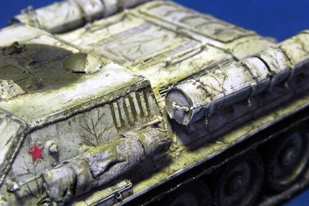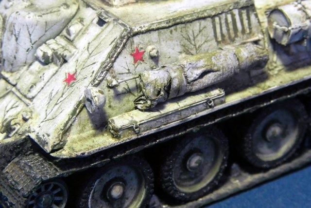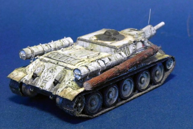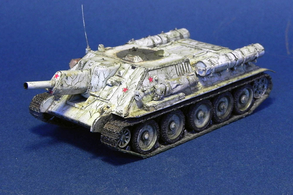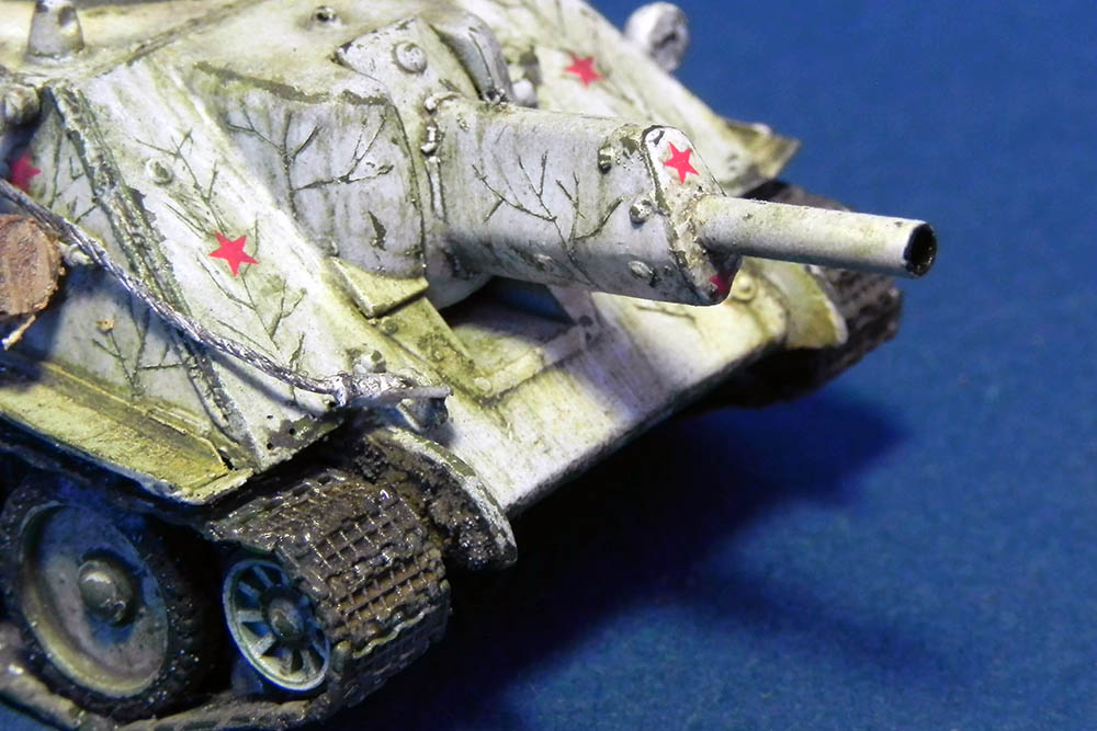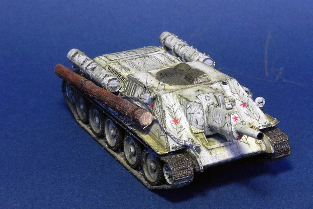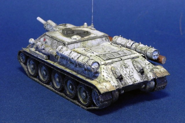 В качестве прототипа выбрал довольно известное фото "сушек" на фоне триумфальной арки. Бортовой номер головной машины рассмотреть не смог, поэтому сделал просто "111". Один западный автор на основе этого фото нарисовал схему окраски, на которой круг на крыше рубки красный. Эта схема довольно распространена в сети. Но хиномару на крыше советской самоходки не внушает мне доверия. Круг на фото виден. Но установить его цвет лично я не смог. Поэтому я, на свой страх и риск, решил отойти от шаблона и сделал круг зелёным.