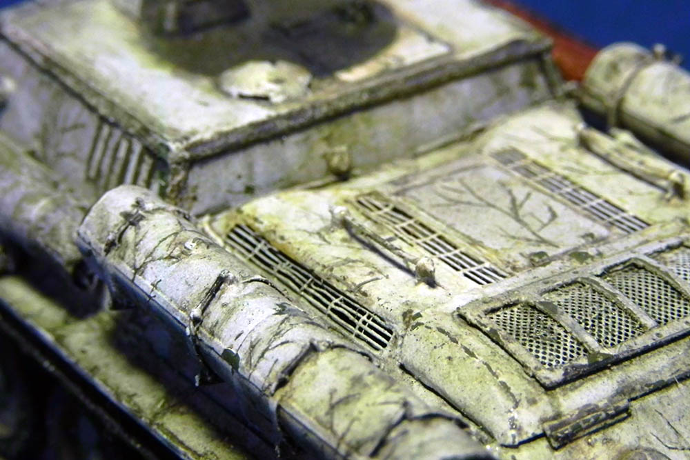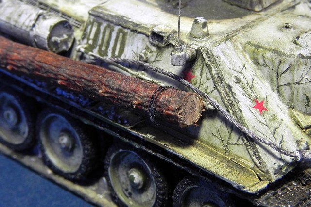Базовый цвет - это АКАН нитра. Белый - Валехо. Долго экспериментировал с "веточками". В результате нашёл очень простой способ. Просто аккуратно процарапал их ножом. Потом задул лаком и зачистил наждачкой 2000. Дёшево и сердито. Бревно - веточка кипариса, который, к моему счастью, распространён в наших краях. Его кора похожа на кору сосны в 72-м :)