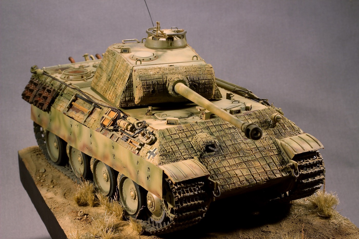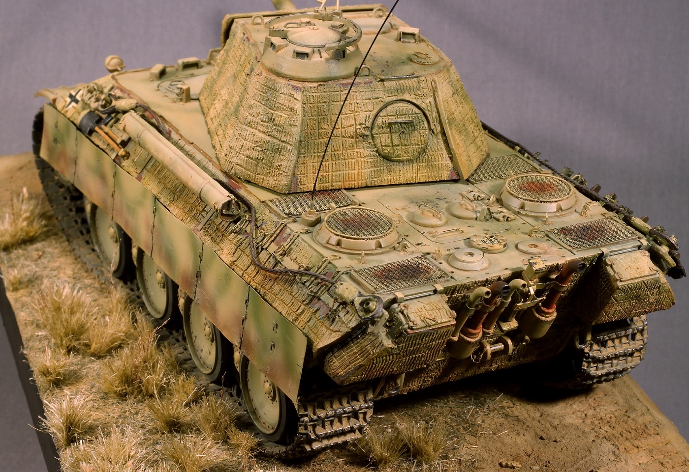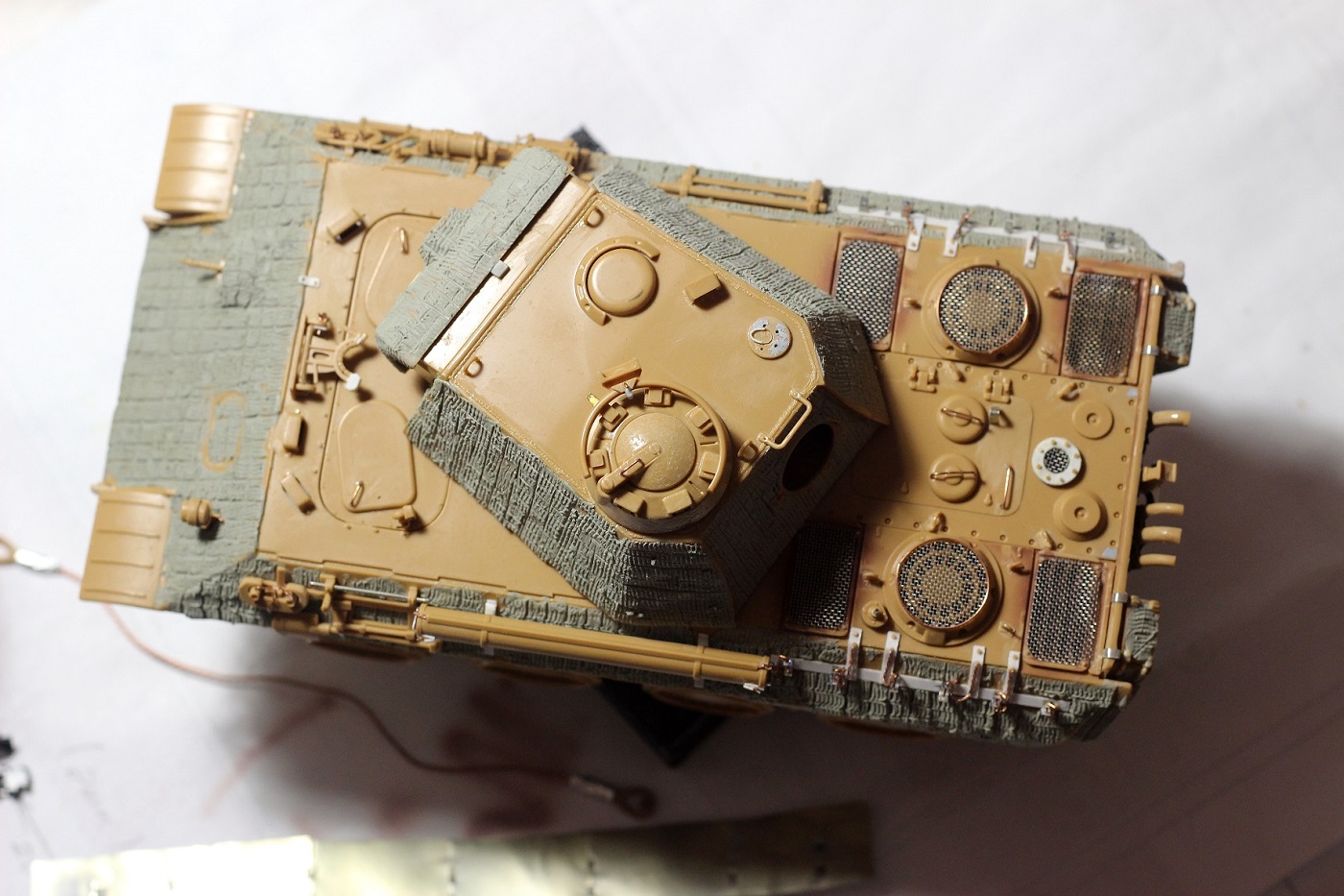 Большая работа проведена! Но видно что танк поюзан, а ходовая стерильна. Циммерит лучше, наверное, фабричного производства, хотя труда и на ваш цим затрачено не мало. В общем неплохо смотрится.