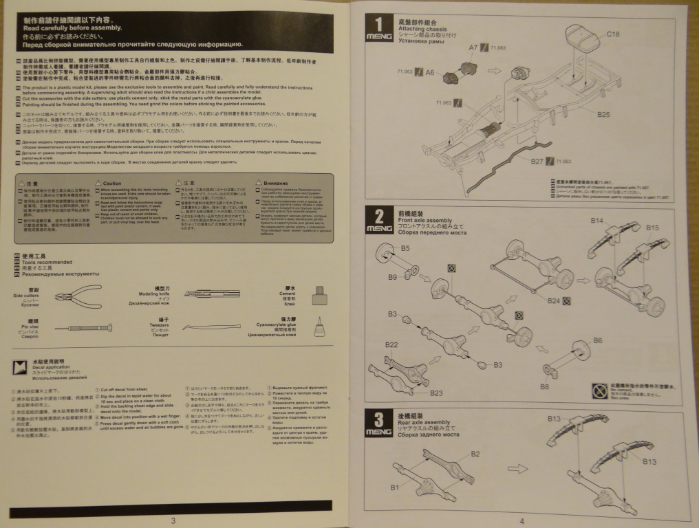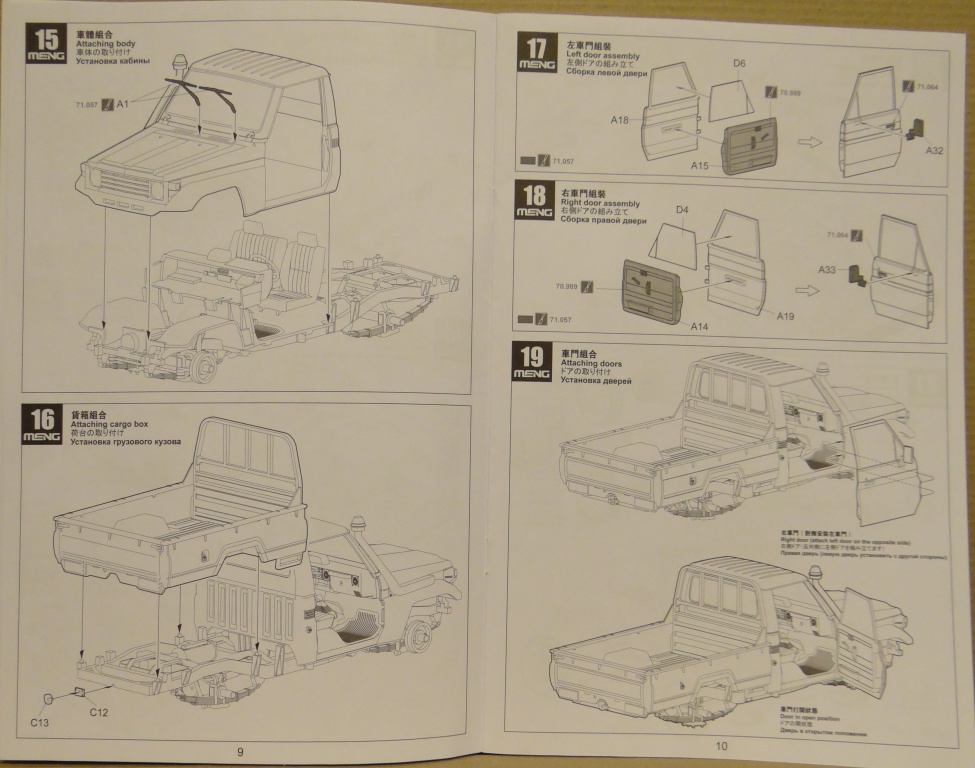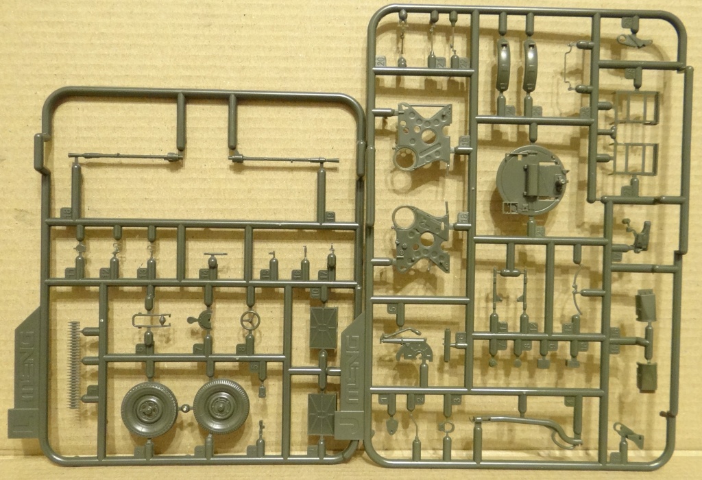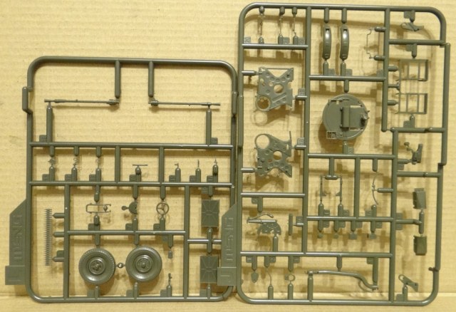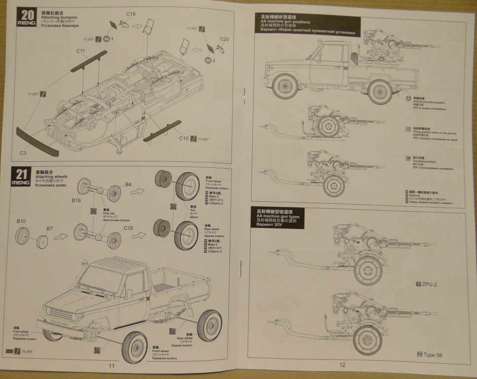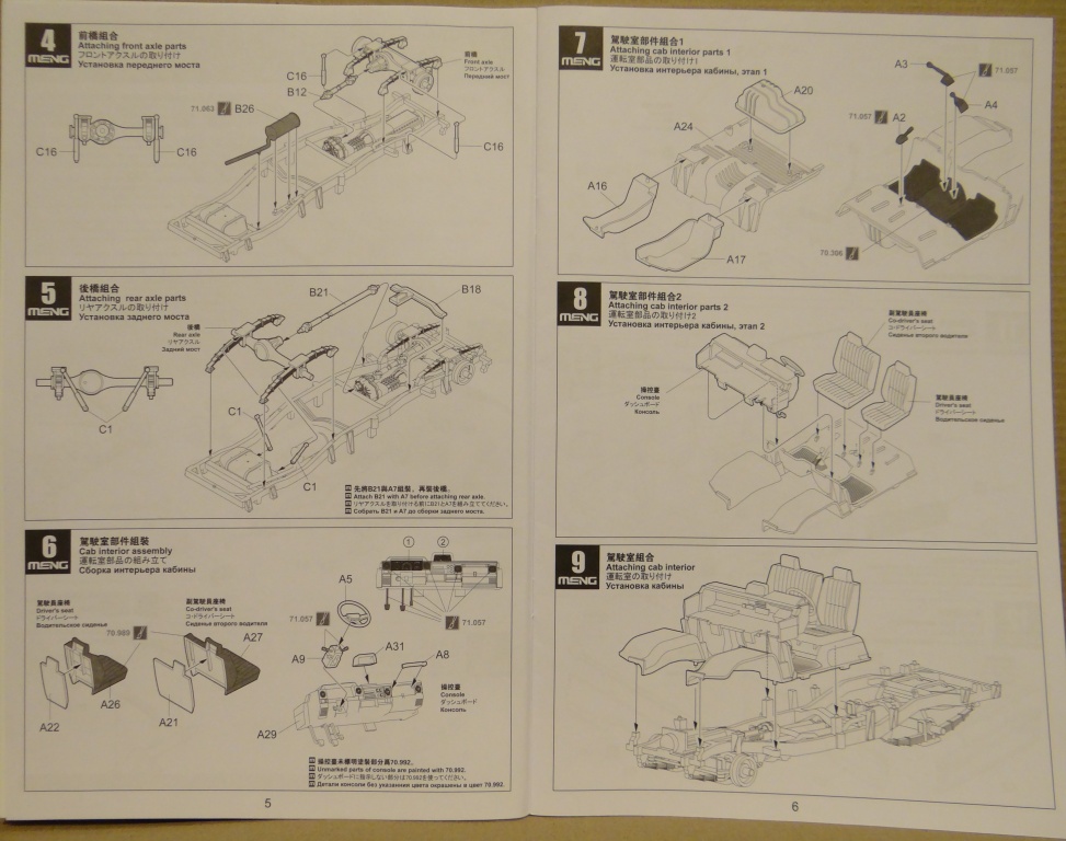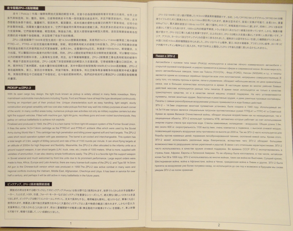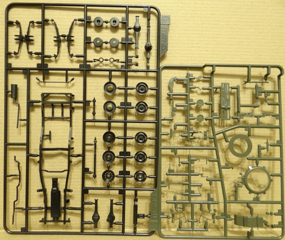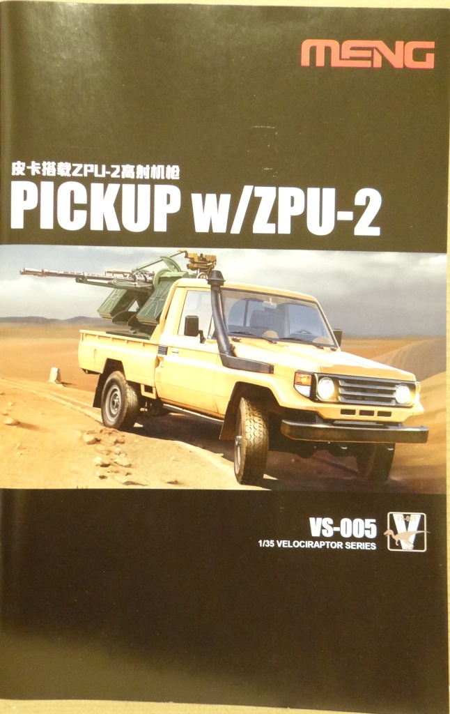 Приветствую Вас дорогие Каропчане. Представляю Вашему вниманию кит от MENGа PICKUP w/ZPU 2. В коробке имеются: инструкция в форме книжечки, где подробно описано про саму машину и цветные элюстрации окраски. Так же раздельная кабина и крыша, 2 литника песочного цвета, 5 литников зелёного цвета, 2 литника чёрного цвета, литник остекленения, травлёнка, листочек с декалями, резиновые втулки и сама собственно резина. Всё это дело расфасовано в отдельные пакетики и аккуратно уложено. Качество отливок хорошее, утяжин нет, облой присутствует местами, но не смертельный. Сам пластик очень гибкий и приятный в работе. Стыковка деталей на 5.