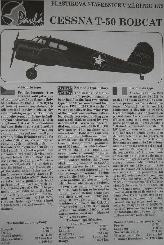 Многоцелевой транспортный самолет Cessna T-50 Bobcat был создан в 1939 году. Машина строилась серийно и эксплуатировалась в нескольких странах. Подробнее об этом самолёте можно прочитать тут.
