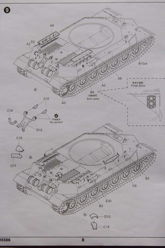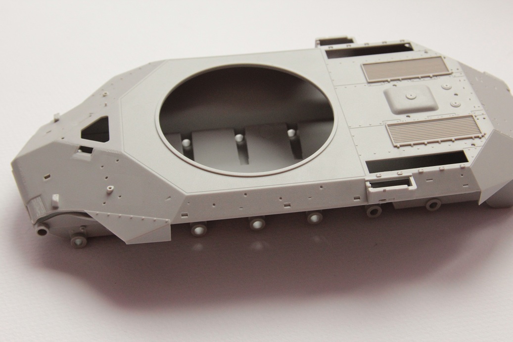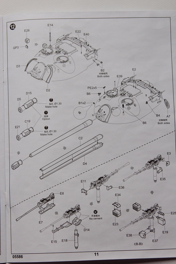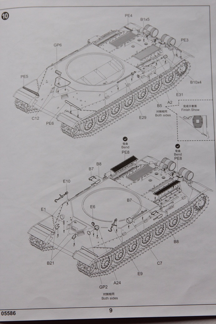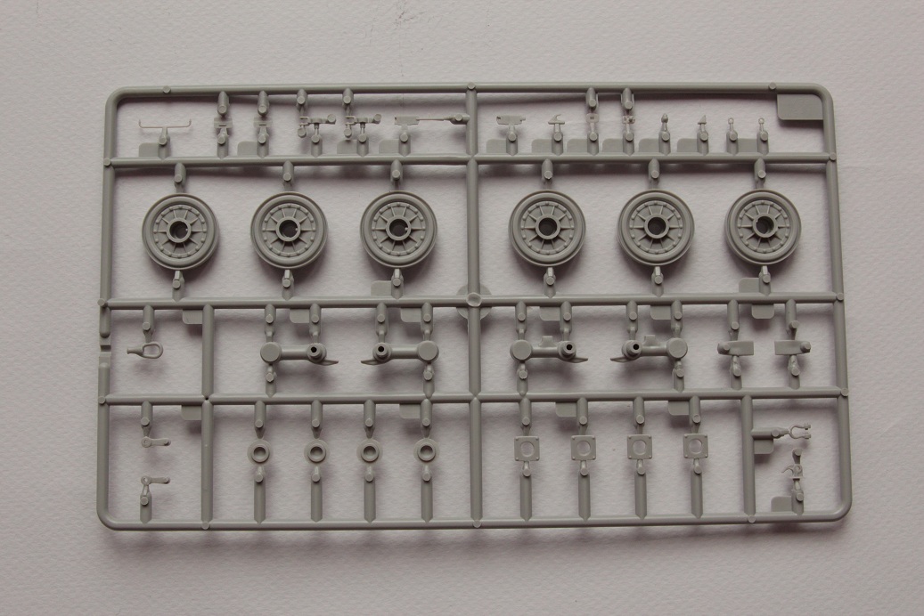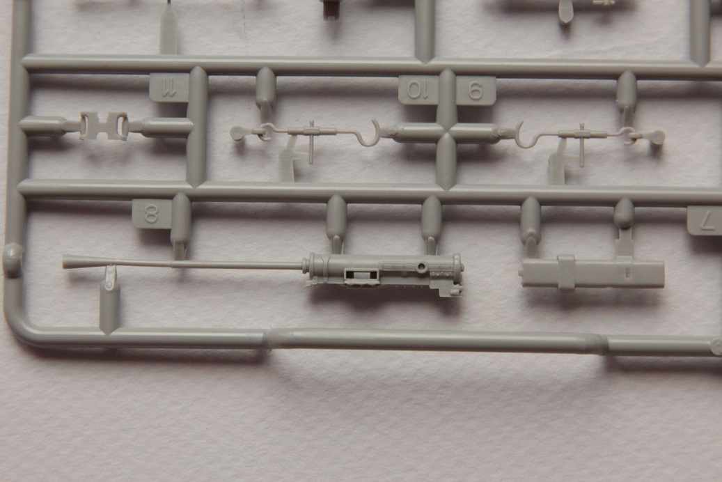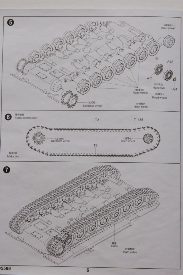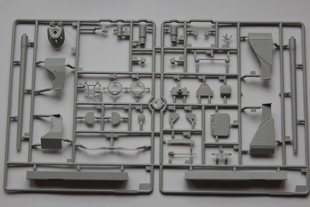 Открыв коробку, мы видим 4 литника с элементами ходовой и каткам, два литника с катками и ведущими звездочками, один литник с мелкими элементами для детализации корпуса и решетками ограждения фар, один большой литник с деталями корпуса и стволом, литник с прозрачными деталями, маленькая платка травления с сетками, тросик, декаль, инструкция выполненная в виде книжки, схема окраски и рекламная брошюра. Корпус с ванной, так же как и башня идут отдельными деталями. Траки даны на двух литниках полу наборные на каждом траке стоит литьевой номер . И так, что имеем всего 11 литников из них восемь из серого пластика , два из коричневого и один из прозрачного. После детально просмотра всего, что навалил в коробку «Трубач» радость от покупки тихо сошла на нет. Стыкуемость корпуса не идеальная шпаклевать по любому нужно,на стыке лобовой плиты по краям должны быть отверстия под болты с верху и с низу но их нет, сварные швы нужно переделывать причем все, как оказалось передние крылья тоже нужно пилить , дульный тормоз нужно весь высверливать, блин мало того что ствол из половинок так ещё и не могли нормальный дульник сделать.Траки полу наборные это сто процентов будут проблемы с натяжением, следы пресс форм на всех деталях т.е нужно все обрабатывать, кривые пулеметы так это вообще красота, брезент на маску орудия есть а намека на его крепление нет совсем, баки тоже совсем не понравились какие то они простенькие совсем, даже тросик какой-то короткий.