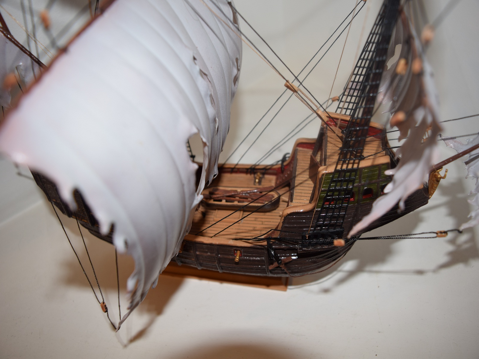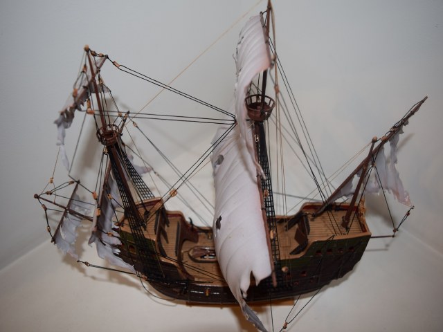 Добрый вечер Александр.Посмотрел Ваш летучий корабль.Видно что старались,но не вдаваясь в мат.часть:Летучий голандец-это легенда.Парусник который бороздит просторы океанов.без захода в порты.У вас белоснежные паруса,в данной модели возможны провисы такелажа,я бы даже связал их в не которых местах узлом.А у Вас-простые нитки.Палуба без следов эксплуатации и сторения от времени.Не чувствуется тлена.Корпус не суразно блестящий.Слабая попытка не большой замшелости.Побольше плесени по всему кораблю.Блоки слишком новые на вид.Планширь не в дугу.Много чего еще можно найти.Ради бога не обижайтесь-это только мое мнение,а у Вас ваше право и видение Летучео голандца