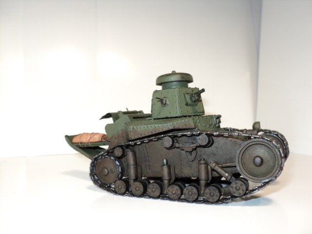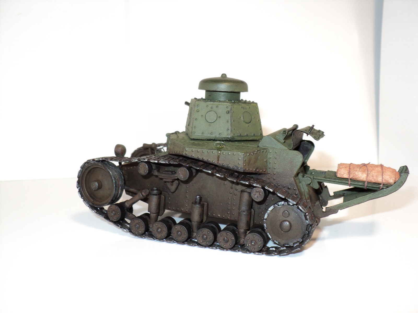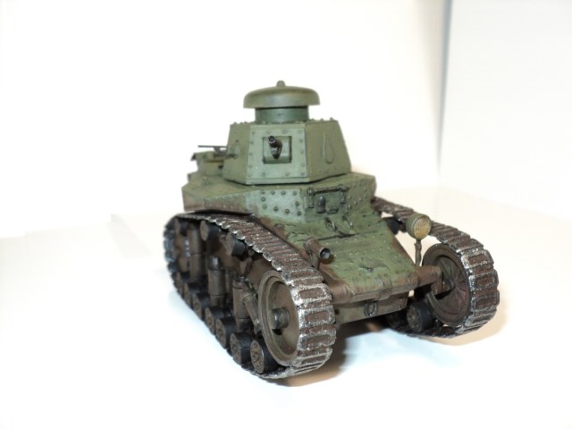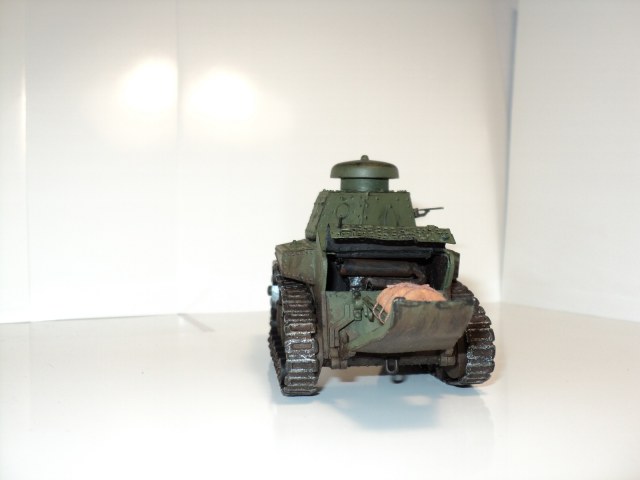 Сделал "хвост" из пивжести, пулемёт из иглы, высверлил орудие, добавил ручки из медной проволоки, проводку, к фаре и клаксону, изобразил крышку мто из пивжеси, т.к. оригинальная рассыпалась ещё на литнике, добавил скатку брезента на хвосте, сама фара тоже из другого места. Слепил подобие двигателя с выхлопной трубой.
