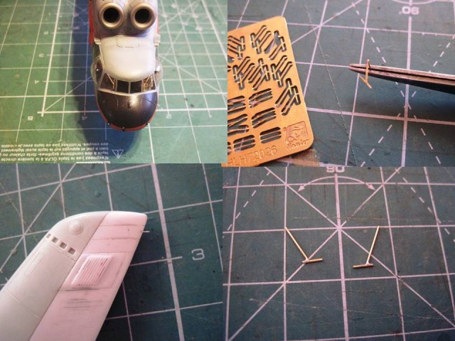 Наклеил в носовой части и на киле боковые площадки под антенны самолетного радиолокационного ответчика и из расплющенной стальной проволоки 0,3 мм собрал антенны (трезубец). Из пластика выточена ножевая антенна УКВ.Сами колпачки антенн системы "СВОЙ-ЧУЖОЙ" – тянутый скругленный литник.