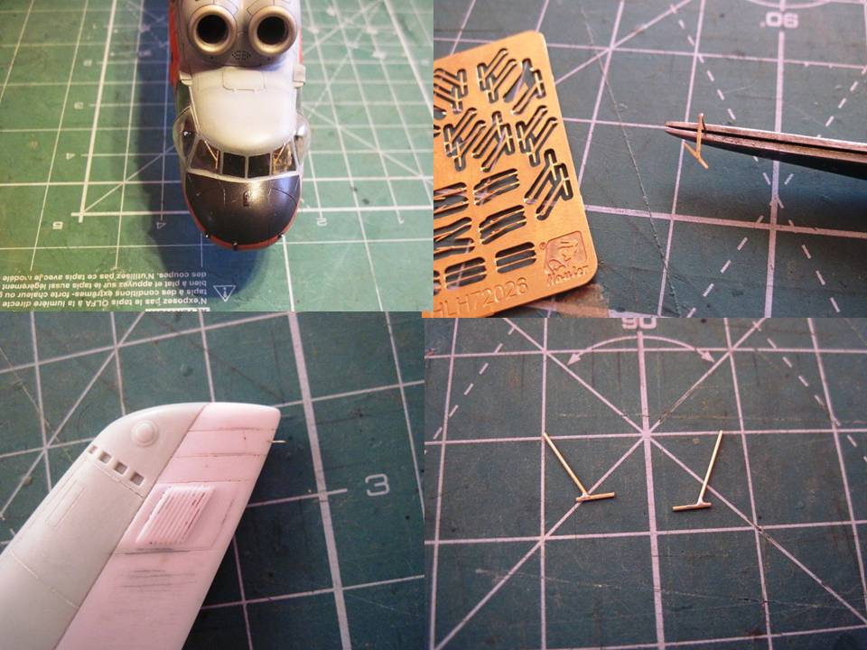 С латунных трубок 0,5 мм. Были спаяны ПВД. С наборы травления взяты дворники и припаяны на штифты 0,3 мм. Аналогично с проволоки выполнена кисточка статики килевой балки.