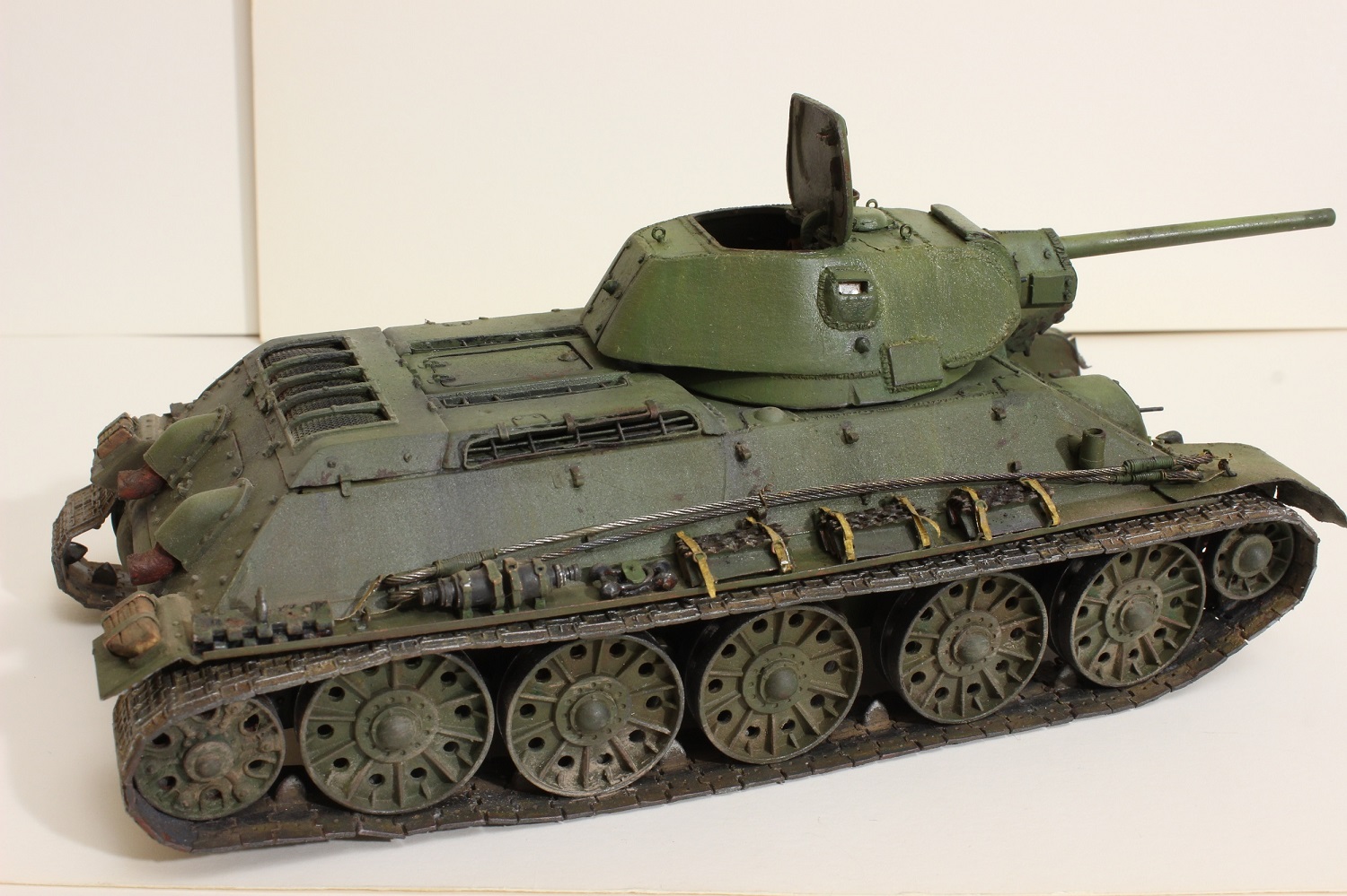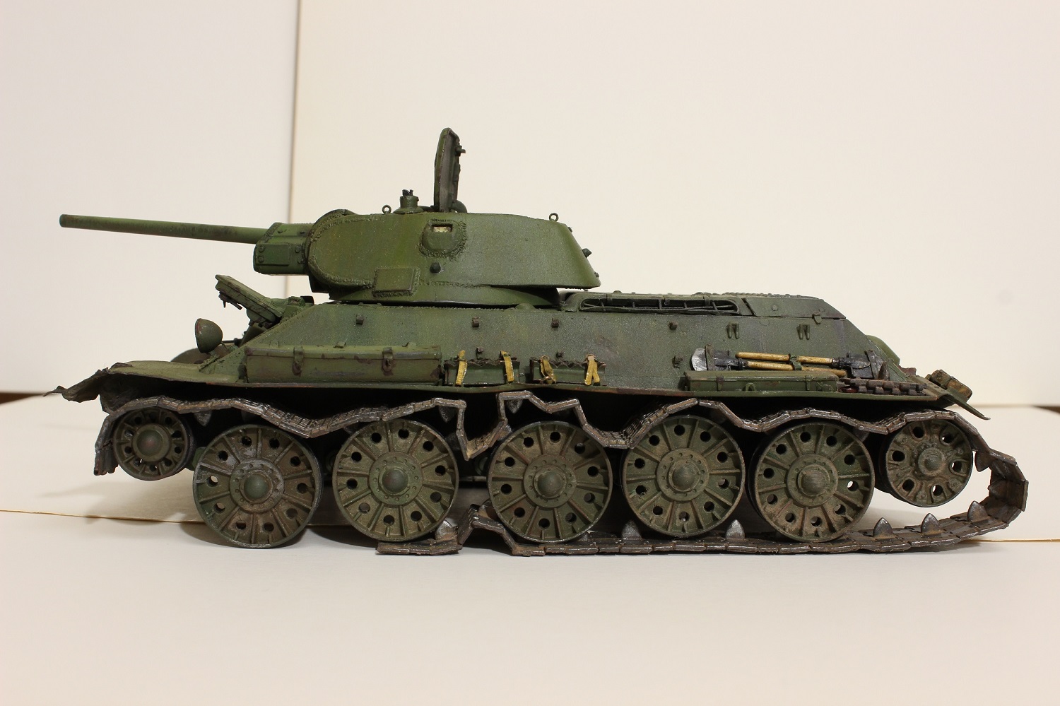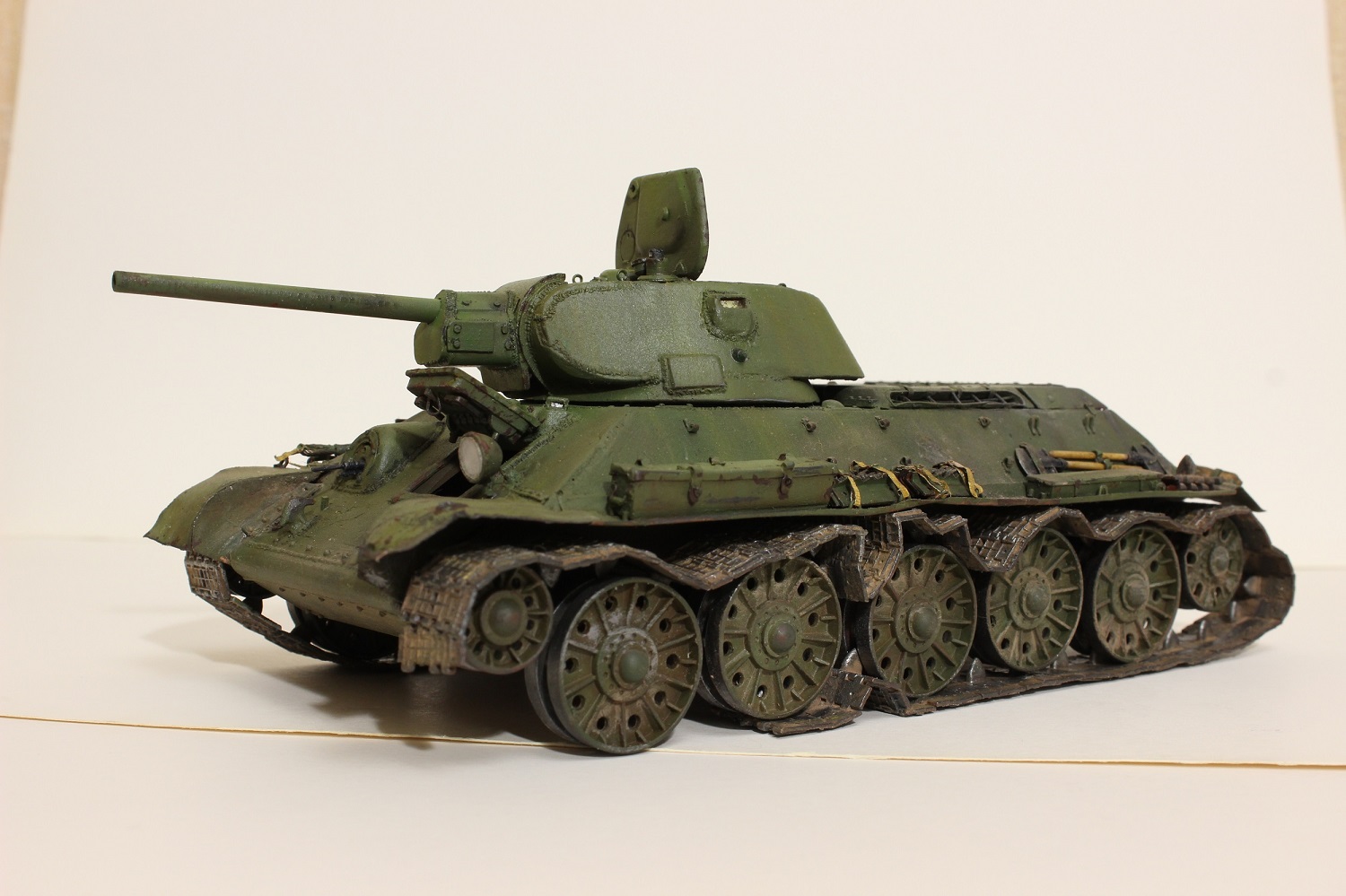 Добрый вечер. Всех с прошедшими праздниками. Выставляю на ваш суд модель Т-34-76, "сталинградка", от MSD. При сборке ни каких допнаборов не использовал. Ствол, лопаты,домкраты самодел. Полки и крылья медная жесть. В дальнейшем хочу сделать виньетку с экипажем покидающим танк.Краски : "Звезда","Хо-Ма".