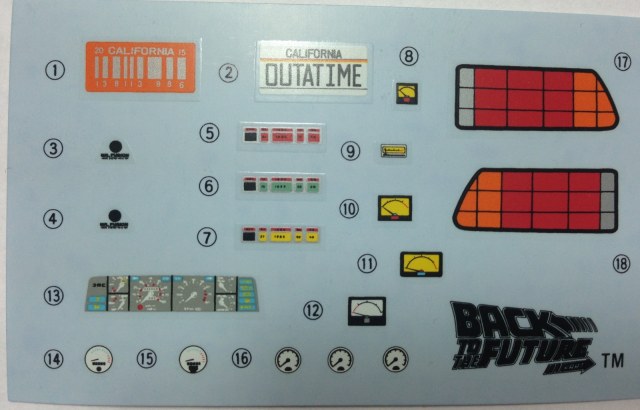 В наборе идет две платы. Цветная содержит в себе приборную панель, панель с датами, номера и прочие приборы. Все даты и цифры хорошо видны невооруженным глазом. Вторая плата дает возможность заменить турбины (или что это там сзади), значок DMC, педали, зеркала заднего вида, а также очки Дока и ховерборд Марти из второй части и еще несколько мелочей.