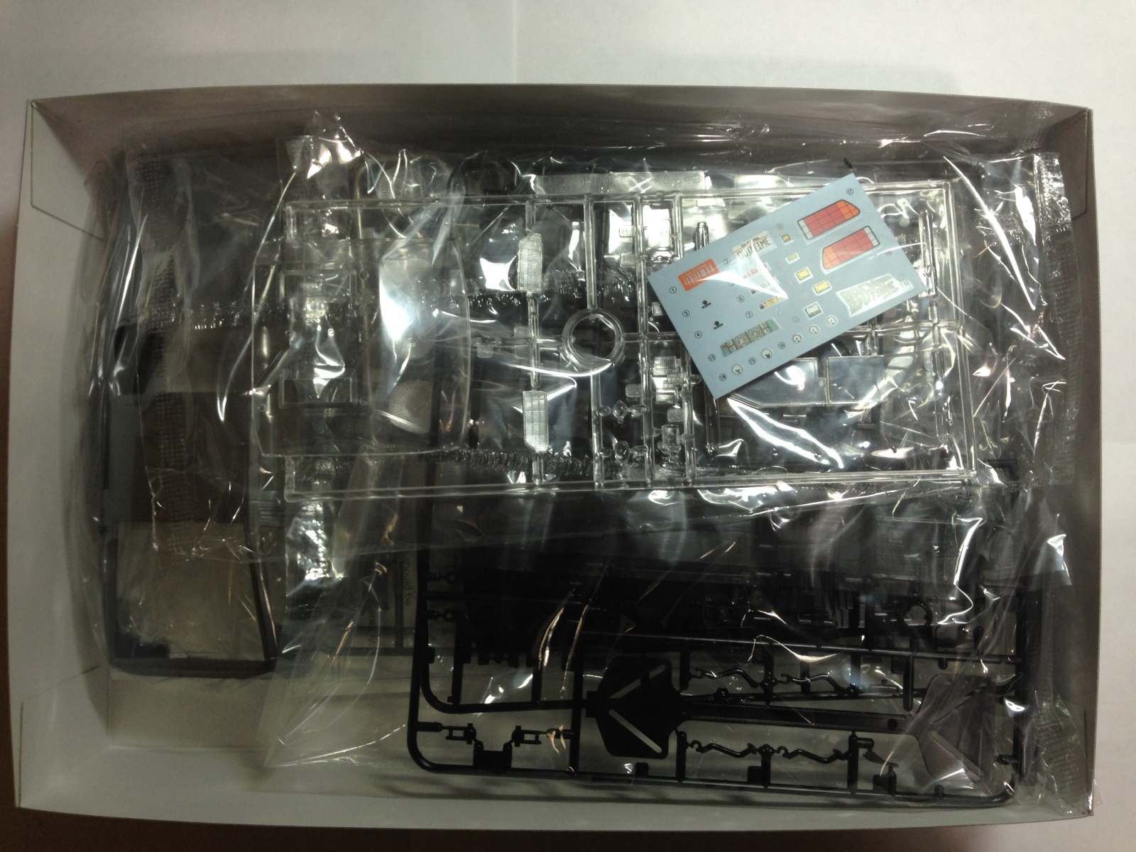 Далее поговорим о том как все упаковано. Кузов упакован в отдельный пакет. Так же упакован литник с прозрачными деталями, и в нем же лежат декали. Комплект фототравления запаян в плотный пакет и имеет картонную подложку, для предотвращения повреждений платы. Все остальное разложено по двум запаяным пакетам. Первый пакет: литник A, днище, набор резины в отдельном маленьком пакете. Второй пакет: литники E, C, D и литник с дисками. Также в коробке лежат две инструкции: основная черно-белая, распечатанная с двух сторон на одном большом листе, сложенном гармошкой (что не очень удобно, ИМХО) и цветная для фототравления. С набором шин запакован маленький пакетик с чем-то жидким, назначение которого еще предстоит выяснить. Написано на нем "Grease" (смазка), но что ей смазывать, я честно говоря, не понял.