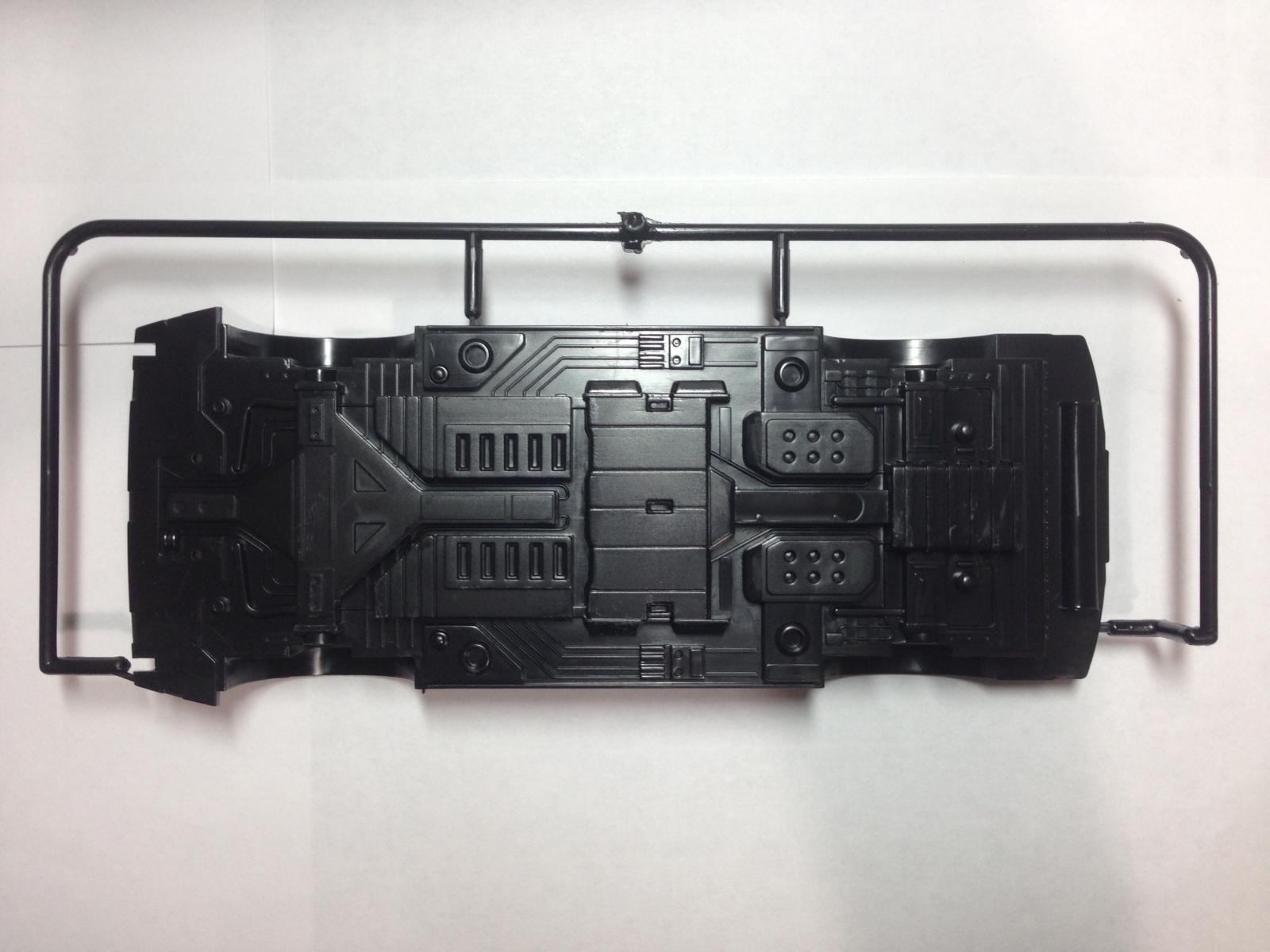 Днище автомобиля имеет интересный рельеф и при должной окраски будет смотреться отлично. Не скажу точно, но судя по инструкции и тому, что большая часть деталей без изменений перекочевала из этого набора, в набор с De Lorean из второй части, мне кажется,что крепления колес будут в итоге подвижны и смогут поднимать их в горизонтальное положение.