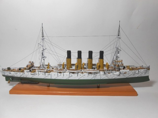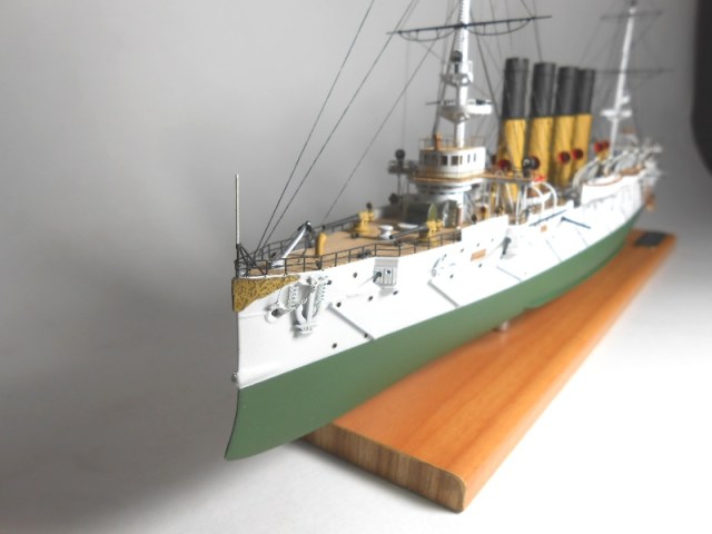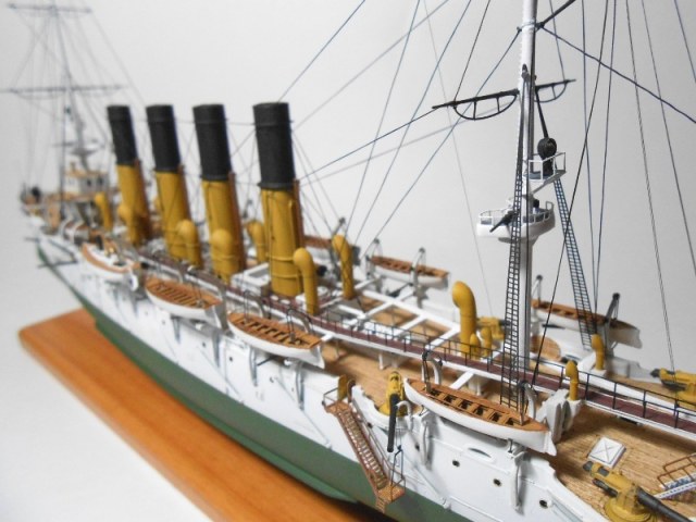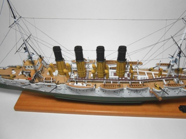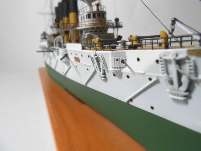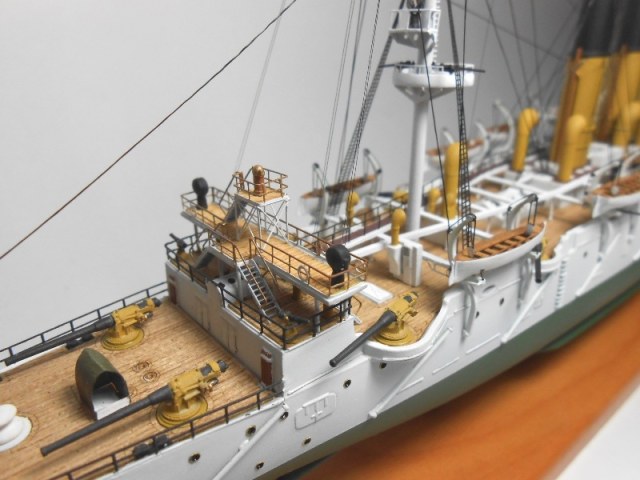 Леера и растяжки по-моему толстоваты. на леерных ограждениях этого крейсеры были деревянные "перила".