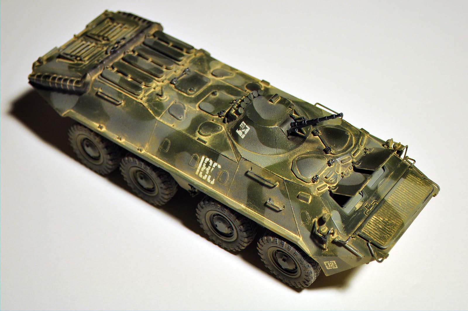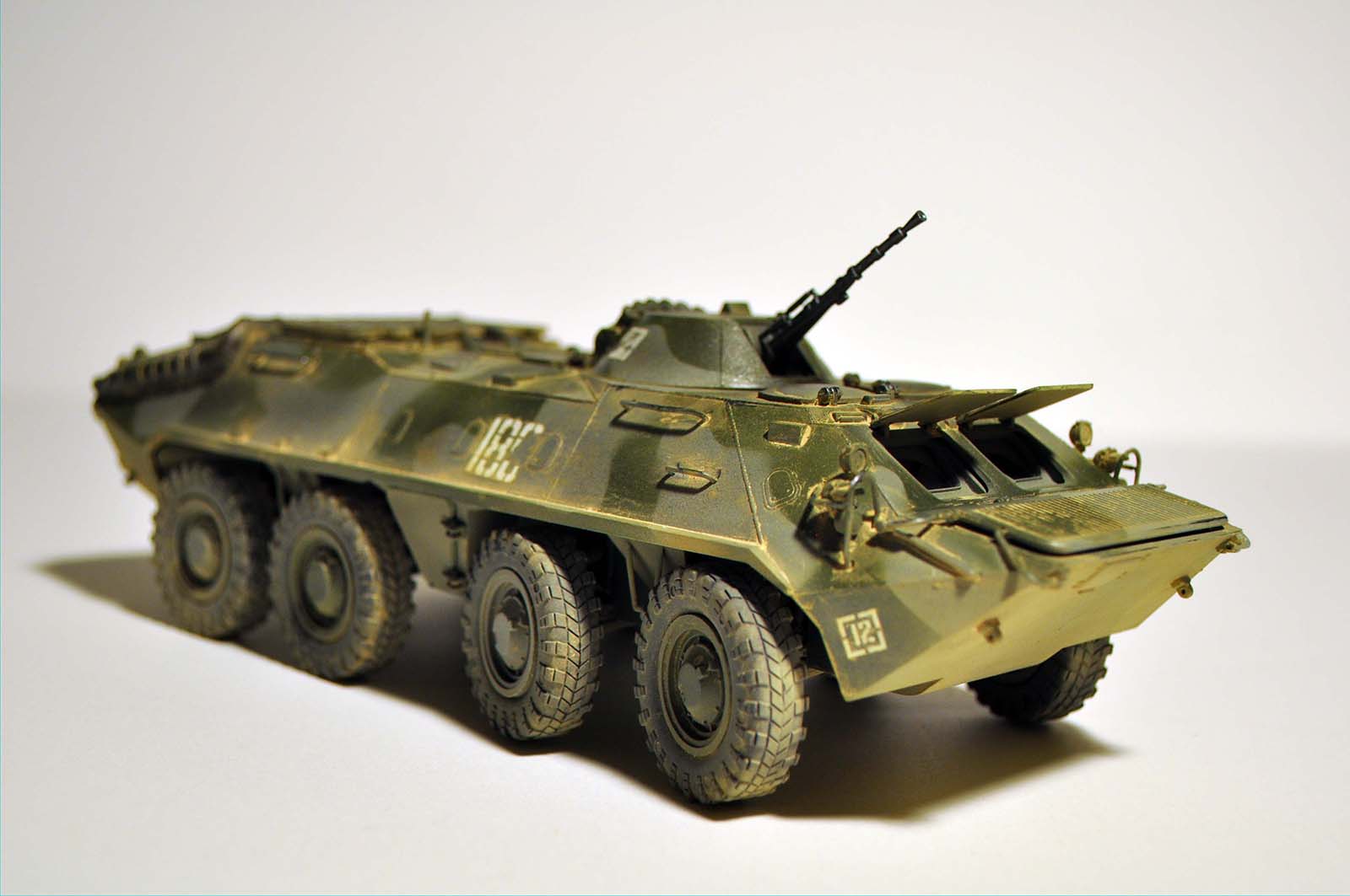 Приветствую коллега, до галереи вряд ли дотягивает к сожалению работа. Во первых передние створки на окнах в таком положении быть не могут, триплексы вообще ни как не обозначены у Вас, пыли или песка ли перебор на мой взгляд, декаль по правому борту как то разорвана непонятно, проводки к передним фарам нет..другие замечания коллеги думаю еще обозначат. Но видно старание в любом случае, удачи в следующих работах и побольше смотрите на другие работы и реальные фото!!!