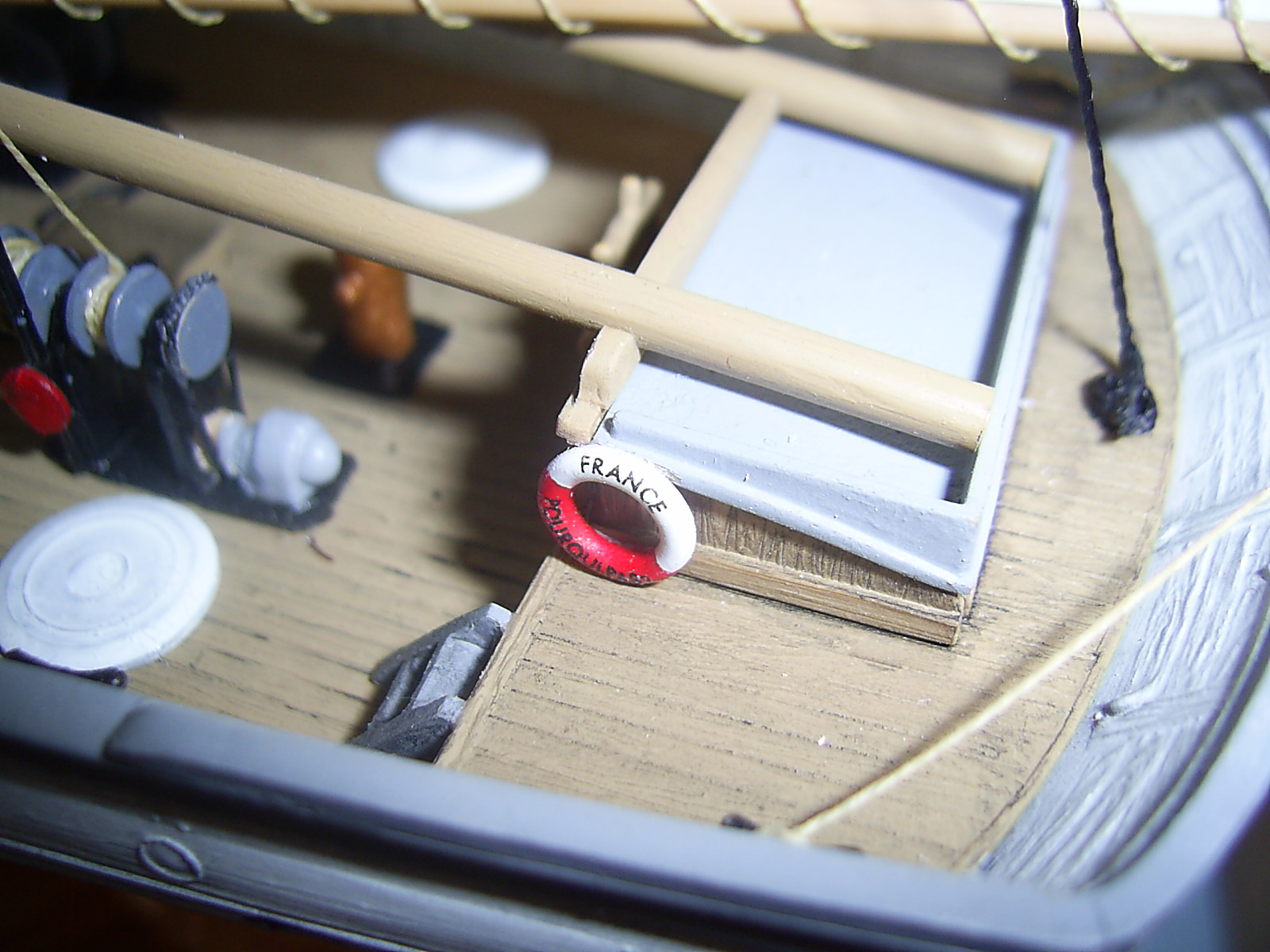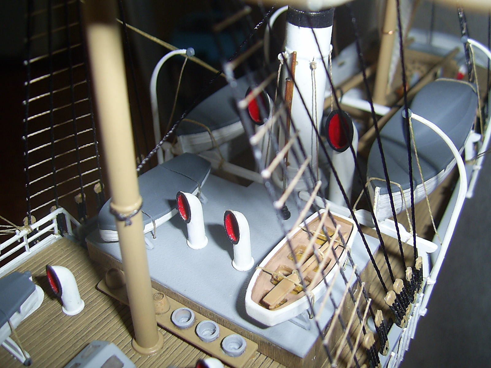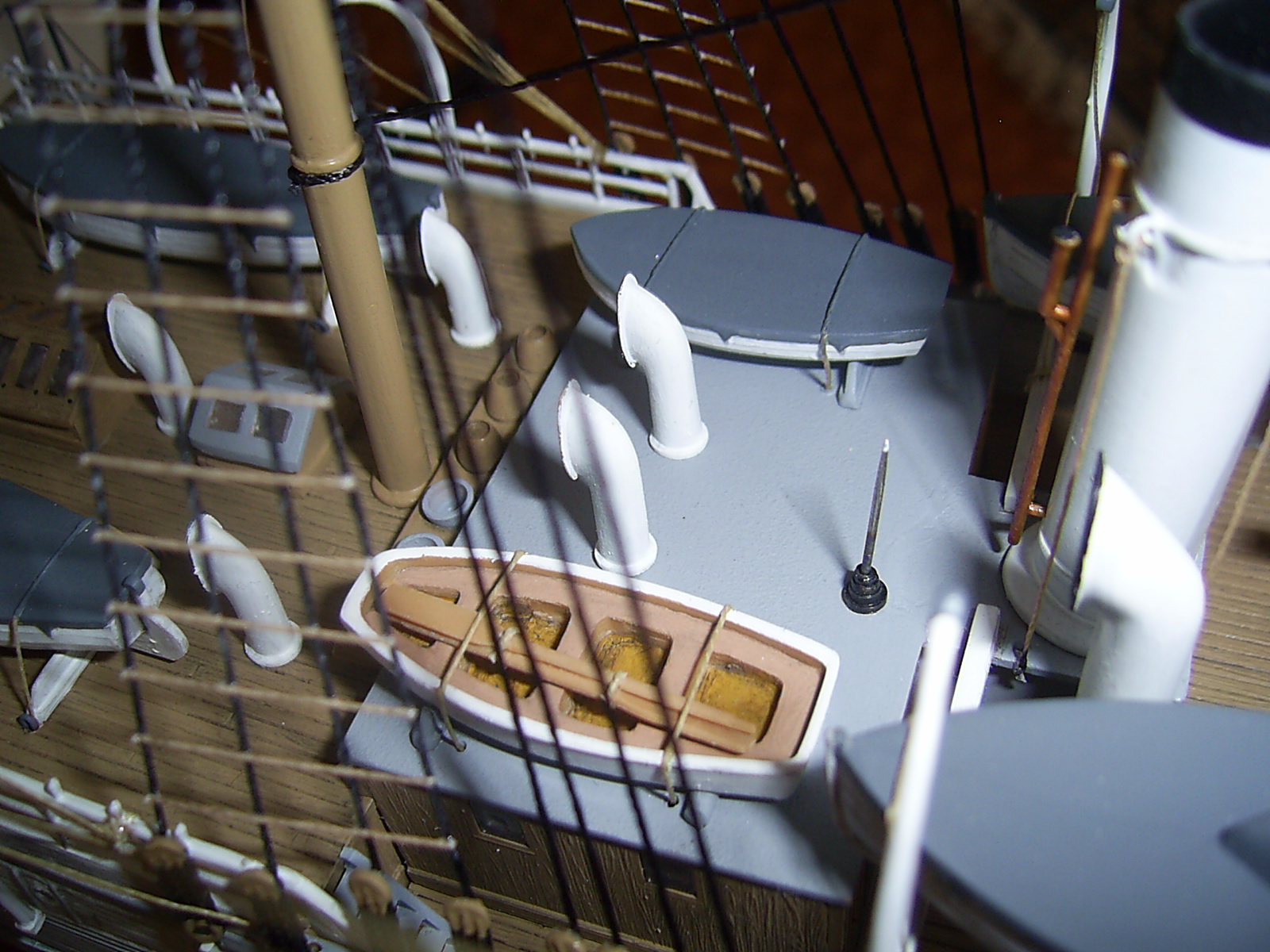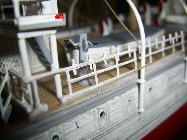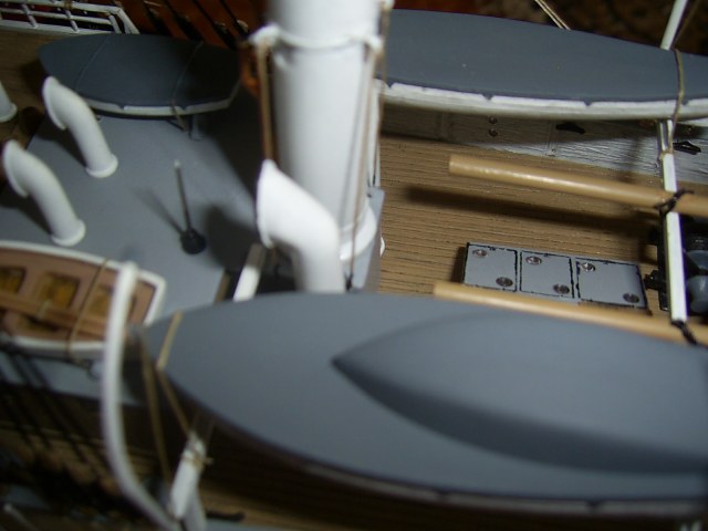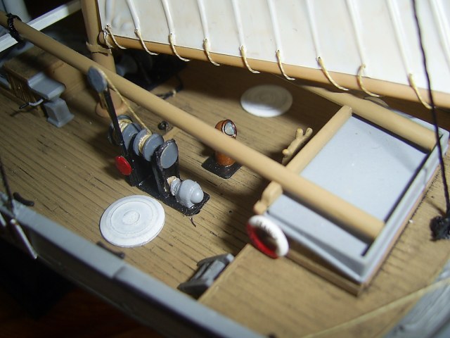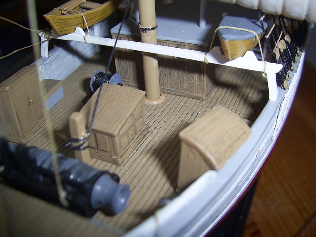 Крышки угольных ям вызывают сомнение по окрасу. Запасной рангоут у Вас не креплен. Его положено крепить с обоих сторон на мертво.