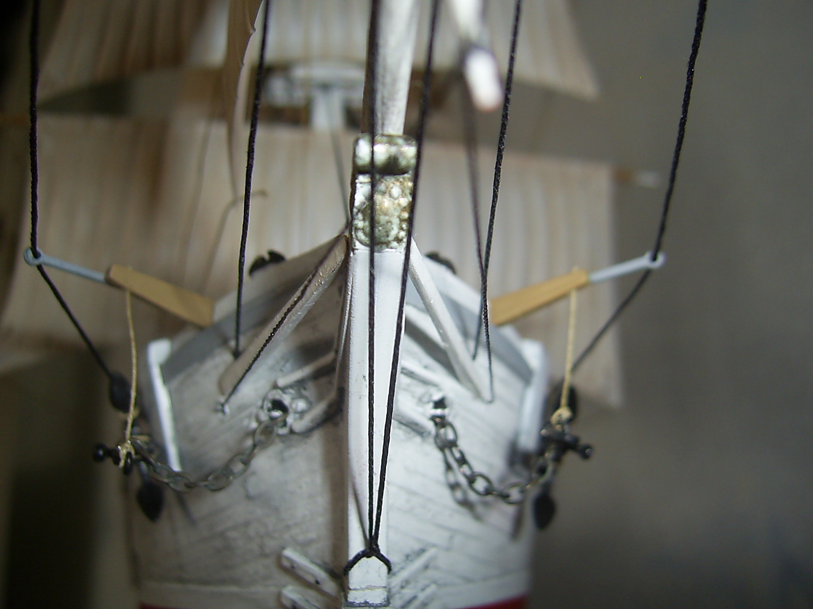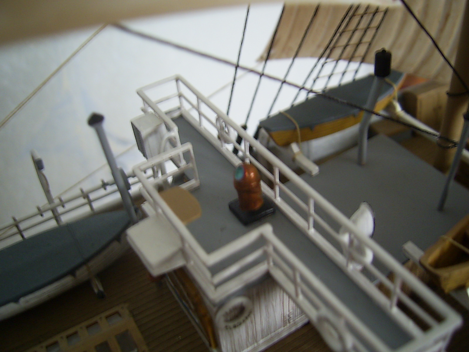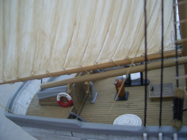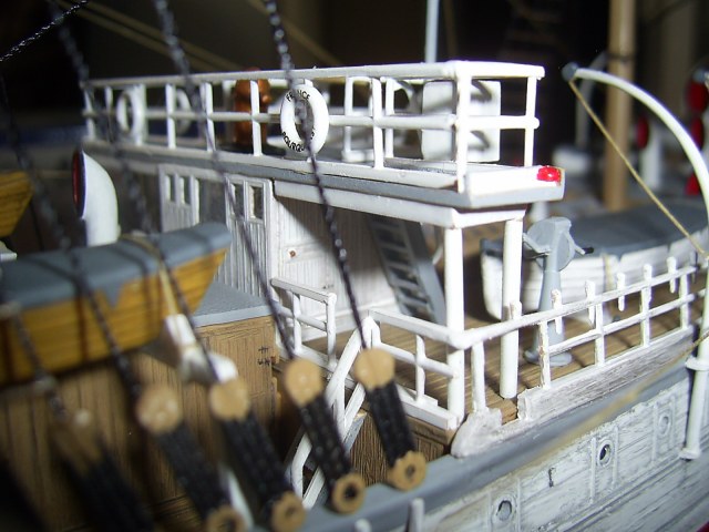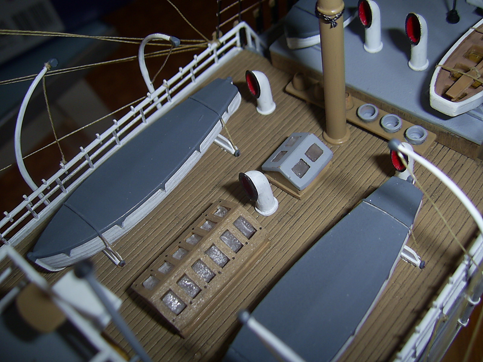Крышки угольных ям вызывают сомнение по окрасу. Запасной рангоут у Вас не креплен. Его положено крепить с обоих сторон на мертво.