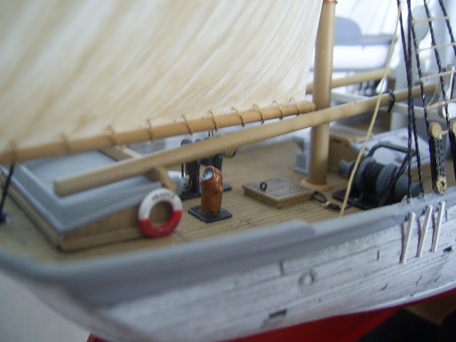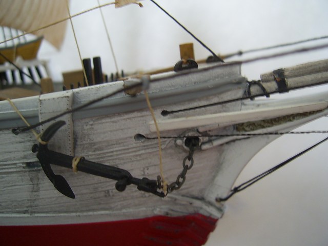 растяжки дымовой трубы у Вас белые. Но троса не красят.... модель имеет явно выраженный ледовый пояс ( уступ на корпусе) Он хорошо различим. Хотя на фото предоставленном Вами там ватерлиния белая.. Но для лучшего восприятия там просится черный. Доску с названием ( наше мнение) следовало бы выделить другим цветом. Ходовые огни слепые. Сектор ходового огня обычно окрашен в цвет огня, или черный цвет. Вызывает сомнение черная окантовка раструбов вентиляции. Так же вызывает сомнение в цветовом решении пожарного инвентаря (ведра и бочонки)