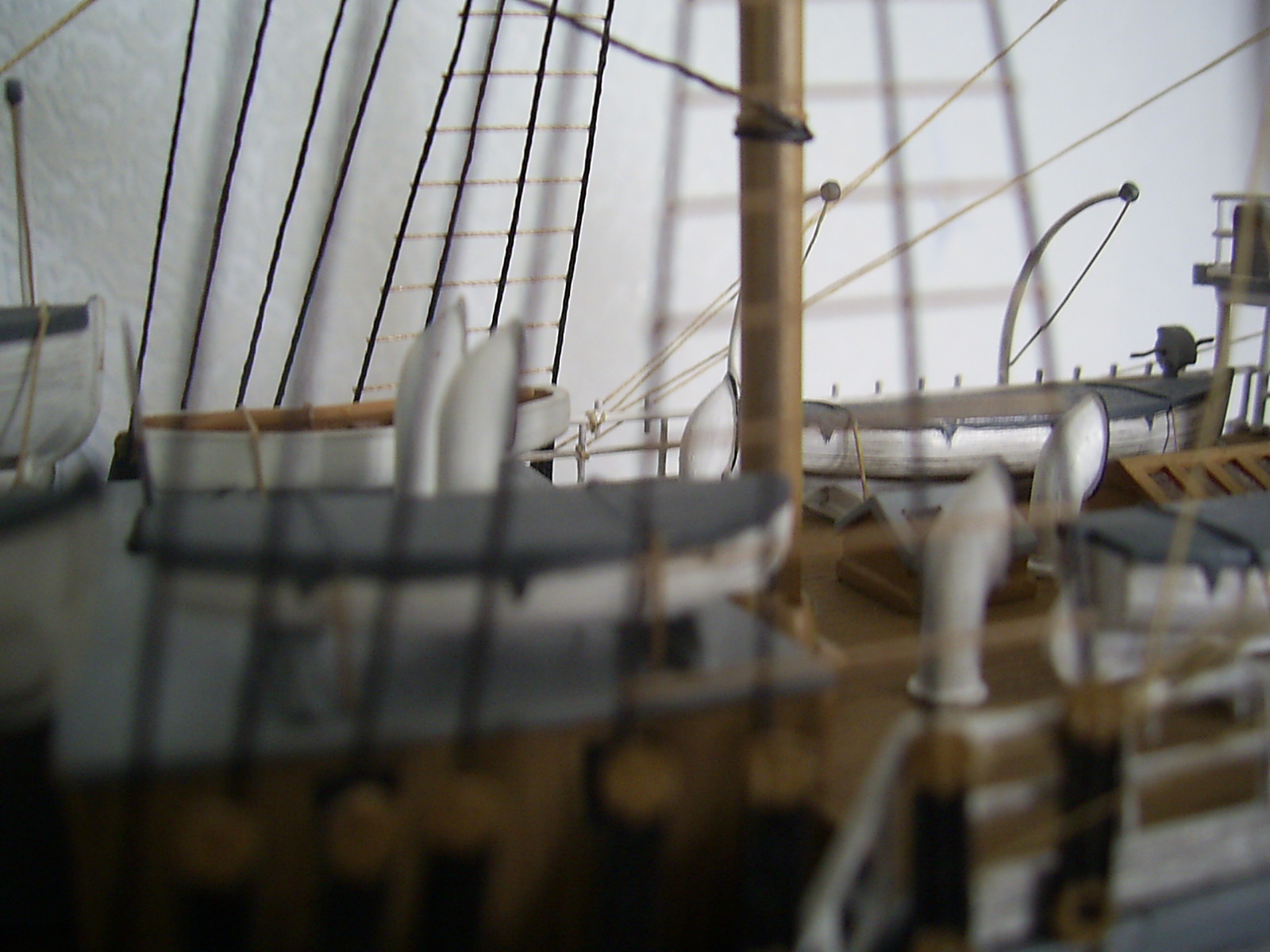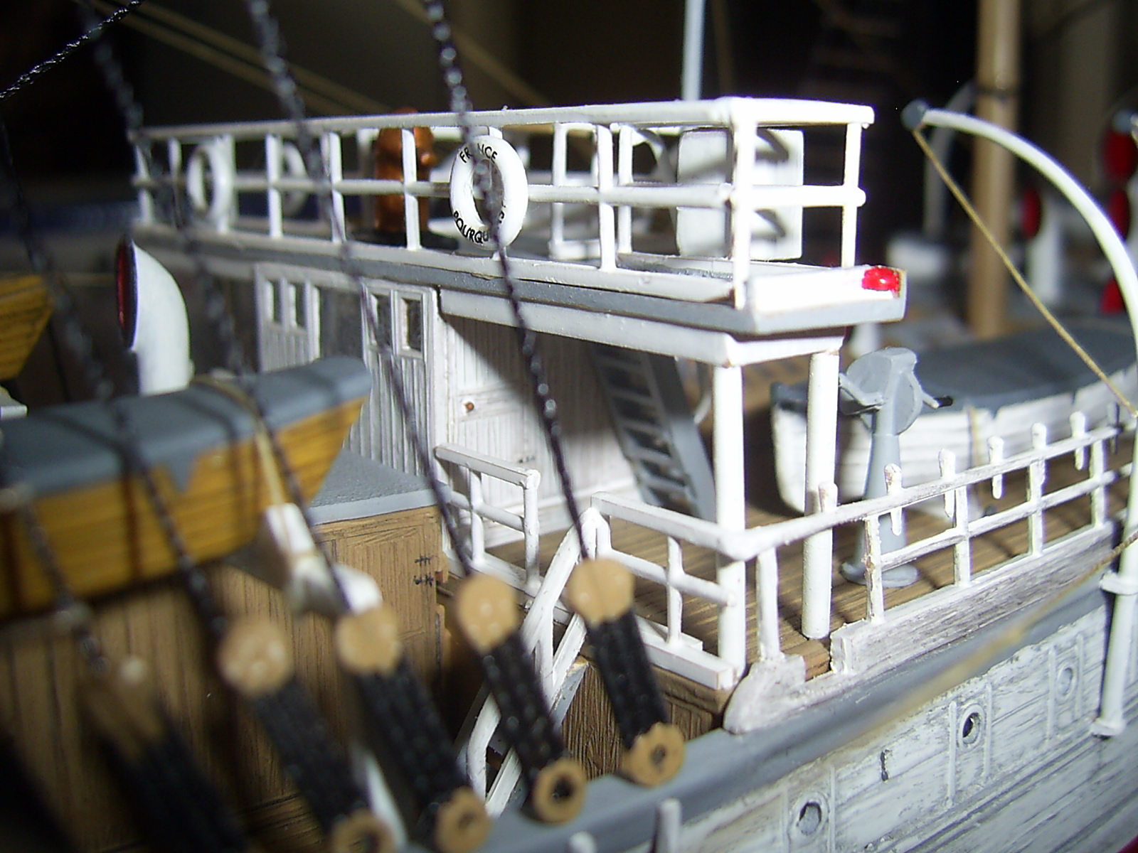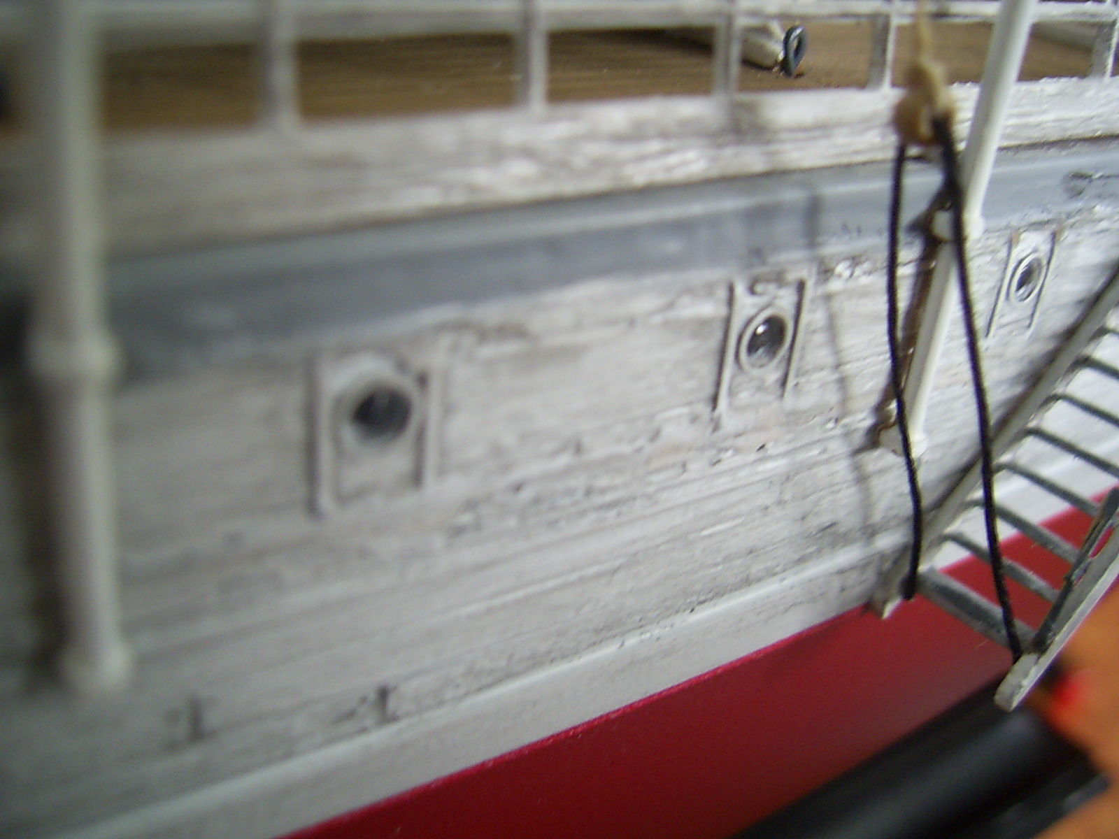 Что понравилось - вертикальные поверхности: корпус и переборки. "Грязь" на белом фоне очень оживляет и подчеркивает дерево. Палуба все-таки получилась хуже. И паруса просят "мата" - блестят сильно.