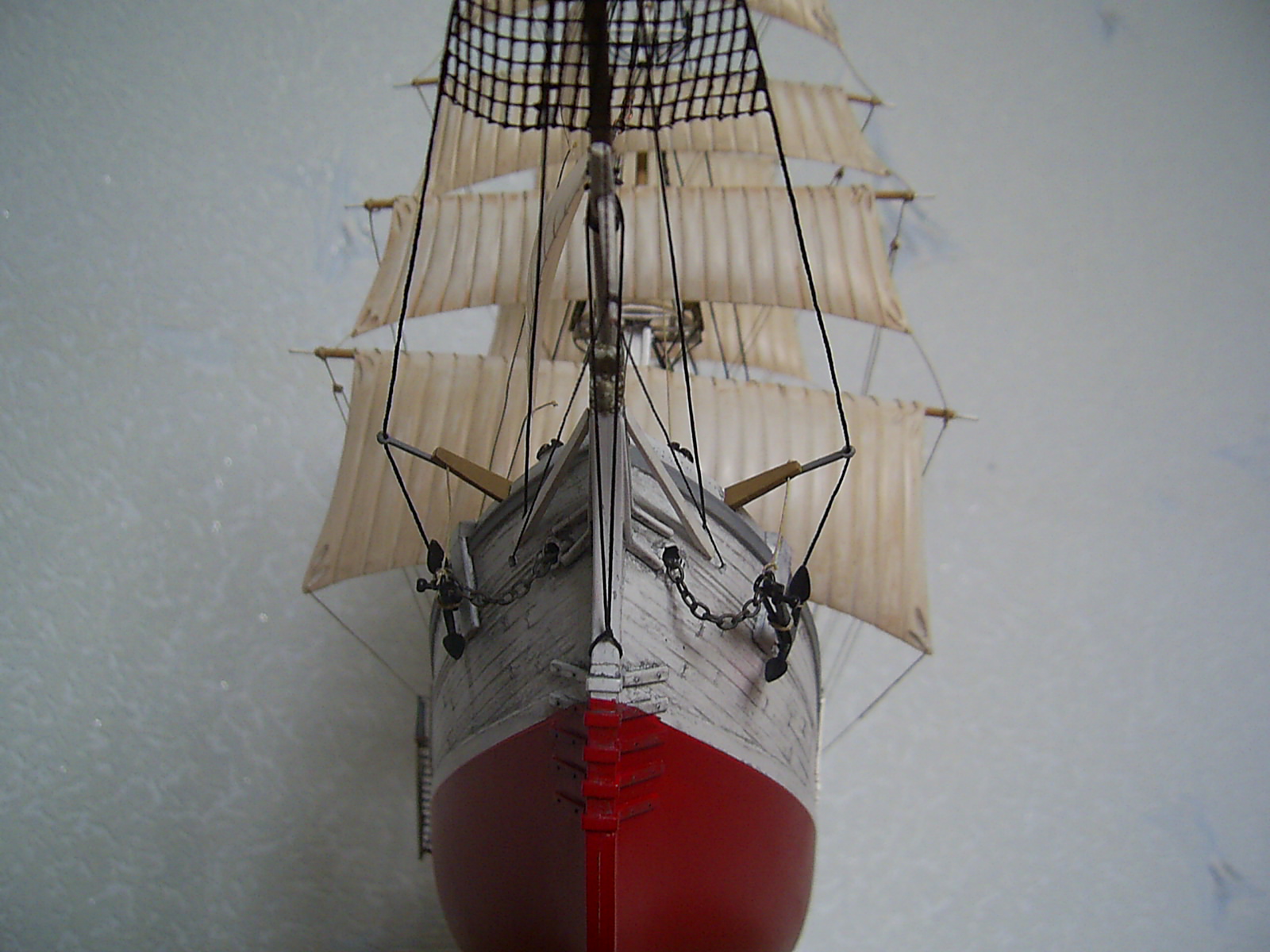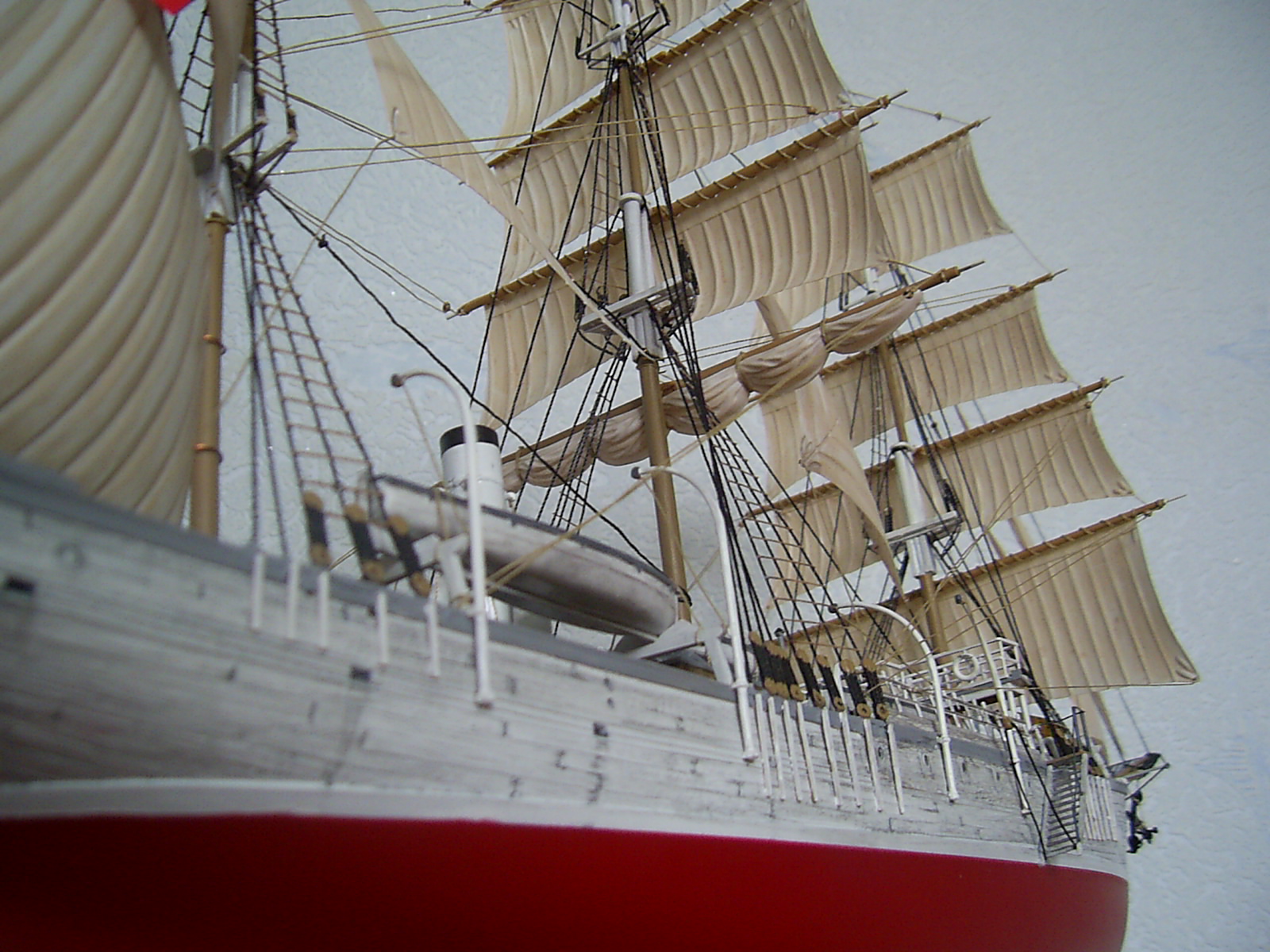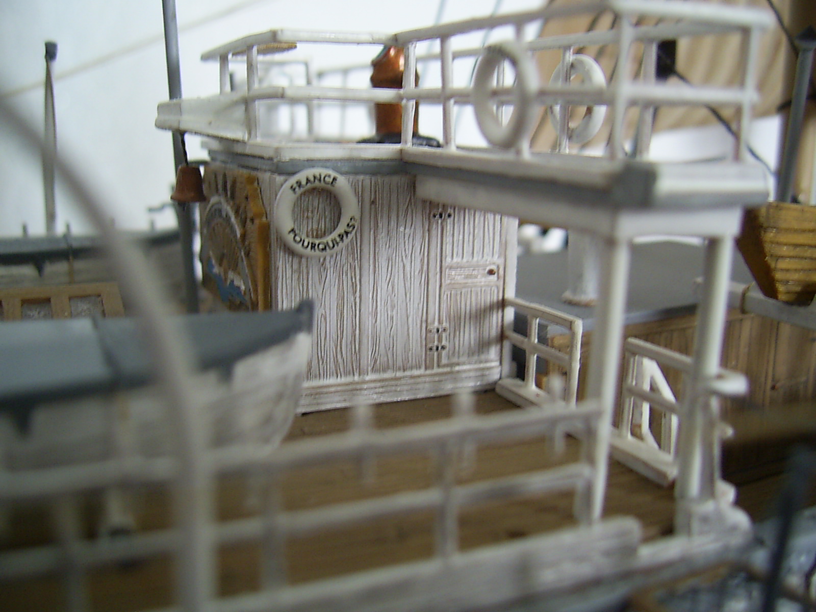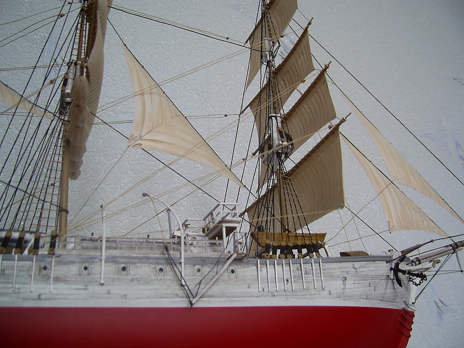Что понравилось - вертикальные поверхности: корпус и переборки. "Грязь" на белом фоне очень оживляет и подчеркивает дерево. Палуба все-таки получилась хуже. И паруса просят "мата" - блестят сильно.