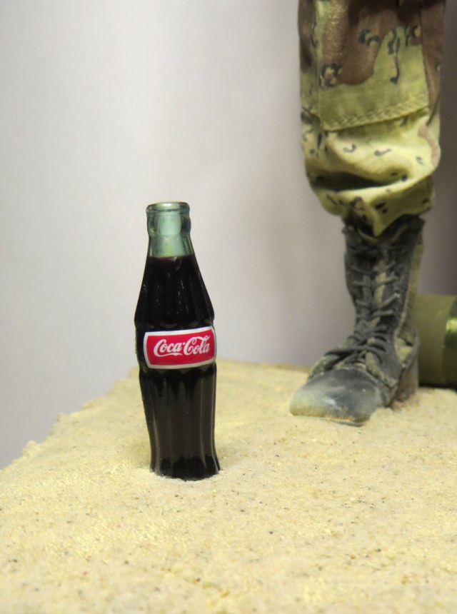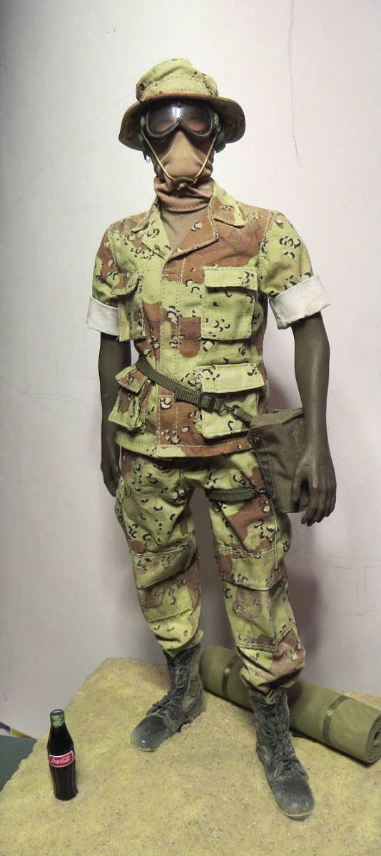 Конверсия фигурки фирмы Soldier Story в масштабе 1/6. Переделкам подвергся мундир с него была спорота подкладка карманов, застежки-липучки и двойной слой ткани с изнанки швов , в результате чего удалось сделать посадку мундира на теле фигурки более реалистичной и утончить сам мундир. Была задумка сделать закатанные рукава . Для этого были переделаны руки фигурки . Суставы на руках и на ногах проклеены супер клеем . Руки слеплены из милипута и доведены шпатлевкой тамия. Кисти взяты от другой фигурки. Рукава обрезаны в половину и закатаны. Обрезка была необходима для более реалистичной толщины ткани закатанных рукавов. Руки и лицо окрашены акрилом. Перекрашены ботинки. После вся одежда была пропитана жидко разведенным ПВА , были сформированы складки. После высыхания одежды она была запылена пигментами МиГ. Основание самодельное грунт изготовлен из мелкого песка с Куршской косы, благо каждое лето у меня есть уйма времени его там пособирать :) Скатка без переделок только немного тонирована акрилом и пигментами. Бутылочка кока-колы привезена из Америки а там в свою очередь была отломана от какой то игрушки :)
