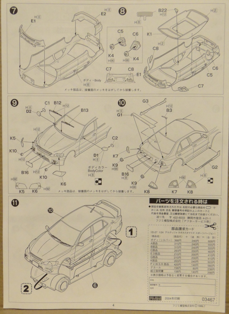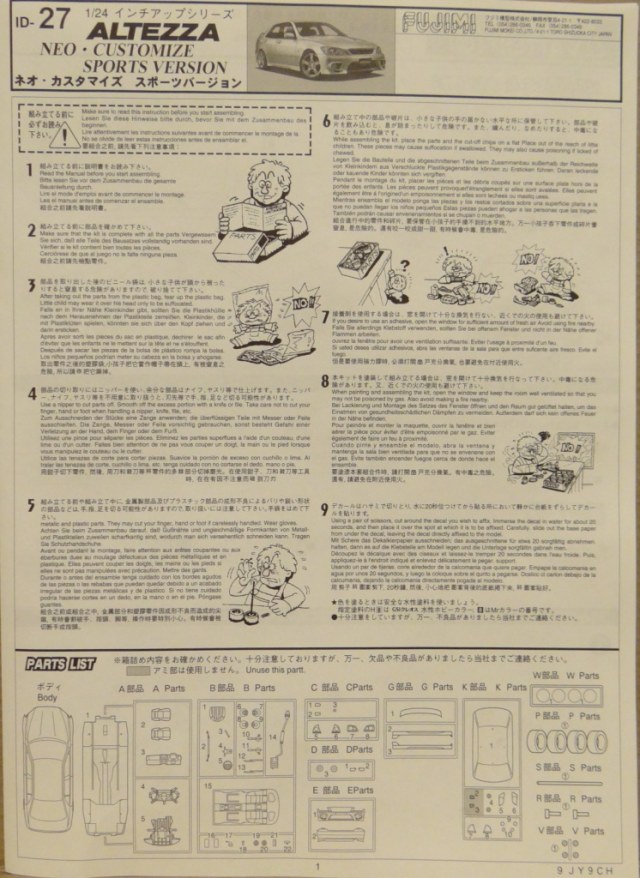Приветствую Вас дорогие Каропчане. Представляю Вашему обзору творение фирмы FUJIMI автомобиль TOYOTA ALTEZZA RS200. В картонной коробке мы имеем инструкцию, небольшую, на одном листе формата А3, салон автомобиля, 5 литников серого цвета, литник прозрачных деталей остекленения, литник хром, листочек декалей, 2 заклёпочки, резиновые втулки и диски с резиной. Честно сказать был очень расстроен данным китом, как-то ожидал от него лучшего. Расстроили меня следующие моменты: