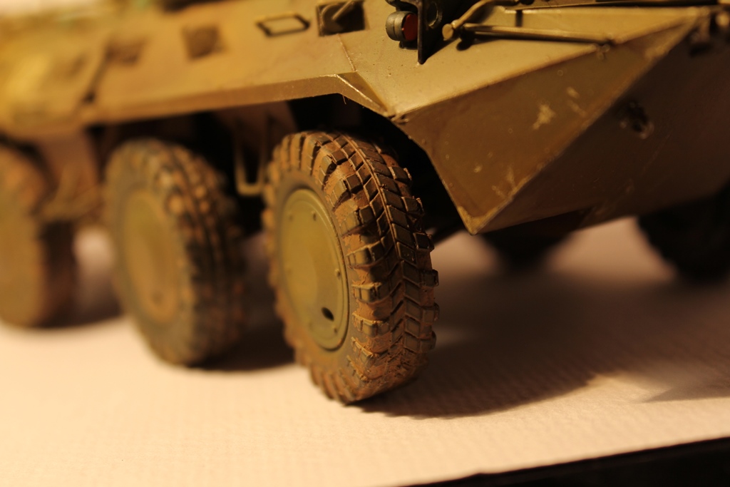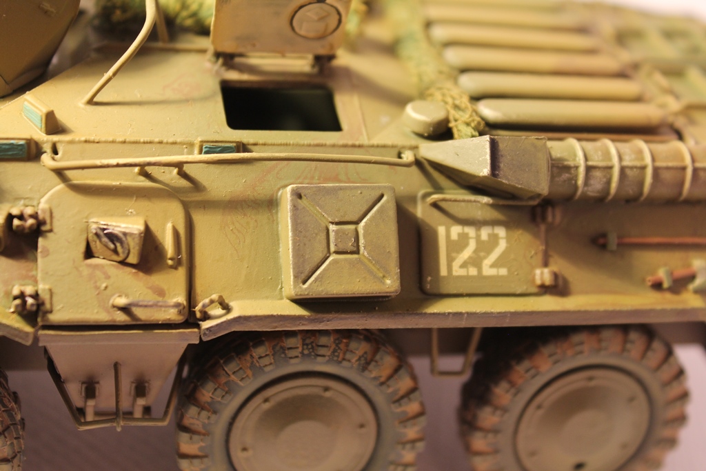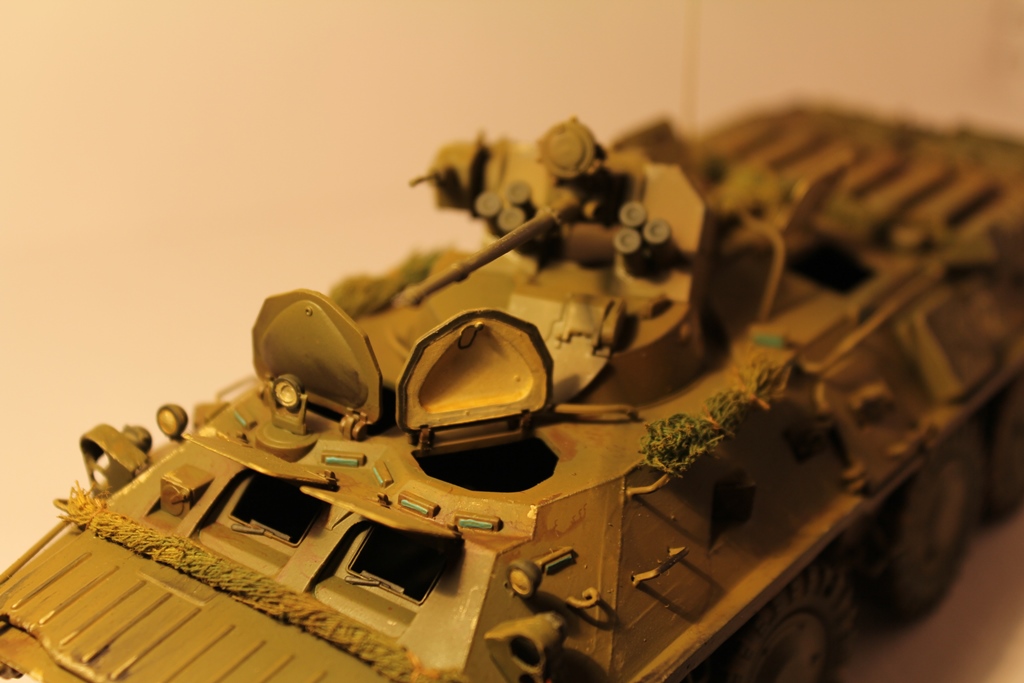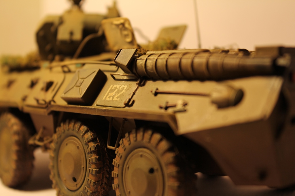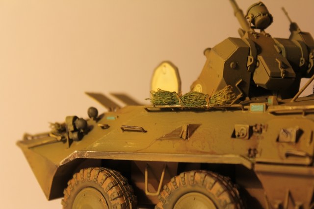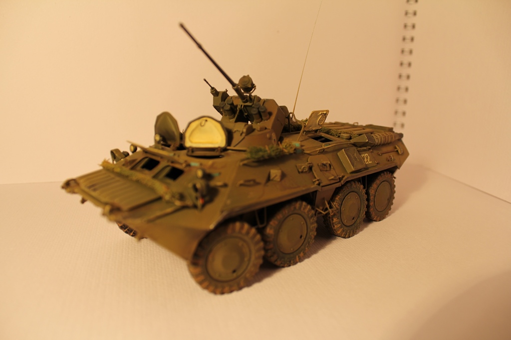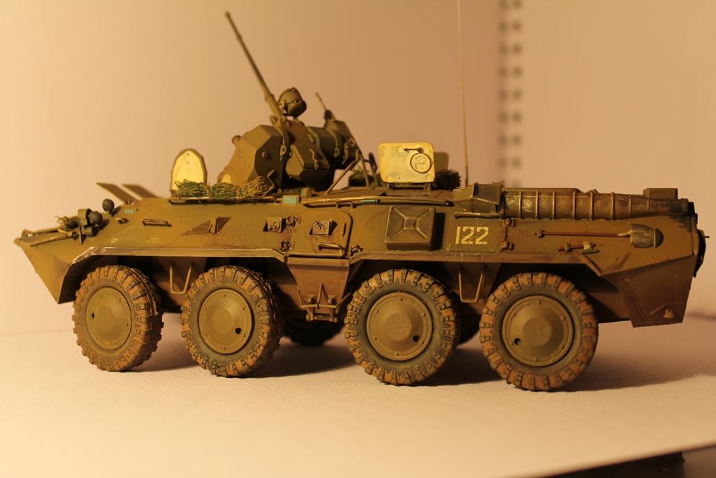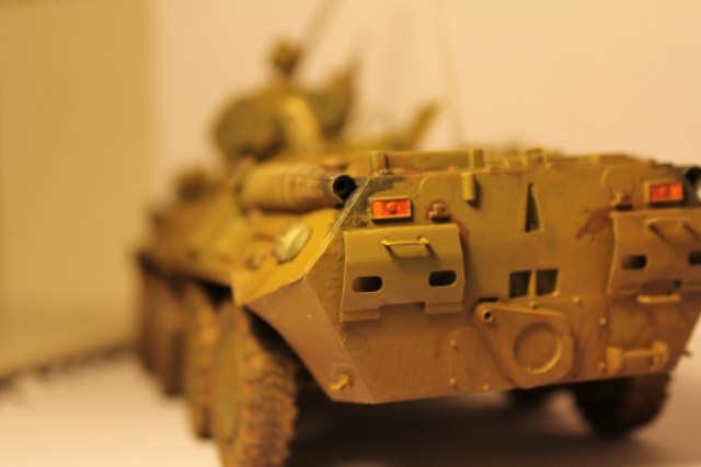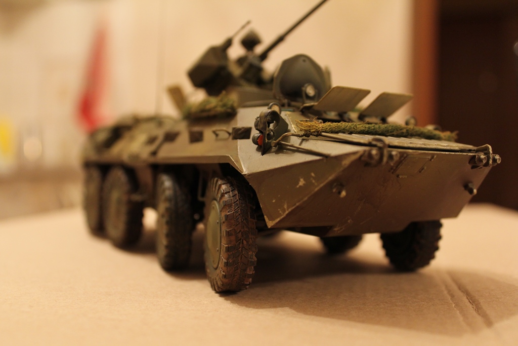 БТР-80 модель выбрана не случайно,давно хотел собрать, модель окрашена акриловыми красками попытка сделать подтеки грязи и имитация пыли, на мой взгляд получились. Маскировочная сетка изготовленна из марли и окрашена акварелью.