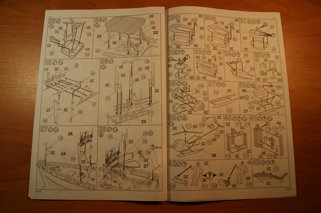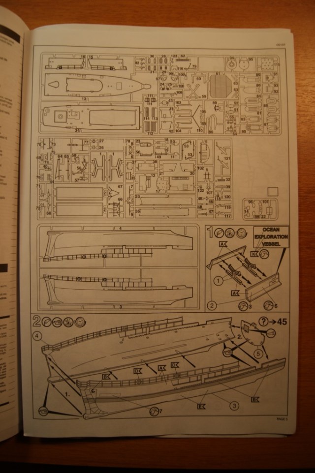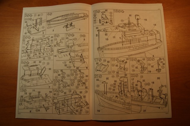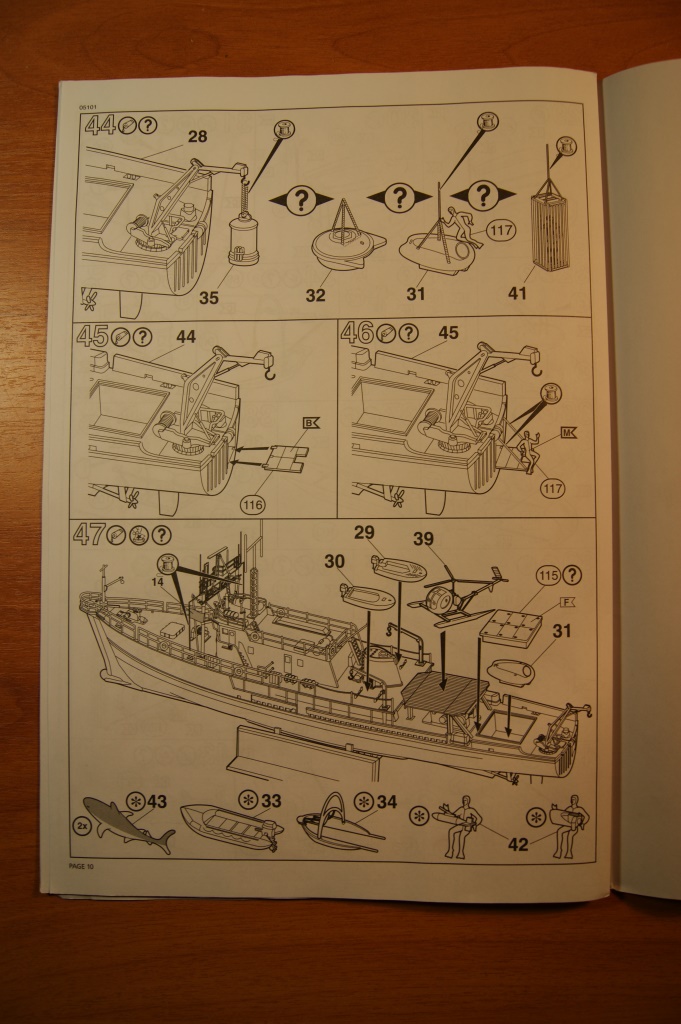 При стройке сверяйтесь по фотографиям и чертежам с прототипом. В течении своей службы "Калипсо" многократно ремонтировался, реконструировался, достраивался. В начале своей карьеры океанографического судна даже палуба была цвета дерево.