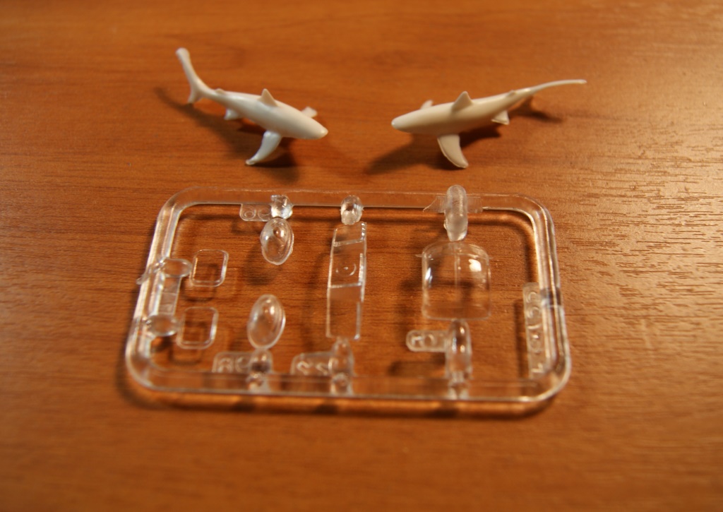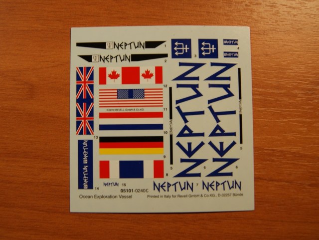 Также присутствует минимальное (на мой взгляд) остекление, две акулы в легкой шубке из облоя (видимо для создания Диарам - в инете видел), декали (не Калипсовские), а на Нептун (как выяснилось в интернете, раньше Revell делал именно Калипсо, но у производителя вышел конфликт с наследниками Кусто в части авторских прав, и теперь на прилавках магазинов мы имеем то, что имеем). Но несмотря на это обводы данного судна сложно с чем либо спутать. Кстати сказать, корпус оригинала (нижняя часть) исполнен из Орегонской сосны.