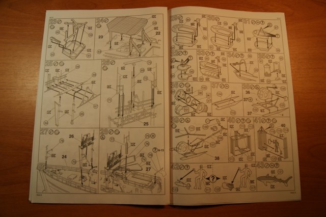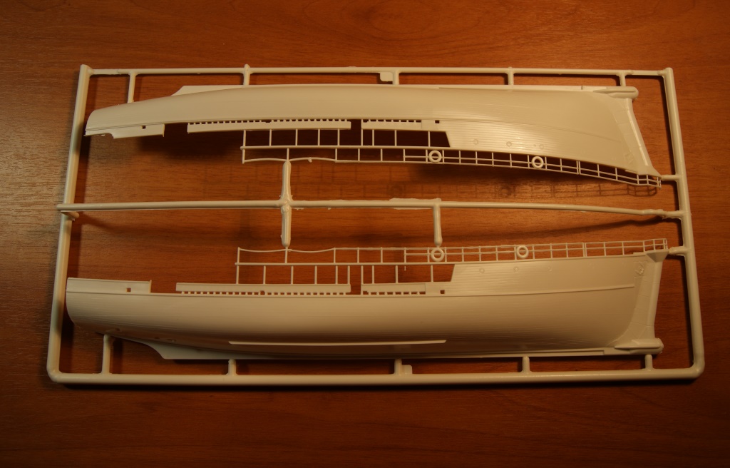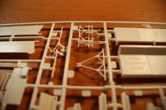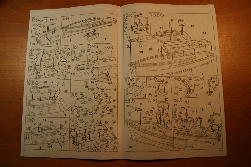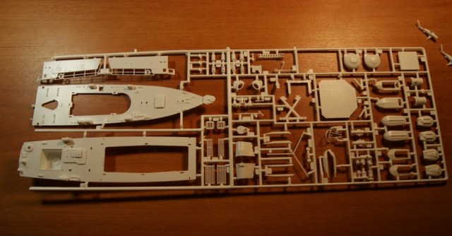 Внутри стандартной, на мой взгляд по дизайну для данного производителя коробки присутствуют три листа с белыми литниками, качество которых оставляет желать лучшего, собирать уже начал, стыковка вроде бы ничего (не огонек все таки), но вот количество облоя по заливкам, особенно на тонких деталях, особенно различные, перила, поручни, краны, лебедки и прочая мелочевка приводят в уныние. Отобрал у жены три разнокалиберные пилки для ногтей, приготовился пилить - и этого будет предостаточно. Как выпиливать облой изнутри рамок перил, окошек и просветов пока представляю с трудом.
