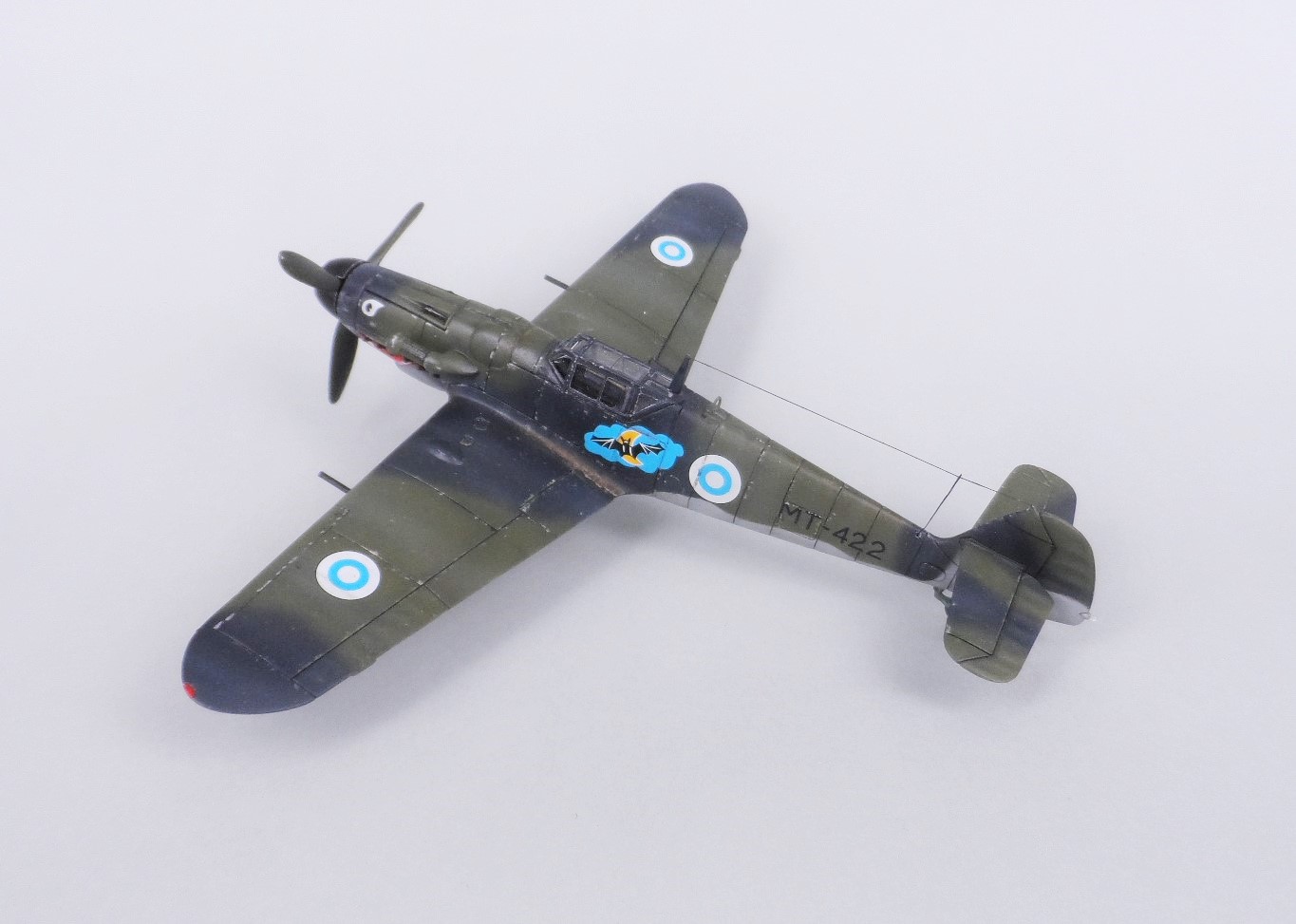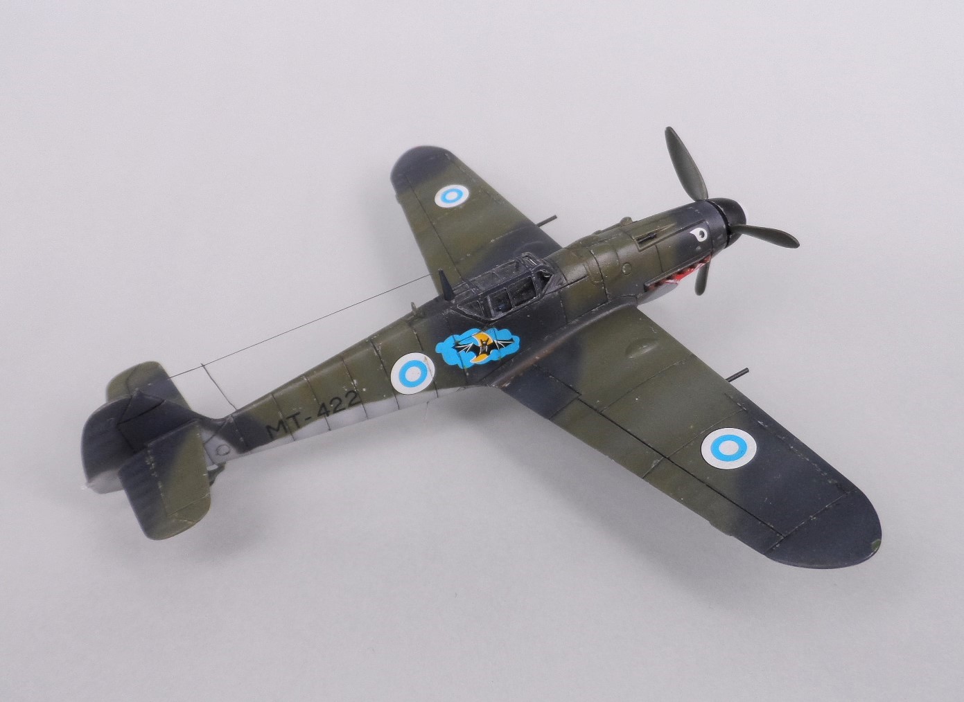 Теперь по вооружению. Как говорил, в силу количества, отследить судьбу «финского» самолёта попроще, чем нашего Ла или Як`а. Есть перечень вооружённых подвесными MG 151/20 109-х, поступивших в Финляндию. МТ-422 в этот перечень не входит, он нёс стандартное вооружение – два пулемёта/пушка. Часть подвесных MG, по желанию пилотов, была снята с истребителей ещё в период боевых действий. После войны были демонтированы всё подвесное вооружение. Кроме того если вы посмотрите фотографии финских 109-х в конце 40-ых – начале 50-ых, то увидите, что на многих истребителях демонтированы и MG 131 – берегли «патроны» и запчасти. По этому МТ-422 с подвесным вооружением красиво, но…. Но есть один нюанс – когда финны вдруг решили сформировать «ночную» эскадрилью МТ-422 был одним из «опытным» образцом для ночной модификации. На них планировали установить оборудование для ночных полётов, посадочную фару, а в качестве вооружения использовать подвесные MG 151/20, убрав вооружение из фюзеляжа. По данным финских историков на одном из предназначеных для эксперемента 109-х были подвешены пустые гондолы, но дальше этого не пошло – вот отсюда скорее всего и рисуют МТ-422 с пастью, мышью и пушками - эффектно выглядит.