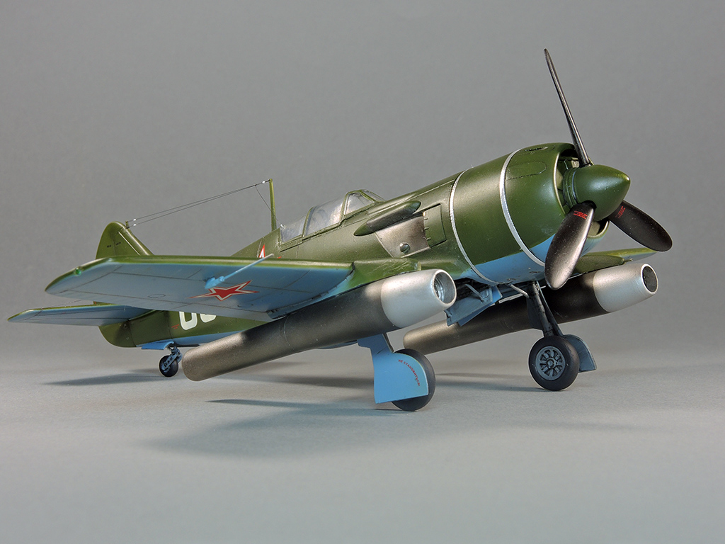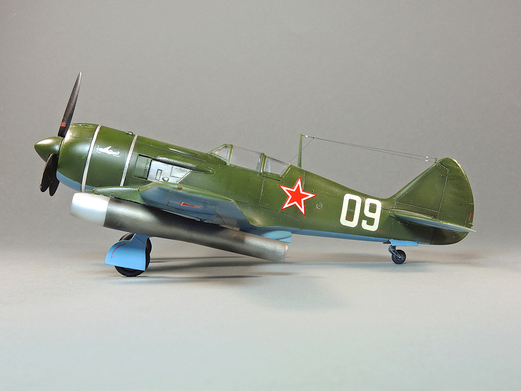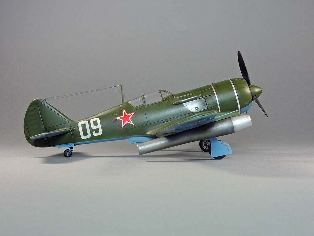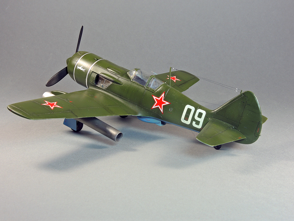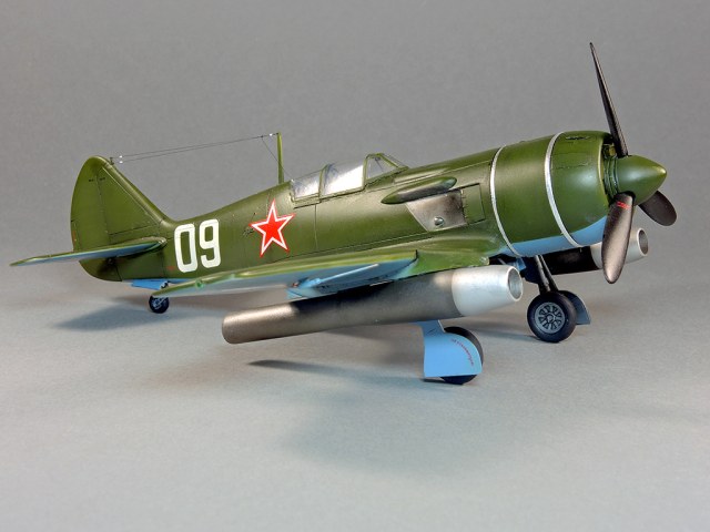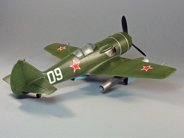 Несколько слов о модели. Модель от украинской фирмы «МикроМир», ЛНД. В целом все неплохо.  За исключением двух моментов. В модели не учтена стыковка ниш шасси с планером.  Образуется ступенька до 5 мм и в итоге ничего не монтируется. Фото прилагается среди обзора модели. И крыло. В наборе, судя по чертежам, крыло для Ла-11. В итоге ниши шасси пришлось грубо переделывать, а крыло адаптировать по чертежам к Ла-9. Было принято решение сделать из серийной машины Ла-9РД. В связи с этим самостоятельно из шариковых ручек изготовлены два РД-13 и пилоны крепления. Немного повозился с ними, особенно с пилонами. Двигатели и собственно вся модель делалась по имеющимся на просторах Интернета фотографиям. Красилась эмалями от Тамии. Лаки тоже от Тамии. Антенны: мачта из деревянной зубочистки, трос из бантика. Декали хорошего качества. Но применены только технические надписи, так как звезды состоят из двух частей. Звезды и номер на модели из запасов. БАНО из зажигалок. Модель не старилась и не пачкалась, исходя из предназначения. Коллаж выполнен моим коллегой из г. Киева Дмитрием (crocо007), за что я ему очень благодарен.