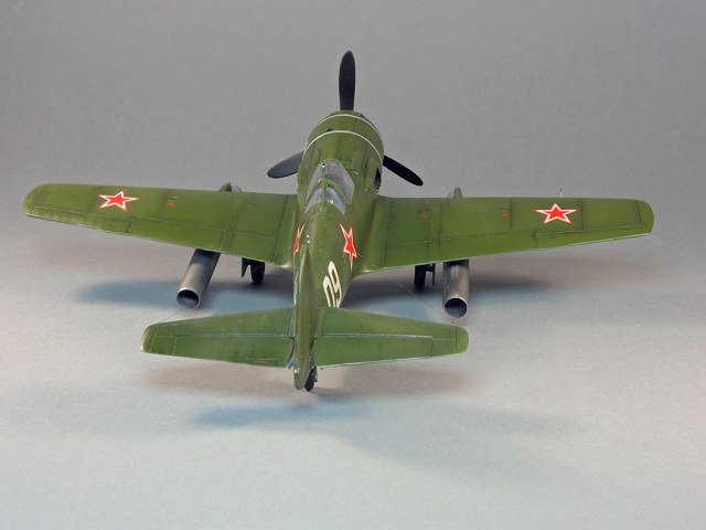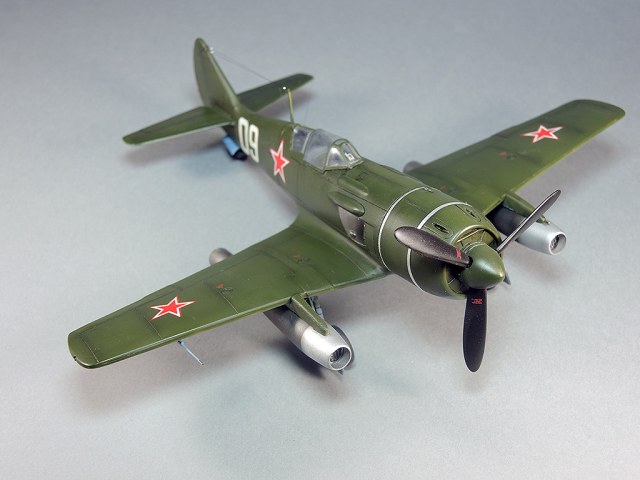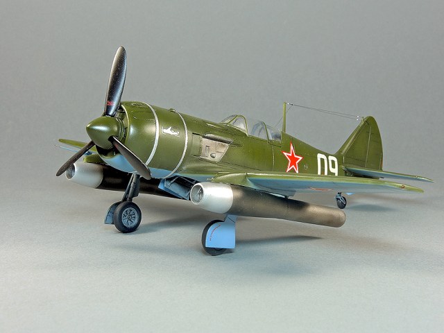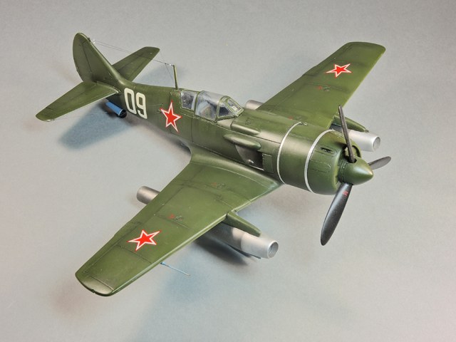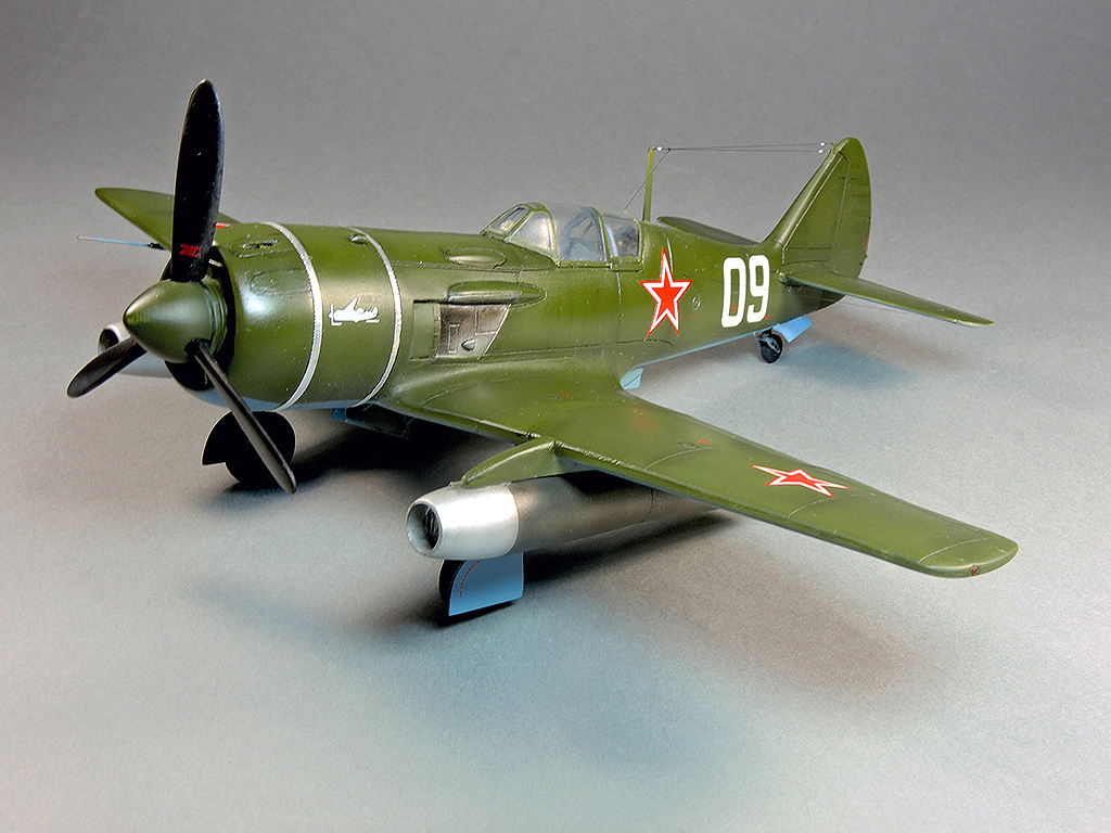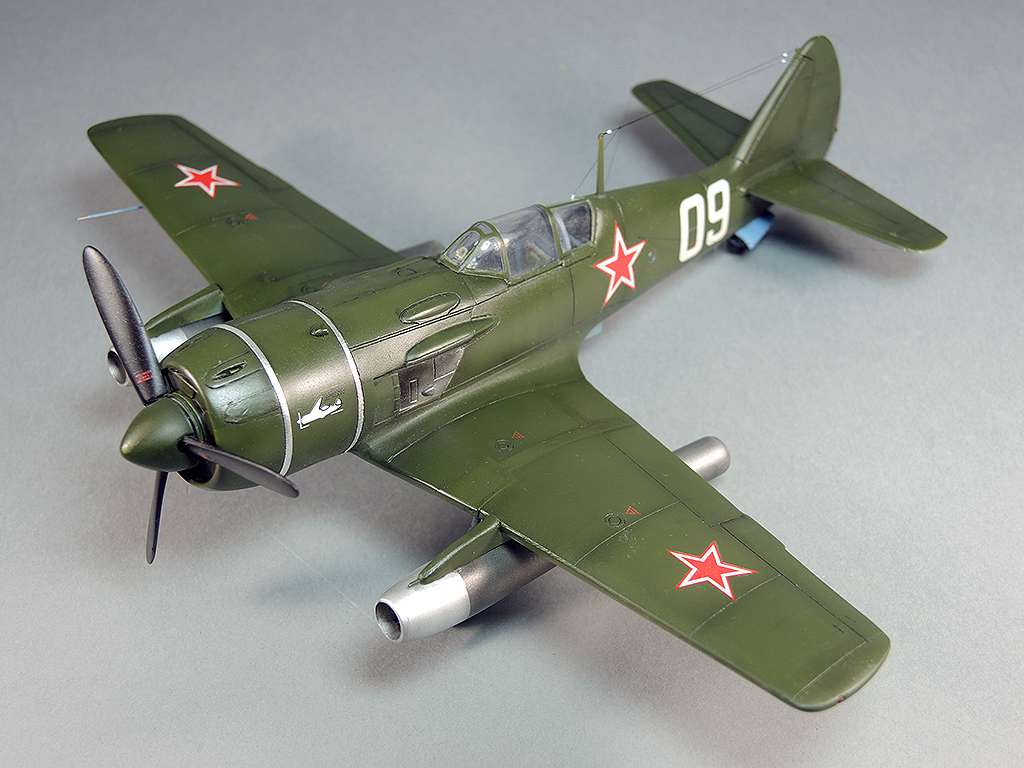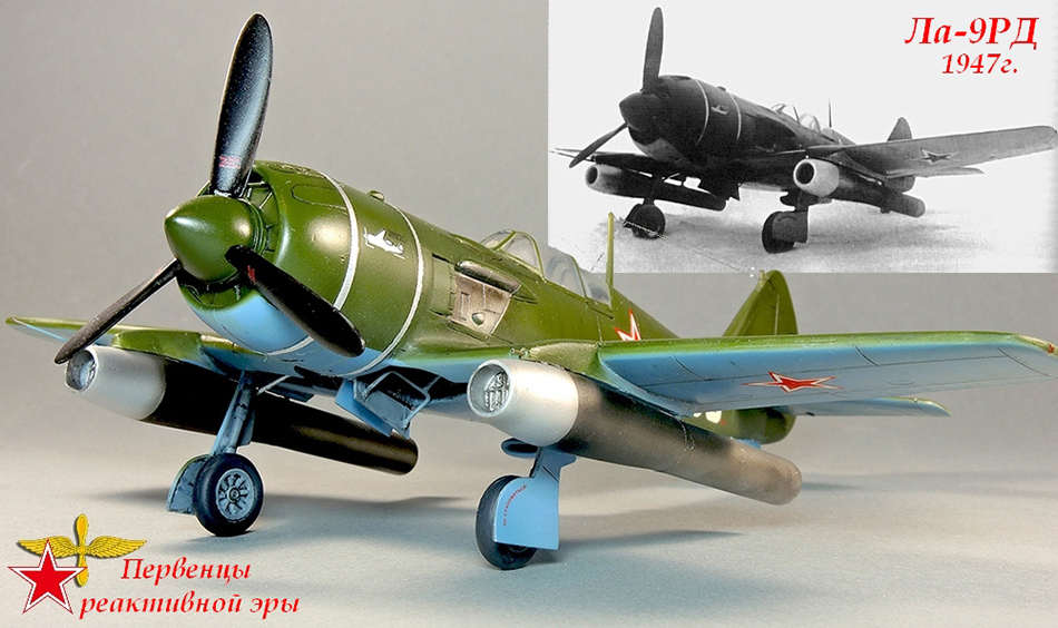 Немного истории. Ла-9 последний поршневой истребитель в СССР. С 21 ноября 1947 г по 13 января 1948 г. проходил госиспытания серийный Ла-9 № 48210509 (Ла-9РД), оснащенный на 51-м заводе двумя автопульсирующими воздушно-реактивными двигателями РД-13 конструкции В.Н.Челомея.. На самолете изменили систему питания топливом, сняли бронеспинку, и две пушки НС-23,усилив конструкцию планера. Прирост скорости составил 70 км/ч. Летчик отмечал сильные вибрации и шум при включении ПуВРД. Подвеска ПуВРД ухудшала маневренные и взлетно-посадочные характеристики самолета. Запуск двигателей был ненадежным, резко снижалась продолжительность полета, усложнялась эксплуатация. Проведенные работы принесли пользу лишь при отработке прямоточных двигателей, предназначавшихся для установки на крылатые ракеты. Самолеты участвовали в воздушных парадах и неизменно своим грохотом производили сильное впечатление на публику. По свидетельству очевидцев в разных парадах участвовало от трех до девяти машин с ПуВРД.