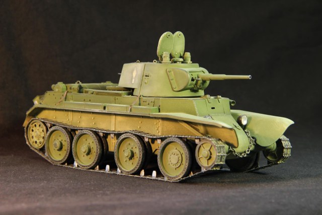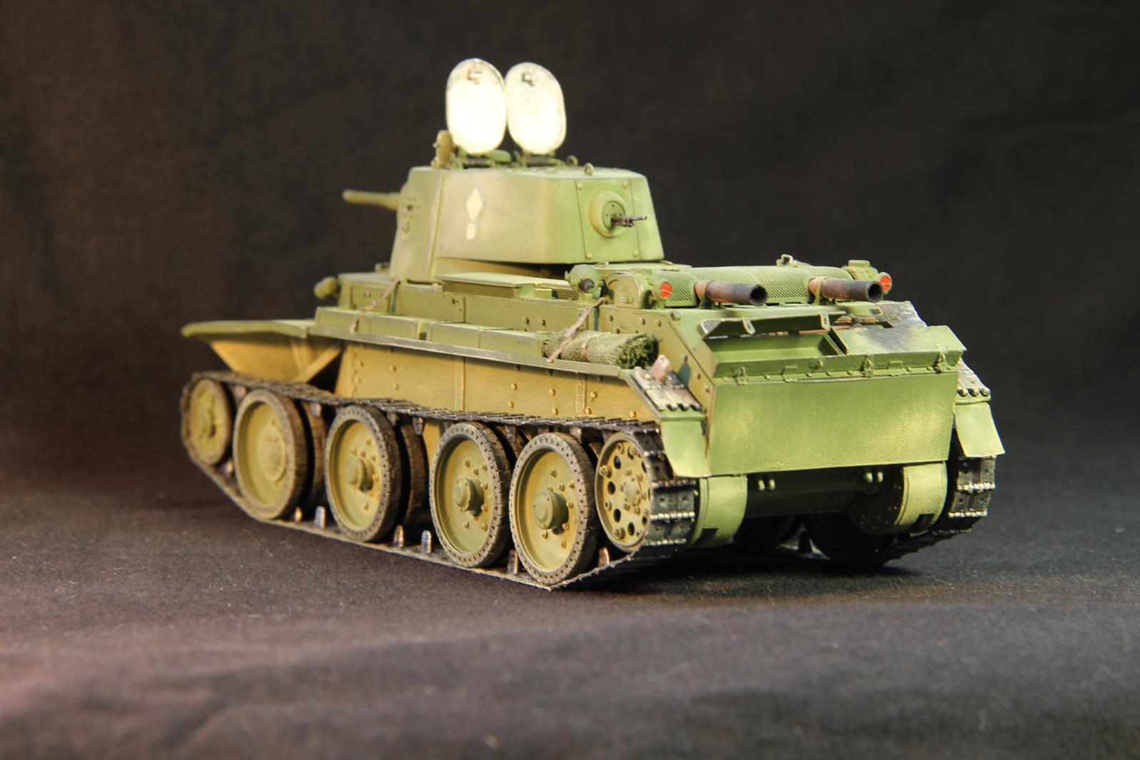 Сделано красиво, особенно мне понравилось 15е фото. Но куча ошибок в матчасти (если интересно то напишу, что именно), ошибка в декали - с таким ОЗ бегали БТ-7М управления 53го ТП 81й Калужской МД. Но самое обидное, что Ваш танк никуда не поедет. Ведущее колесо ранее, с 4мя шпильками под широкий трак, а гуси узкие, под ведушее с 6ю шпильками. ((