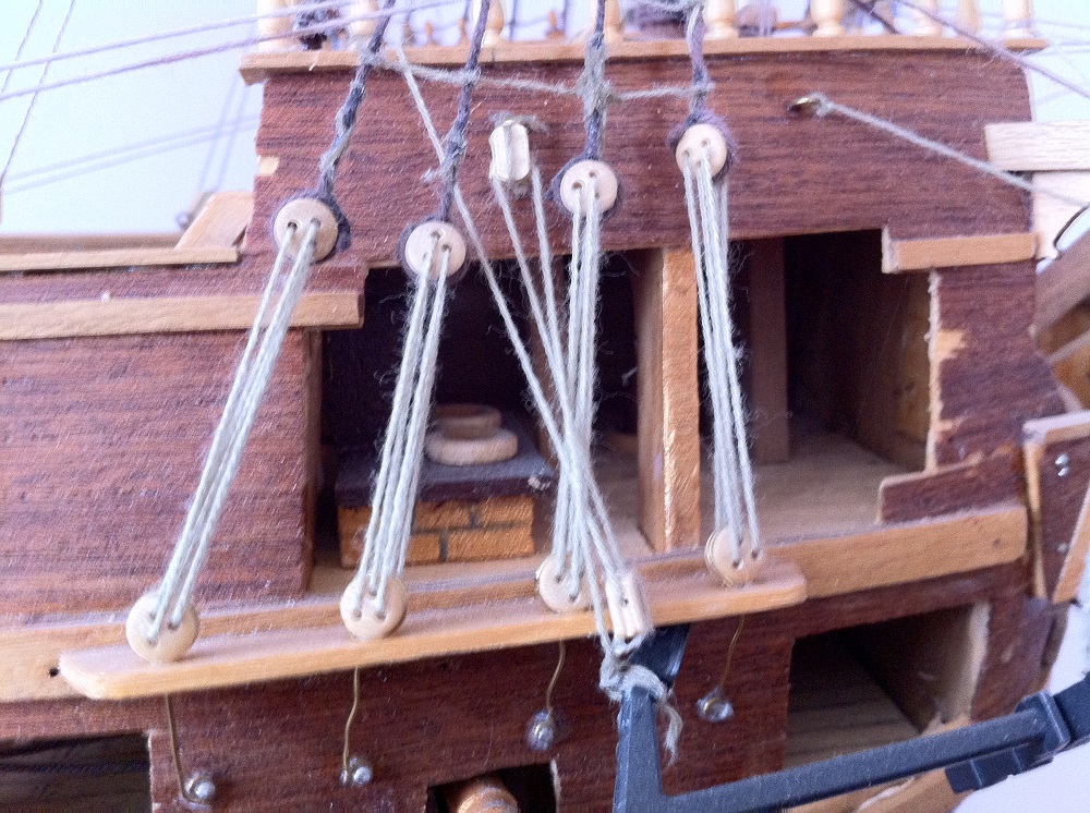 на будущее канаты можно или акрилом пройтись жидким или просто протянуть по свече восковой-не будет "лохматости". ну и стволы орудий - если стоят пробки-выделить другим цветом.а то все бронза.)