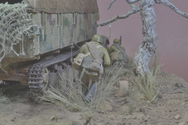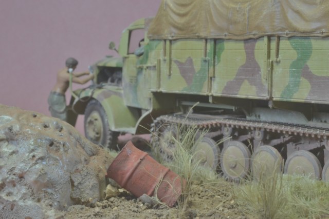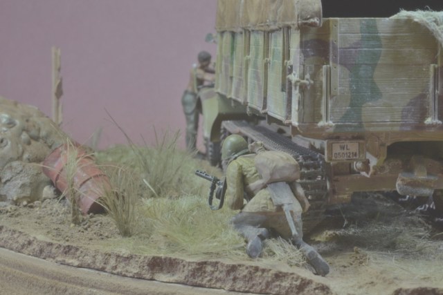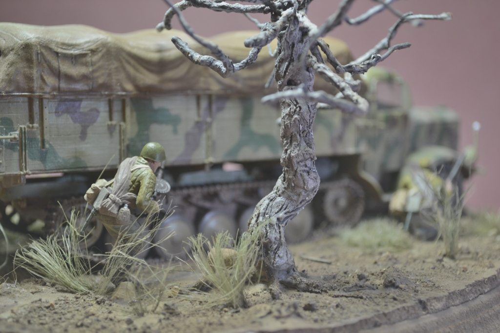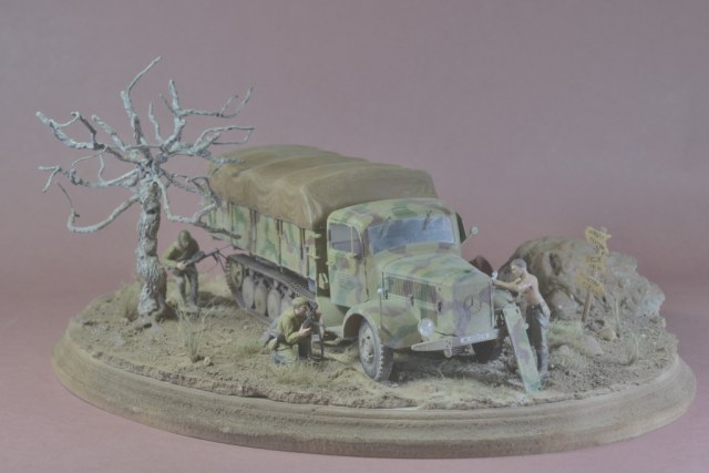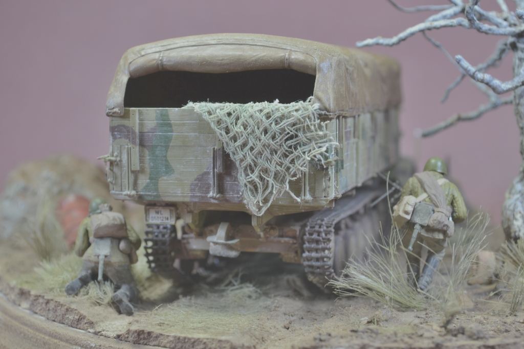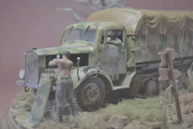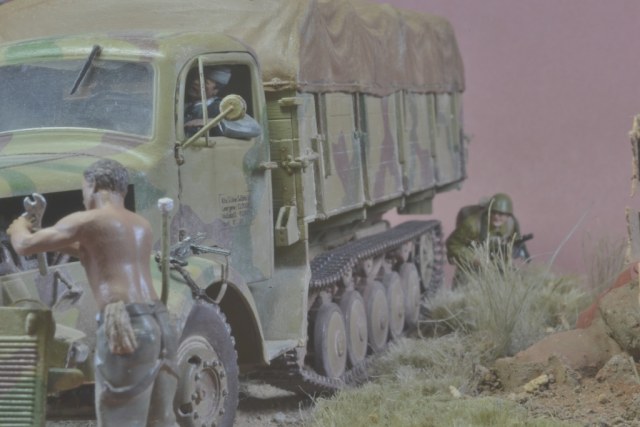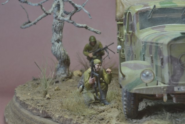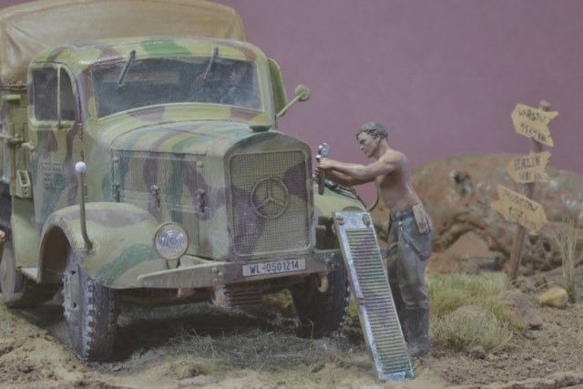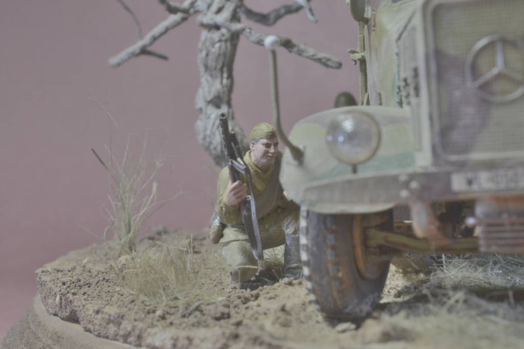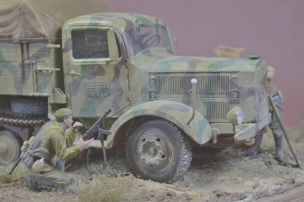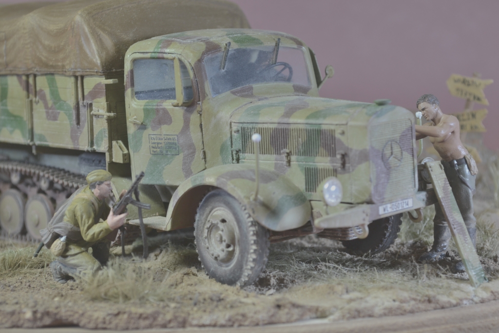 Да уж,закаленный фашист.И зачем водителю напарник?Дальнобойщиков насмотрелись?В автомобиле есть старший машины.Прежде чем задумывать диораму,надо хотя бы ознакомиться с какими-либо документами техники,сопоставить время ее выпуска,театр военных действий и камуфляж на тот момент,который Вы хотите показать в своей работе.У Вас получился полнейший сумбур!Ватник?Да хрен с ним.Ну нет другого.Рожок?А,лаадно!То,что маультиров (тем более в таком камуфляже)и в помине не было,когда немцы были так близко от Москвы,тоже прокатит.Убрали тогда бы указатели и закаленного немца.И как говориться-учите матчасть.С уважением.
