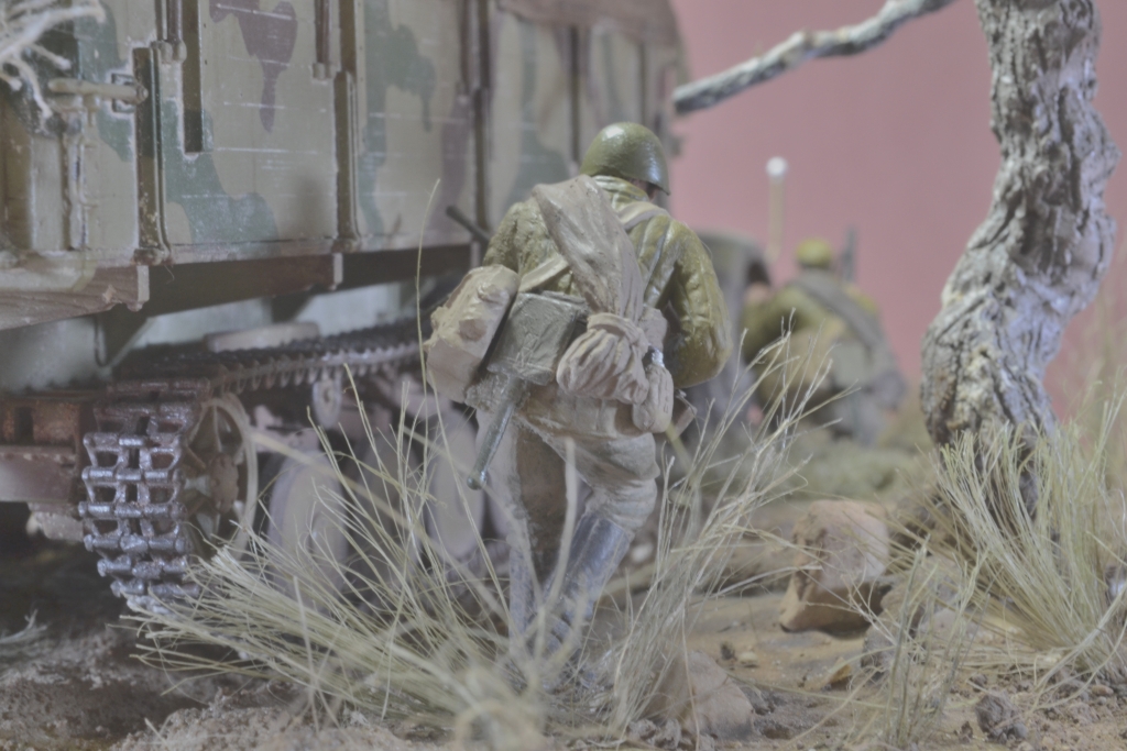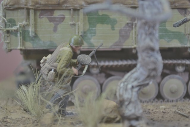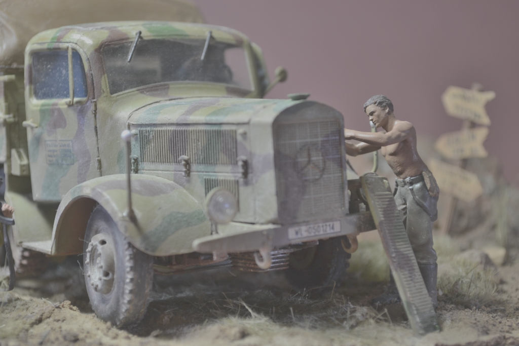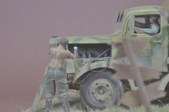 Придирки отразят только мой субъективный взгляд: Запылено все сверх меры (либо это просто бытовая запыленность, а не пигменты). Сюжет притянут, но интересен. И на счет зеленой базы машины сомневаюсь, не встречал такого нигде, ни на фото, ни на работах коллег. Фигурки блестят, механик приехал из Египта, где отдыхал месяца два, оллинкулюзив