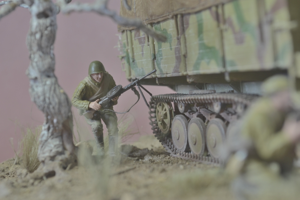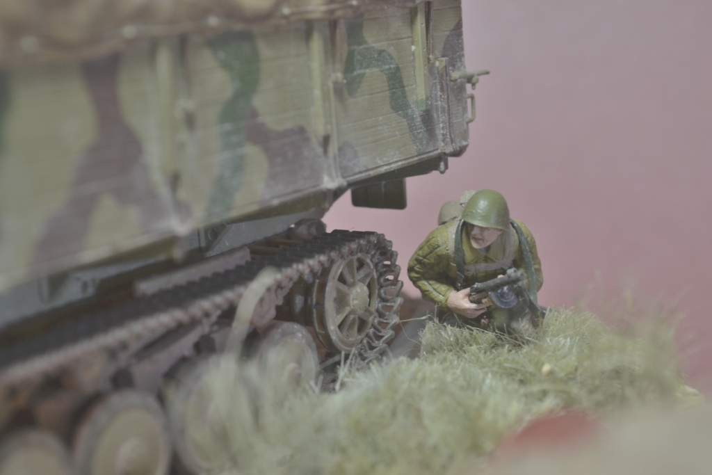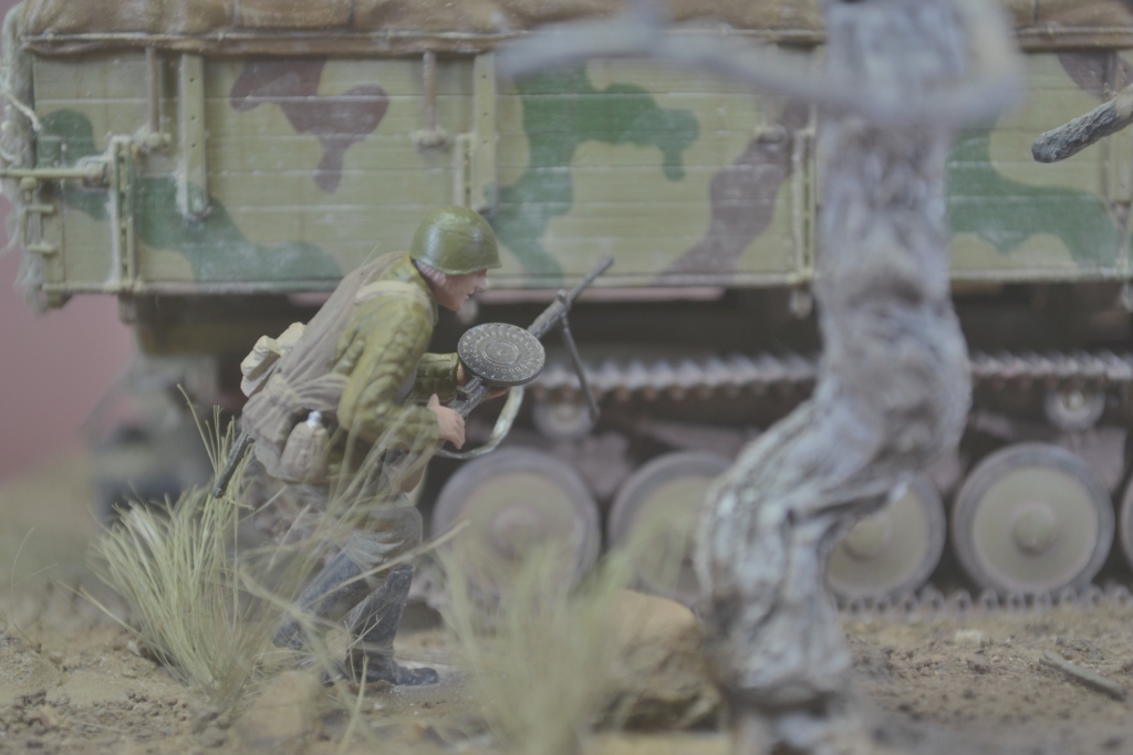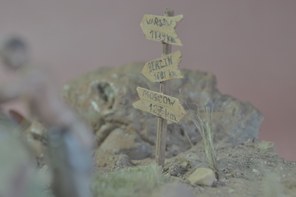 Да, Олег, в глаза сразу бросился рожковый магазин на ППШ, который начал поступать в войска только в 1942 году, и то сначала очень маленькими партиями. А если на указателе значится, что до Москвы 127 км, то это осень 41-го года. Другое, что явно в глаза не бросается - стараюсь не замечать. А вообще-то, работа хорошая, аккуратная, зрелищная. По блеску фигур Вы уже совет получили. Присоединюсь. Я тоже вывел для себя формулу: "отсутствие блеска - это отсутствие финального лака". Молодца!!! Удачи в творчестве и новых работ!