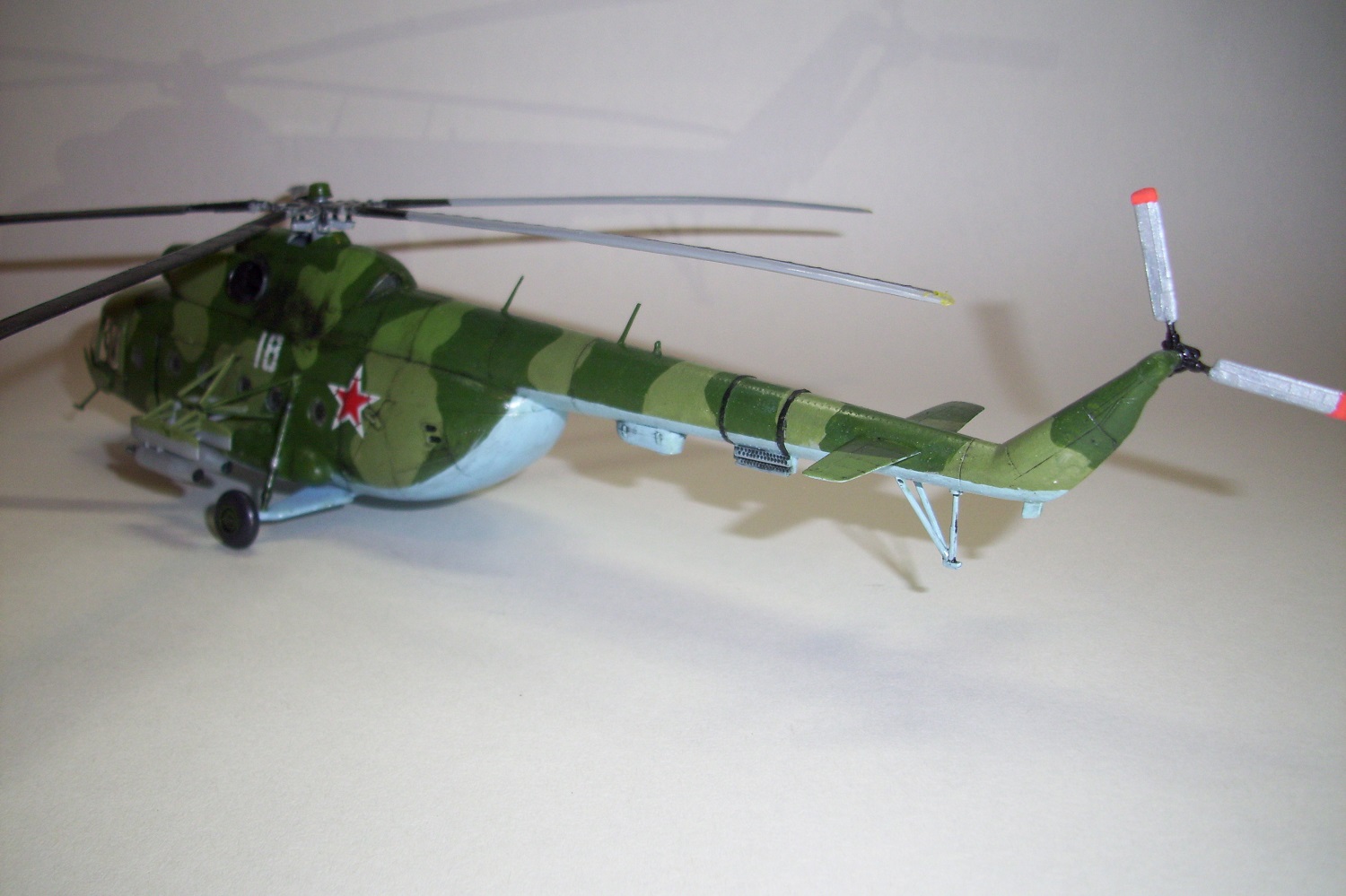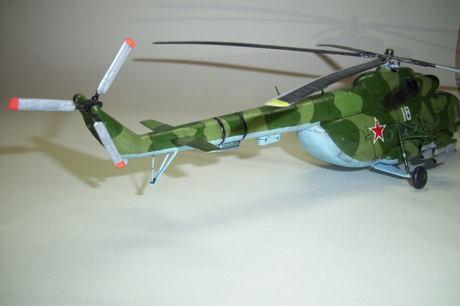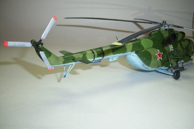 Оно, конечно, хоть и без привязки, но не видел я в своей практике зеленых колпаков токосъемника на втулке несущего винта, увы, только серо-голубые... Цвет лопастей НВ сверху не бьет - обычно сверху лопасти на Ми-8 или серо-зеленые или серо-голубые, но не черные. РВ тоже неаккуратно покрашен, схеме окраски не соответсвует. И блестит избыточно... Плюс распространенная ошибка - ПВД (приемники воздушного давления для указателя воздушной скорости), что торчат на носу кабины, окрашены в зеленый цвет. Они - хромированная сталь, без лакокрасочного покрытия, т.к. в зимнее время или в условиях обледенения надо включать обогрев ПВД, и они нагреваются достаточно ощутимо. Никакая краска, мне кажется, не удержится, слезет... Штанги ПВД, да, могут быть окрашены, а сами ПВД - нет.