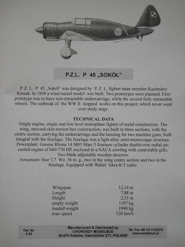 Модель из смолы от фирмы Choroszy Modelbud в масштабе 1/72 (номер по каталогу A82) упакована в картонную коробку. Традиционное для этой фирмы тонкостенное литьё половинок фюзеляжа с обильной деталировкой. Крупные детали отлиты весьма хорошо, часть мелких - лучше изготовить самостоятельно. Местами присутствует облой и пузыри. Ваку-фонарь хорошего качества. Декали даются на не существовавший вариант окраски. Инструкция весьма подробна и наглядна.