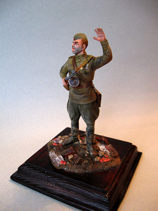 Мы все вынуждены считаться с некоторыми условностями. Из- за масштаба , условной проработке скульптором и т д. Думаете, я не поверил бы, что это фронтовик после боев, если бы вы просто прошлись пигментами, или добавили тонировку в основной цвет на рельефе? У меня тоже подобный эксперимент кончился неудачей , хотя слой грязи в разы тоньше. Выставлю как нибудь, увидите и покритикуете
