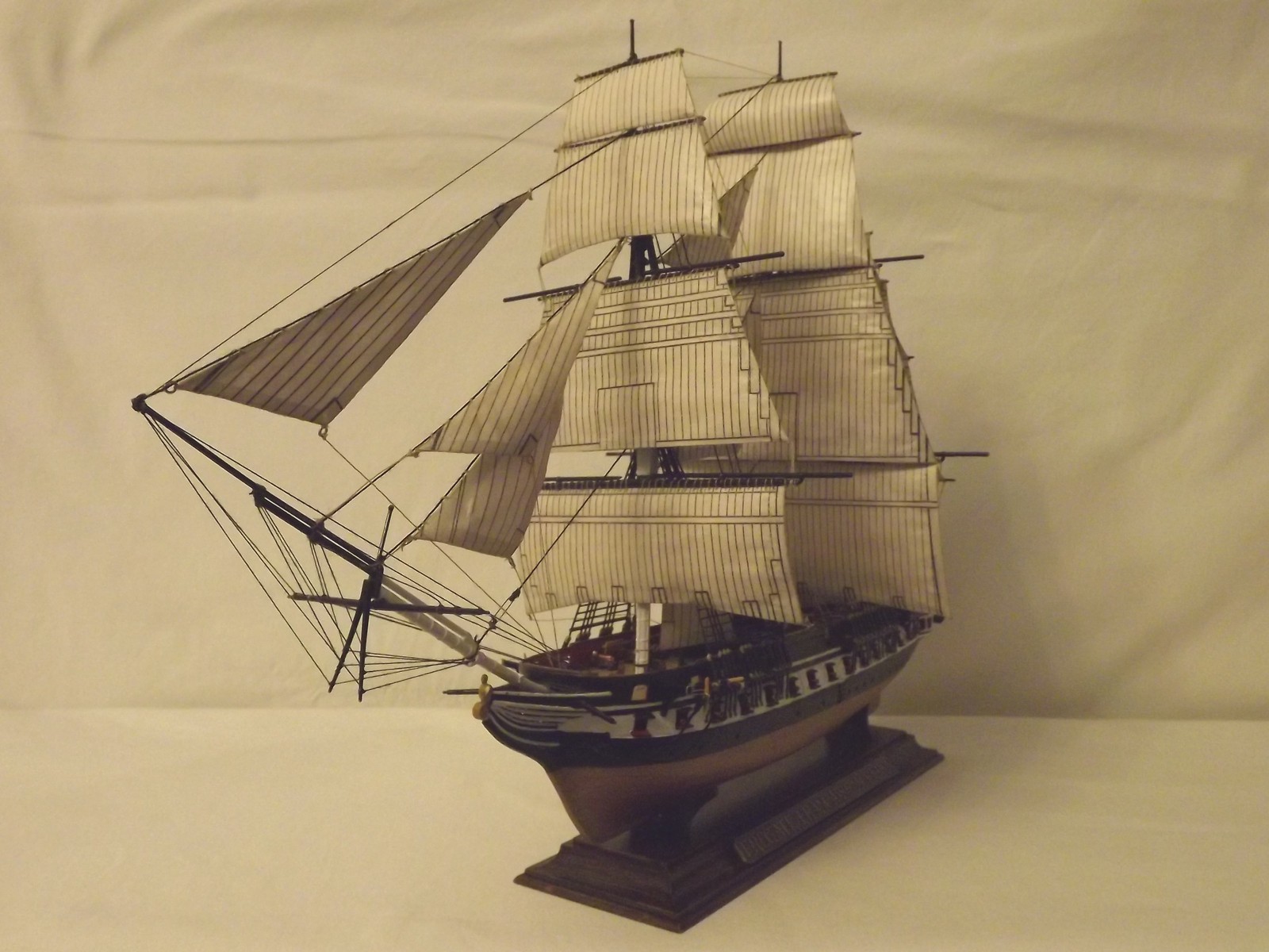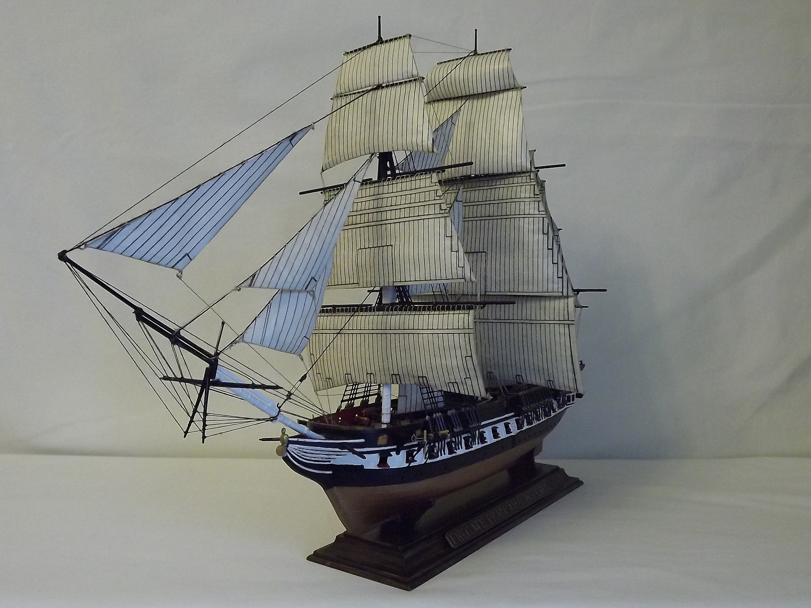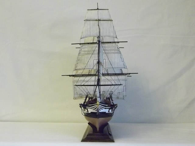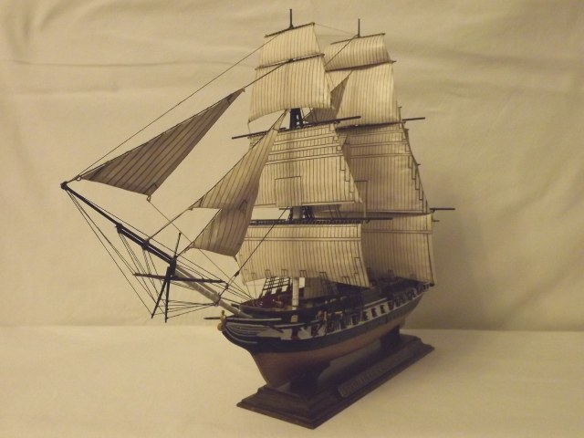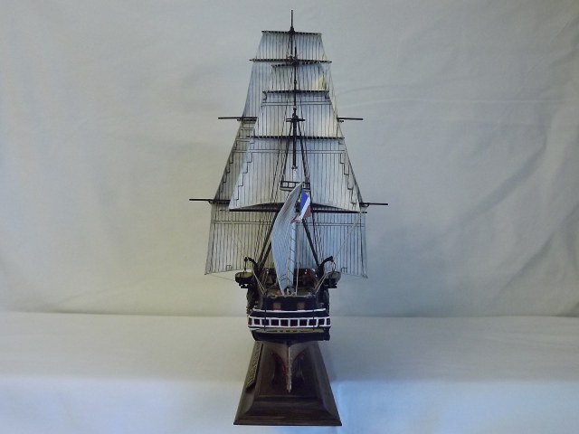 «Когда изготовитель форм замышлял эту модель они, по-моему, скорее всего, ориентировались на один из всемирно известных кораблей (иначе, зачем огород городить). А к тому времени самым известным был, пожалуй, американский фрегат Constitution («Конституция»). Этот старейший военный парусник (спущен на воду в 1797 году) отлично плавает до сих пор. Построенный из белого дуба (очень прочного сорта древесины) с толщиной борта более полуметра он поражал своей крепостью современников. Очевидцы утверждают, что чугунные ядра отскакивали от его бортов, за что фрегат и получил кличку «Старик железный бок». Во время войны с Англией в 1812-15 гг. он неоднократно захватывал и топил британские военные корабли. В его честь была написана поэма. Уже в зрелом возрасте, когда его одногодки догнивали на задворках портов в виде блокшивов, Constitution встречал на своей палубе Папу римского Пия IX, а уж и вовсе перешагнув все мыслимые сроки жизнедеятельности, спокойно перевозил экспонаты на Всемирную выставку в Париже. Таким образом, нынче фрегату «стукнуло» 213 лет. Сейчас корабль стоит у одного из причалов Бостона.