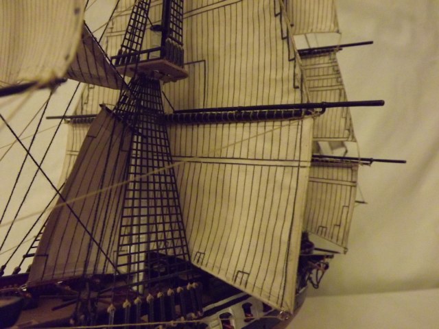 из придирок: качество светлых ниток, на мой взгляд не очень, видна сильная ворсистость ниток на бегущем такелаже на 18-м и 20-м фото, а на остальных вроде не так заметно..... так что не смертельно, учитывая масштаб..... ну и штурвал, хоть и аккуратно покрашен, но мне кажется в цвет не попал немного.....