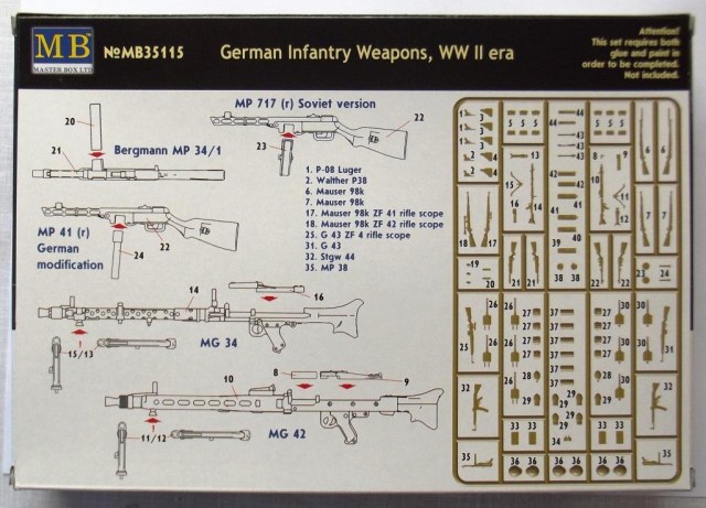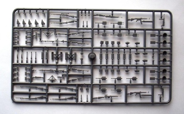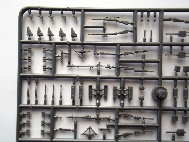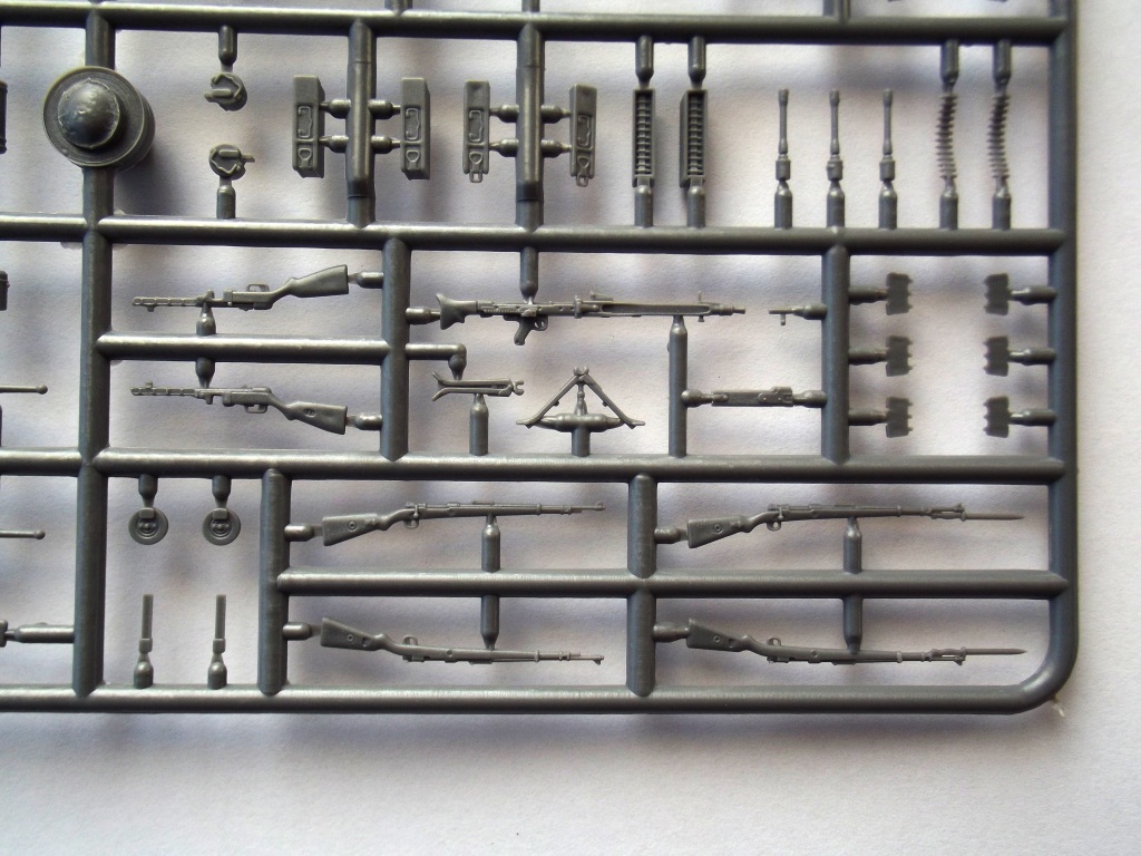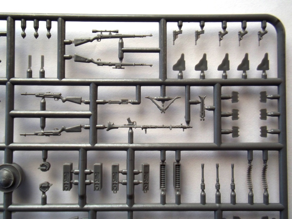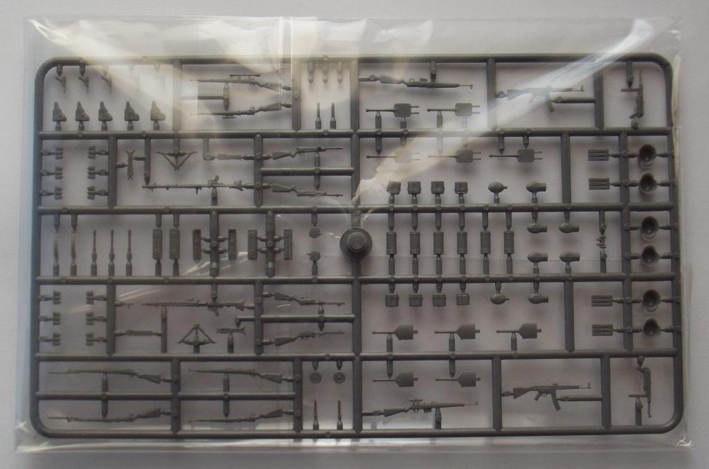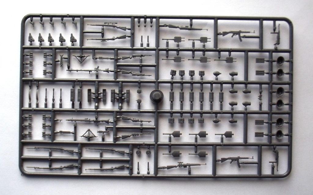 Приветствую вас коллеги. Хочу представить вашему вниманию ещё один обзор оружия и амуниции, на сей раз немецкое второй мировой. И так в коробке из тонкого картона с боковой загрузкой находился один литник серого цвета в целлофановом пакете. Кстати коробка немного великовата (и по толщине и по размерам) для одного небольшого литника. Инструкция есть только на задней части коробки, полностью на английском языке, на ней написано названия (почему то) только оружия, описания окраски отсутствует. О литниках; литник из довольно таки прочного пластика, смещения пресс форм не обнаружено, присутствуют не большие швы на некоторых деталях, облой присутствует только на касках (точнее на козырьках касок). Оружие и амуниция хорошо детализированы, все соответствует периоду второй мировой. Мне только одно непонятно почему в немецком оружии присутствует ППШ (тут он называется MP 717 и MP41) немцы что их тоже производили !? Причем у MP41 магазин как у MP38 с каким то переходником на горловине магазина ! Может они трафейные ППШ так обозначали и переделывали по патроны от MP38 !? Может кто то знает ответ на эти вопросы, буду рад узнать истину ;) Далее; винтовки G-41 и винтовка маузера обр.1898 г. представлены в разных вариантах, обычные (без прицелов), снайперские варианты (с разными прицелами) и с примкнутыми штыками. Пистолеты парабеллум и вальтер хорошо детализированы, единственный минус у вальтера спусковая скоба слиты со спусковым крючком (точнее его вообще нет) и выглядит как какая то заглушка :( Пулемёты MG34 и MG42 представлены тоже в нескольких вариантах, с расправленными сошками и со сложенными, с круглым магазином, с ящиком для пулемётной ленты и с просто с лентой. Так же в наборе присутствуют автомат MP-43, пистолет-пулемёт MP38\40, MP-717, MP-41, MP34, гранаты двух видов М-24 и М-39, фляжки двух видов, котелки, саперная лопата, подсумки под винтовочные магазины и подсумки под магазины к MP, кабуры для пистолетов, шесть касок, противогазные баки, один бинокль. Вот вроде бы и всё. Цена такого набора на момент покупки составляла 470 руб.